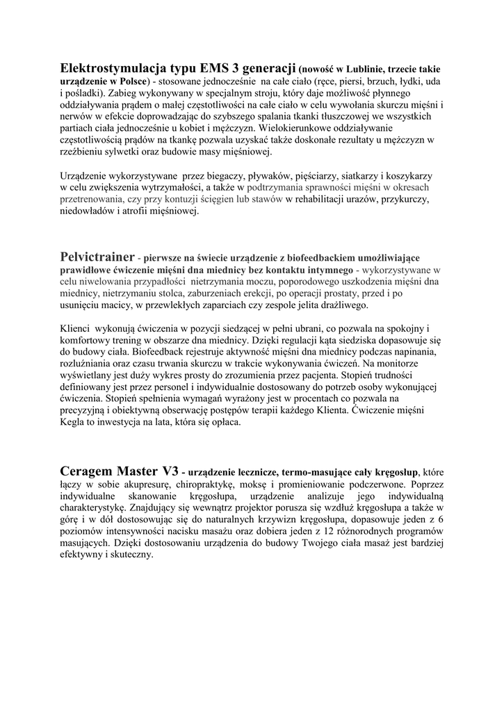 Elektrostymulacja typu EMS 3 generacji (nowość w Lublinie, trzecie takie urządzenie w Polsce) - stosowane jednocześnie na całe ciało (ręce, piersi, brzuch, łydki, uda i pośladki). Zabieg wykonywany w specjalnym stroju, który daje możliwość płynnego oddziaływania prądem o małej częstotliwości na całe ciało w celu wywołania skurczu mięśni i nerwów w efekcie doprowadzając do szybszego spalania tkanki tłuszczowej we wszystkich partiach ciała jednocześnie u kobiet i mężczyzn. Wielokierunkowe oddziaływanie częstotliwością prądów na tkankę pozwala uzyskać także doskonałe rezultaty u mężczyzn w rzeźbieniu sylwetki oraz budowie masy mięśniowej. Urządzenie wykorzystywane przez biegaczy, pływaków, pięściarzy, siatkarzy i koszykarzy w celu zwiększenia wytrzymałości, a także w podtrzymania sprawności mięśni w okresach przetrenowania, czy przy kontuzji ścięgien lub stawów w rehabilitacji urazów, przykurczy, niedowładów i atrofii mięśniowej. Pelvictrainer - pierwsze na świecie urządzenie z biofeedbackiem umożliwiające prawidłowe ćwiczenie mięśni dna miednicy bez kontaktu intymnego - wykorzystywane w celu niwelowania przypadłości nietrzymania moczu, poporodowego uszkodzenia mięśni dna miednicy, nietrzymaniu stolca, zaburzeniach erekcji, po operacji prostaty, przed i po usunięciu macicy, w przewlekłych zaparciach czy zespole jelita drażliwego. Klienci wykonują ćwiczenia w pozycji siedzącej w pełni ubrani, co pozwala na spokojny i komfortowy trening w obszarze dna miednicy. Dzięki regulacji kąta siedziska dopasowuje się do budowy ciała. Biofeedback rejestruje aktywność mięśni dna miednicy podczas napinania, rozluźniania oraz czasu trwania skurczu w trakcie wykonywania ćwiczeń. Na monitorze wyświetlany jest duży wykres prosty do zrozumienia przez pacjenta. Stopień trudności definiowany jest przez personel i indywidualnie dostosowany do potrzeb osoby wykonującej ćwiczenia. Stopień spełnienia wymagań wyrażony jest w procentach co pozwala na precyzyjną i obiektywną obserwację postępów terapii każdego Klienta. Ćwiczenie mięśni Kegla to inwestycja na lata, która się opłaca. Ceragem Master V3 - urządzenie lecznicze, termo-masujące cały kręgosłup, które łączy w sobie akupresurę, chiropraktykę, moksę i promieniowanie podczerwone. Poprzez indywidualne skanowanie kręgosłupa, urządzenie analizuje jego indywidualną charakterystykę. Znajdujący się wewnątrz projektor porusza się wzdłuż kręgosłupa a także w górę i w dół dostosowując się do naturalnych krzywizn kręgosłupa, dopasowuje jeden z 6 poziomów intensywności nacisku masażu oraz dobiera jeden z 12 różnorodnych programów masujących. Dzięki dostosowaniu urządzenia do budowy Twojego ciała masaż jest bardziej efektywny i skuteczny.