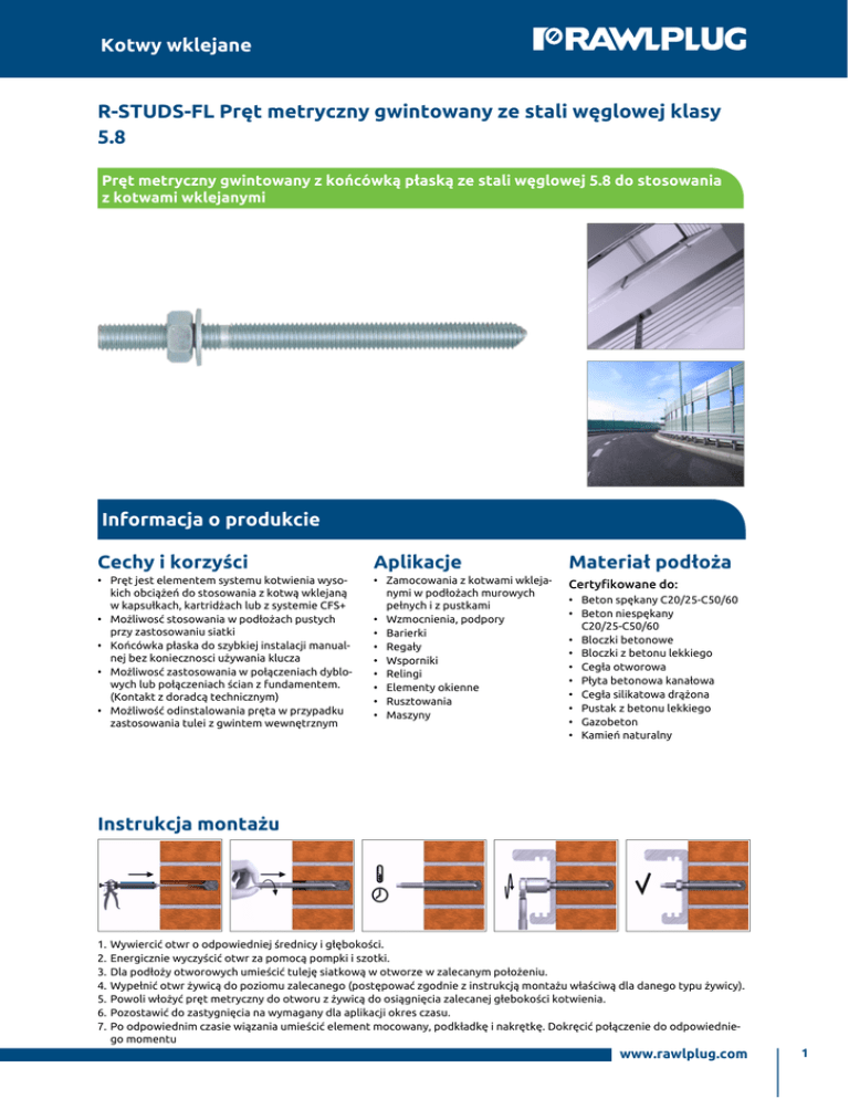 Kotwy wklejane R-STUDS-FL Pręt metryczny gwintowany ze stali węglowej klasy 5.8 Pręt metryczny gwintowany z końcówką płaską ze stali węglowej 5.8 do stosowania z kotwami wklejanymi Informacja o produkcie Cechy i korzyści Aplikacje Materiał podłoża • Pręt jest elementem systemu kotwienia wyso kich obciążeń do stosowania z kotwą wklejaną w kapsułkach, kartridżach lub z systemie CFS+ • Możliwosć stosowania w podłożach pustych przy zastosowaniu siatki • Końcówka płaska do szybkiej instalacji manual nej bez koniecznosci używania klucza • Możliwosć zastosowania w połączeniach dyblo wych lub połączeniach ścian z fundamentem. (Kontakt z doradcą technicznym) • Możliwość odinstalowania pręta w przypadku zastosowania tulei z gwintem wewnętrznym • Zamocowania z kotwami wkleja nymi w podłożach murowych pełnych i z pustkami • Wzmocnienia, podpory • Barierki • Regały • Wsporniki • Relingi • Elementy okienne • Rusztowania • Maszyny Certyfikowane do: • Beton spękany C20/25-C50/60 • Beton niespękany C20/25-C50/60 • Bloczki betonowe • Bloczki z betonu lekkiego • Cegła otworowa • Płyta betonowa kanałowa • Cegła silikatowa drążona • Pustak z betonu lekkiego • Gazobeton • Kamień naturalny Instrukcja montażu 1.Wywiercić otwr o odpowiedniej średnicy i głębokości. 2.Energicznie wyczyścić otwr za pomocą pompki i szotki. 3.Dla podłoży otworowych umieścić tuleję siatkową w otworze w zalecanym położeniu. 4.Wypełnić otwr żywicą do poziomu zalecanego (postępować zgodnie z instrukcją montażu właściwą dla danego typu żywicy). 5.Powoli włożyć pręt metryczny do otworu z żywicą do osiągnięcia zalecanej głebokości kotwienia. 6.Pozostawić do zastygnięcia na wymagany dla aplikacji okres czasu. 7.Po odpowiednim czasie wiązania umieścić element mocowany, podkładkę i nakrętkę. Dokręcić połączenie do odpowiednie go momentu www.rawlplug.com 1 Kotwy wklejane Informacja o produkcie Kotwa Rozmiar Produkt M8 M10 M12 Element mocowany Średnica Długość d L tfix, min tfix, s Średnica otworu Max grubość tfix, max df tfix Max grubość [mm] [mm] [mm] [mm] [mm] [mm] [mm] R-STUDS-12220-FL 12 220 125 95 60 14 110 R-STUDS-12260-FL 12 260 165 135 100 14 150 R-STUDS-16190-FL 16 190 71 46 0 18 66 R-STUDS-16220-FL 16 220 101 76 11 18 96 R-STUDS-16260-FL 16 260 141 116 51 18 136 R-STUDS-20260-FL 20 260 117 67 0 22 - R-STUDS-20300-FL 20 300 157 107 37 22 - R-STUDS-20350-FL 20 350 207 157 87 22 - R-STUDS-24300-FL 24 300 132 62 0 26 - R-STUDS-30380-FL 30 380 181 76 0 32 - R-STUDS-08110-FL 8 110 40 20 0 9 20 R-STUDS-08160-FL 8 160 90 70 50 9 70 R-STUDS-10130-FL 10 130 48 28 0 12 33 R-STUDS-10170-FL 10 170 88 68 38 12 73 R-STUDS-12160-FL 12 160 65 35 0 14 50 R-STUDS-12190-FL 12 190 95 65 30 14 80 Dane logistyczne Kotwa Roz miar M8 M10 M12 Produkt Ilość [szt] Opakowa Opakowa nie jednost nie zbiorcze kowe Waga [kg] Opakowa Opakowa nie jednost nie zbiorcze kowe Kody ean Średnica [mm] Długość [mm] R-STUDS-12220-FL 12 220 10 120 3200 1.79 21.5 604.1 5906675261706 R-STUDS-12260-FL 12 260 10 10 1100 2.1 2.1 259.7 5906675260396 R-STUDS-16190-FL 16 190 10 60 3840 2.9 17.2 1127.5 5010445001550 R-STUDS-16220-FL 16 220 10 10 1920 3.3 3.3 660.3 5906675260402 R-STUDS-16260-FL 16 260 10 10 1920 3.8 3.8 759.6 5906675260419 R-STUDS-20260-FL 20 260 6 36 1728 3.6 21.5 1062.5 5010445001598 R-STUDS-20300-FL 20 300 5 30 1040 3.4 20.6 744.0 5906675262468 R-STUDS-20350-FL 20 350 10 10 960 8.1 8.1 802.8 5906675234793 R-STUDS-24300-FL 24 300 1 1 770 0.97 0.97 779.2 5906675240794 R-STUDS-30380-FL 30 380 1 1 500 1.94 1.94 999.0 5906675234816 R-STUDS-08110-FL 8 110 10 10 4200 0.43 0.43 209.8 5010445001468 R-STUDS-08160-FL 8 160 10 10 7040 0.43 0.43 332.7 5906675260372 R-STUDS-10130-FL 10 130 10 250 9000 0.77 19.3 725.7 5010445001482 R-STUDS-10170-FL 10 170 10 10 3780 1.01 1.01 412.5 5906675260389 R-STUDS-12160-FL 12 160 10 100 7200 1.35 13.5 1001.3 5010445001512 R-STUDS-12190-FL 12 190 10 120 5760 1.56 18.7 929.1 5906675262338 Paleta Paleta www.rawlplug.com 2
