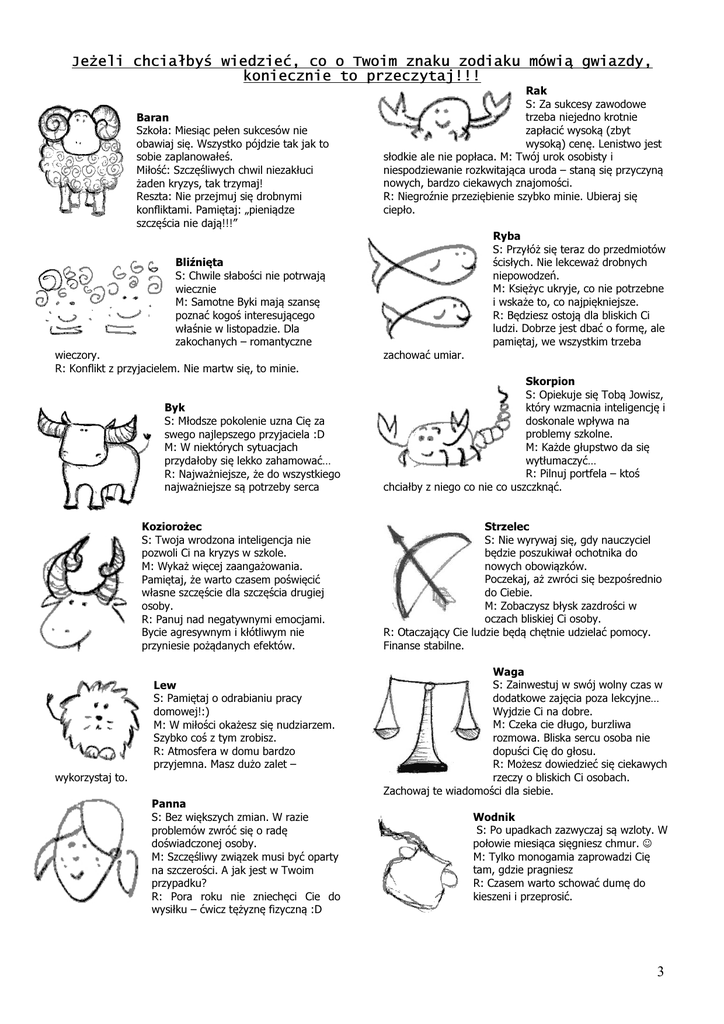 Jeżeli chciałbyś wiedzieć, co o Twoim znaku zodiaku mówią gwiazdy, koniecznie to przeczytaj!!! Baran Szkoła: Miesiąc pełen sukcesów nie obawiaj się. Wszystko pójdzie tak jak to sobie zaplanowałeś. Miłość: Szczęśliwych chwil niezakłuci żaden kryzys, tak trzymaj! Reszta: Nie przejmuj się drobnymi konfliktami. Pamiętaj: „pieniądze szczęścia nie dają!!!” Rak S: Za sukcesy zawodowe trzeba niejedno krotnie zapłacić wysoką (zbyt wysoką) cenę. Lenistwo jest słodkie ale nie popłaca. M: Twój urok osobisty i niespodziewanie rozkwitająca uroda – staną się przyczyną nowych, bardzo ciekawych znajomości. R: Niegroźnie przeziębienie szybko minie. Ubieraj się ciepło. Ryba S: Przyłóż się teraz do przedmiotów ścisłych. Nie lekceważ drobnych niepowodzeń. M: Księżyc ukryje, co nie potrzebne i wskaże to, co najpiękniejsze. R: Będziesz ostoją dla bliskich Ci ludzi. Dobrze jest dbać o formę, ale pamiętaj, we wszystkim trzeba Bliźnięta S: Chwile słabości nie potrwają wiecznie M: Samotne Byki mają szansę poznać kogoś interesującego właśnie w listopadzie. Dla zakochanych – romantyczne wieczory. R: Konflikt z przyjacielem. Nie martw się, to minie. Byk S: Młodsze pokolenie uzna Cię za swego najlepszego przyjaciela :D M: W niektórych sytuacjach przydałoby się lekko zahamować… R: Najważniejsze, że do wszystkiego najważniejsze są potrzeby serca Koziorożec S: Twoja wrodzona inteligencja nie pozwoli Ci na kryzys w szkole. M: Wykaż więcej zaangażowania. Pamiętaj, że warto czasem poświęcić własne szczęście dla szczęścia drugiej osoby. R: Panuj nad negatywnymi emocjami. Bycie agresywnym i kłótliwym nie przyniesie pożądanych efektów. Lew S: Pamiętaj o odrabianiu pracy domowej!:) M: W miłości okażesz się nudziarzem. Szybko coś z tym zrobisz. R: Atmosfera w domu bardzo przyjemna. Masz dużo zalet – wykorzystaj to. Panna S: Bez większych zmian. W razie problemów zwróć się o radę doświadczonej osoby. M: Szczęśliwy związek musi być oparty na szczerości. A jak jest w Twoim przypadku? R: Pora roku nie zniechęci Cie do wysiłku – ćwicz tężyznę fizyczną :D zachować umiar. Skorpion S: Opiekuje się Tobą Jowisz, który wzmacnia inteligencję i doskonale wpływa na problemy szkolne. M: Każde głupstwo da się wytłumaczyć… R: Pilnuj portfela – ktoś chciałby z niego co nie co uszczknąć. Strzelec S: Nie wyrywaj się, gdy nauczyciel będzie poszukiwał ochotnika do nowych obowiązków. Poczekaj, aż zwróci się bezpośrednio do Ciebie. M: Zobaczysz błysk zazdrości w oczach bliskiej Ci osoby. R: Otaczający Cie ludzie będą chętnie udzielać pomocy. Finanse stabilne. Waga S: Zainwestuj w swój wolny czas w dodatkowe zajęcia poza lekcyjne… Wyjdzie Ci na dobre. M: Czeka cie długo, burzliwa rozmowa. Bliska sercu osoba nie dopuści Cię do głosu. R: Możesz dowiedzieć się ciekawych rzeczy o bliskich Ci osobach. Zachowaj te wiadomości dla siebie. Wodnik S: Po upadkach zazwyczaj są wzloty. W połowie miesiąca sięgniesz chmur. ☺ M: Tylko monogamia zaprowadzi Cię tam, gdzie pragniesz R: Czasem warto schować dumę do kieszeni i przeprosić. 3