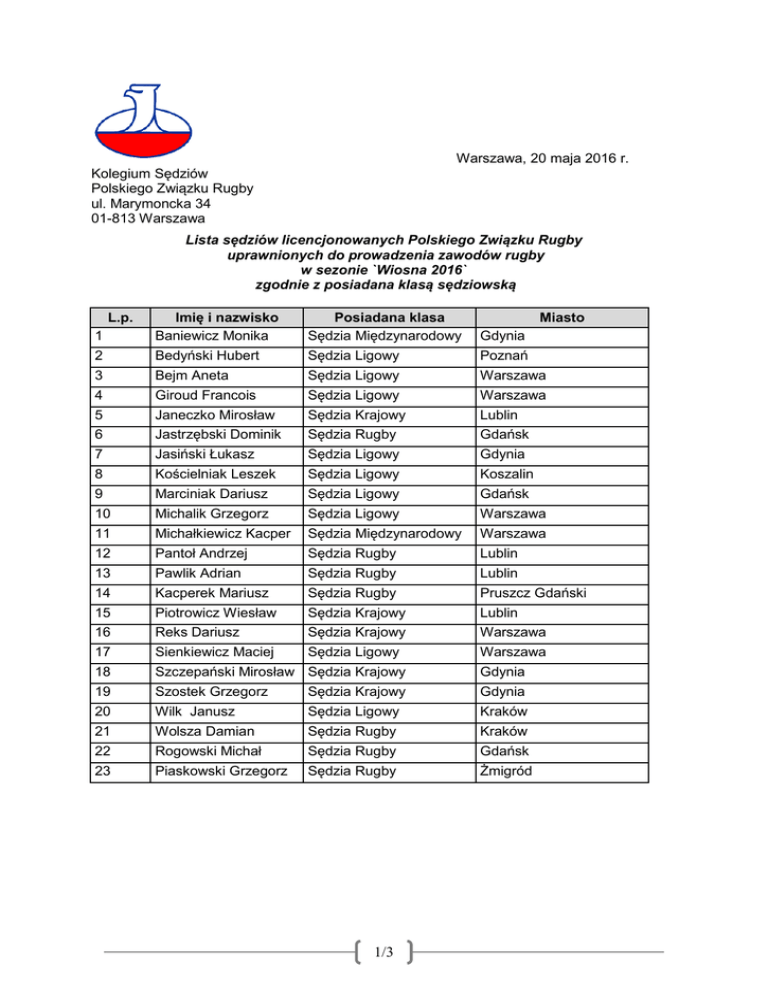 Warszawa, 20 maja 2016 r. Kolegium Sędziów Polskiego Związku Rugby ul. Marymoncka 34 01-813 Warszawa Lista sędziów licencjonowanych Polskiego Związku Rugby uprawnionych do prowadzenia zawodów rugby w sezonie `Wiosna 2016` zgodnie z posiadana klasą sędziowską 1 Imię i nazwisko Baniewicz Monika Posiadana klasa Sędzia Międzynarodowy Gdynia 2 Bedyński Hubert Sędzia Ligowy Poznań 3 Bejm Aneta Sędzia Ligowy Warszawa 4 Giroud Francois Sędzia Ligowy Warszawa 5 Janeczko Mirosław Sędzia Krajowy Lublin 6 Jastrzębski Dominik Sędzia Rugby Gdańsk 7 Jasiński Łukasz Sędzia Ligowy Gdynia 8 Kościelniak Leszek Sędzia Ligowy Koszalin 9 Marciniak Dariusz Sędzia Ligowy Gdańsk 10 Michalik Grzegorz Sędzia Ligowy Warszawa 11 Michałkiewicz Kacper Sędzia Międzynarodowy Warszawa 12 Pantoł Andrzej Sędzia Rugby Lublin 13 Pawlik Adrian Sędzia Rugby Lublin 14 Kacperek Mariusz Sędzia Rugby Pruszcz Gdański 15 Piotrowicz Wiesław Sędzia Krajowy Lublin 16 Reks Dariusz Sędzia Krajowy Warszawa 17 Sienkiewicz Maciej Sędzia Ligowy Warszawa 18 Szczepański Mirosław Sędzia Krajowy Gdynia 19 Szostek Grzegorz Sędzia Krajowy Gdynia 20 Wilk Janusz Sędzia Ligowy Kraków 21 Wolsza Damian Sędzia Rugby Kraków 22 Rogowski Michał Sędzia Rugby Gdańsk 23 Piaskowski Grzegorz Sędzia Rugby Żmigród L.p. 1/3 Miasto I. UPRAWNIENIA SĘDZIÓW LICENCJONOWANYCH: 1. Sędzia Rugby: Uprawnienia: prowadzenie: rozgrywek dzieci i młodzieży, turniejów regionów, rugby TAG, eliminacji oraz finałów OOM i MPJ, II ligi; sędzia liniowy w meczach Pucharu Polski, Ekstraligi oraz I i II ligi, pozostałych imprezach organizowanych przez Okręgi i PZR; sędzia główny w meczach I i II ligi oraz Pucharu Polski do ¼ finału. 2. Sędzia Ligowy: Uprawnienia: prowadzenie: rozgrywek dzieci i młodzieży, turniejów regionów, rugby TAG, eliminacji oraz finałów OOM i MPJ, meczów Ekstraligi oraz I i II ligi, Pucharu Polski i pozostałych imprez organizowanych przez Okręgi i PZR. 3. Sędzia Krajowy: Uprawnienia: prowadzenie: rozgrywek dzieci i młodzieży, turniejów regionów, rugby TAG, eliminacji oraz finałów OOM i MPJ, Pucharu Polski, meczów Ekstraligi oraz I i II ligi oraz meczów międzypaństwowych rozgrywanych w kraju i za granicą na które nie został wyznaczony imiennie sędzia i pozostałych imprez organizowanych przez Okręgi i PZR. 4. Sędzia Międzynarodowy: Uprawnienia: sędziowanie wszystkich spotkań organizowanych przez IRB, Rugby Europe, PZR i OZR w kraju i za granicą. 5. Sędzia Kwalifikator: Uprawnienia: sędzia główny turniejów organizowanych przez PZR i OZR, obserwator sędziów. 6. Sędzia Główny turniejów Rugby 7 – musi być nim sędzia licencjonowany (nie dotyczy turniejów towarzyskich) II. SĘDZIOWIE NIELICENCJONOWANI 1. Wszystkie pozostałe osoby nie wymienione w tabeli powyżej które przeszły szkolenie w Okręgowych Związkach Rugby, byli sędziowie PZR (którym wygasła licencja dn.31.12.2006 na podstawie art.75 Ustawy o Sporcie Kwalifikowanym z dn.29.07.2005) lub nie mający aktualnej aktywacji oraz inne osoby na sędziowanie których wyrazi zgodę organizator zawodów (rugby `15`) lub sędzia główny turnieju (rugby`7`) mogą pobierać tylko i wyłącznie Ekwiwalent Sędziowski wg. Tabeli dla Sędziów Nielicencjonowanych tzn.: a) I liga i PP do ½ finału - 50 zł / 43 zł do wypłaty b) II liga regionalna - 50 zł / 43 zł do wypłaty c) Eliminacje do MPJ i mecze towarzyskie rugby`15` - 50 zł / 43 zł do wypłaty d) Turniej Ekstraliga `Rugby 7` - 150 zł / 128 zł do wypłaty e) Turniej Ligi `Rugby 7` - 125 zł / 107 zł do wypłaty f) Inne Turnieje `Rugby 7 - 100 zł / 86 zł do wypłaty 2/3 Lista nielicencjonowanych sędziów rugby rekomendowanych przez Kolegium Sędziów PZR na „Wiosna 2016” Nazwisko i Imię L.p. Miasto 1 Żórawski Mirosław Łódź 2 Czyż Karol Sopot 3 Misiak Maciej Sochaczew 4 Patryk Kościelniak Koszalin Kolegium Sędziów PZR Wiesław Piotrowicz 3/3