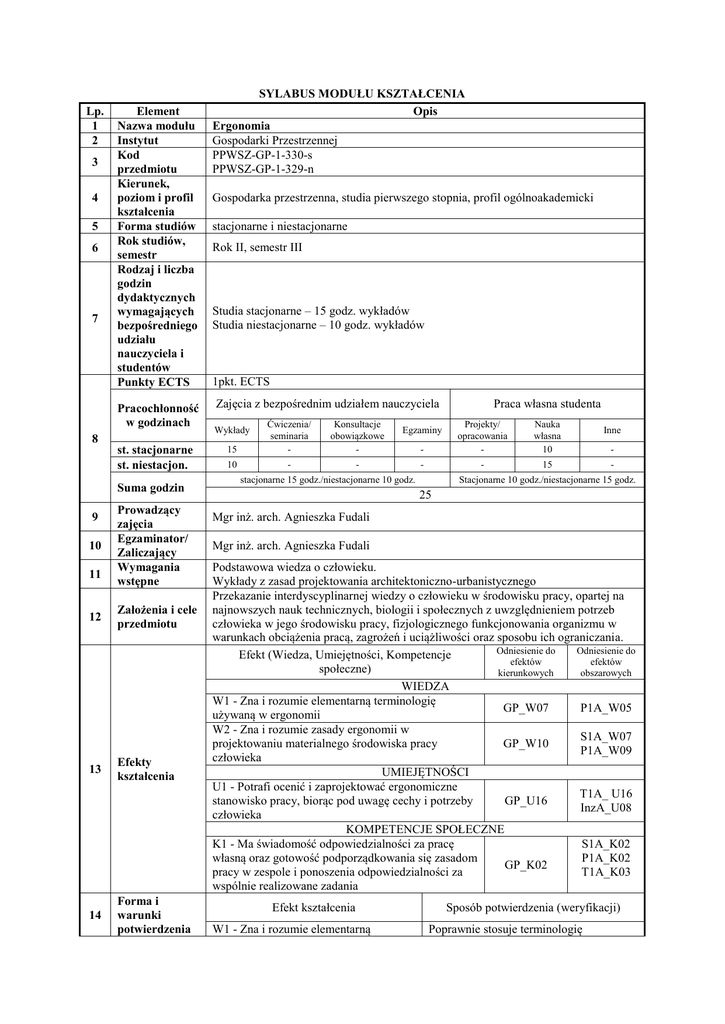 Lp. 1 2 3 4 5 6 7 Element Nazwa modułu Instytut Kod przedmiotu Kierunek, poziom i profil kształcenia Forma studiów Rok studiów, semestr Rodzaj i liczba godzin dydaktycznych wymagających bezpośredniego udziału nauczyciela i studentów Punkty ECTS Pracochłonność w godzinach 8 st. stacjonarne st. niestacjon. Suma godzin 9 10 11 Prowadzący zajęcia Egzaminator/ Zaliczający Wymagania wstępne 12 Założenia i cele przedmiotu 13 Efekty kształcenia 14 Forma i warunki potwierdzenia SYLABUS MODUŁU KSZTAŁCENIA Opis Ergonomia Gospodarki Przestrzennej PPWSZ-GP-1-330-s PPWSZ-GP-1-329-n Gospodarka przestrzenna, studia pierwszego stopnia, profil ogólnoakademicki stacjonarne i niestacjonarne Rok II, semestr III Studia stacjonarne – 15 godz. wykładów Studia niestacjonarne – 10 godz. wykładów 1pkt. ECTS Zajęcia z bezpośrednim udziałem nauczyciela 15 Ćwiczenia/ seminaria - Konsultacje obowiązkowe - 10 - - Wykłady Praca własna studenta - Projekty/ opracowania - Nauka własna 10 - - 15 Egzaminy stacjonarne 15 godz./niestacjonarne 10 godz. Inne - Stacjonarne 10 godz./niestacjonarne 15 godz. 25 Mgr inż. arch. Agnieszka Fudali Mgr inż. arch. Agnieszka Fudali Podstawowa wiedza o człowieku. Wykłady z zasad projektowania architektoniczno-urbanistycznego Przekazanie interdyscyplinarnej wiedzy o człowieku w środowisku pracy, opartej na najnowszych nauk technicznych, biologii i społecznych z uwzględnieniem potrzeb człowieka w jego środowisku pracy, fizjologicznego funkcjonowania organizmu w warunkach obciążenia pracą, zagrożeń i uciążliwości oraz sposobu ich ograniczania. Odniesienie do Odniesienie do Efekt (Wiedza, Umiejętności, Kompetencje efektów efektów społeczne) kierunkowych obszarowych WIEDZA W1 - Zna i rozumie elementarną terminologię GP_W07 P1A_W05 używaną w ergonomii W2 - Zna i rozumie zasady ergonomii w S1A_W07 projektowaniu materialnego środowiska pracy GP_W10 P1A_W09 człowieka UMIEJĘTNOŚCI U1 - Potrafi ocenić i zaprojektować ergonomiczne T1A_ U16 stanowisko pracy, biorąc pod uwagę cechy i potrzeby GP_U16 InzA_U08 człowieka KOMPETENCJE SPOŁECZNE K1 - Ma świadomość odpowiedzialności za pracę S1A_K02 własną oraz gotowość podporządkowania się zasadom P1A_K02 GP_K02 pracy w zespole i ponoszenia odpowiedzialności za T1A_K03 wspólnie realizowane zadania Efekt kształcenia W1 - Zna i rozumie elementarną Sposób potwierdzenia (weryfikacji) Poprawnie stosuje terminologię efektu kształcenia terminologię używana w ergonomii W2 - Zna i rozumie zasady ergonomii w projektowaniu materialnego środowiska pracy człowieka U1 - Potrafi ocenić i zaprojektować ergonomiczne stanowisko pracy, biorąc pod uwagę cechy i potrzeby człowieka K1 - Ma świadomość odpowiedzialności za pracę własną oraz gotowość podporządkowania się zasadom pracy w zespole i ponoszenia odpowiedzialności za wspólnie realizowane zadania specjalistyczną w prezentacji zadania projektowego. Grupowa praca projektowa, której celem jest sprawdzenie poznanych zasad ergonomii w kształtowaniu danego środowiska pracy – pozytywna ocena z pracy Umie poprawnie w zadanej sytuacji ocenić środowiska i stanowisko pracy pod względem ergonomii i odpowiednio rozwiązać zadanie projektowe. Poszanowanie prawa autorskiego w pracy, samodzielne wykonanie pracy, przyczynienie się do uzyskania jak najlepszej oceny dla zespołu opracowującego zadanie projektowe. Stosowane metody dydaktyczne wykład informacyjny, wykład problemowy, dyskusja, pokaz 16 Treści merytoryczne przedmiotu Zagadnienia wstępne: układ człowiek – obiekt techniczny, pojęcie i elementy środowiska pracy. Zagrożenia zawodowe. Rola ergonomii w kształtowaniu materialnego środowiska pracy. Rodzaje pracy i obciążenia pracą. Układ przestrzenny stanowiska pracy, przestrzeń ruchowa człowieka, niepełnosprawność. Środowisko mikroklimatyczne, optyczne, akustyczne, drgania, wibracje. Środowisko pracy zawodowej, gospodarstwa domowego, środowiska mieszkania i wypoczynku. Antropometria, zasady pomiaru ciała człowieka. Projektowanie ergonomiczne. Wysiłek, zmęczenie, wypoczynek. 17 Forma i warunki zaliczenia modułu, w tym zasady dopuszczenia do zaliczenia Zaliczenie z oceną Obecność na wykładach oraz wykonanie zadania projektowego 15 18 Wykaz literatury podstawowej 19 Wykaz literatury uzupełniającej (pomocniczej) 1. M. Wykowska, Ergonomia jako nauka stosowana, Uczelniane wydawnictwa naukowo – dydaktyczne, Kraków, 2009 2. Ujma, K. Wąsowicz, Ergonomia w architekturze, Wydawnictwo Politechniki Śląskiej. Gliwice, 2005 3. M. Krauze, Ergonomia, praktyczna wiedza o pracującym człowieku i jego środowisku, Wyd. Śląska Organizacja Techniczna, Katowice, 1992 4. A. Bogatowska, J. Słowikowski, Atlas antropometryczny dorosłej ludności Polski dla potrzeb projektowania, Wyd. Bluegras, Warszawa, 1994 5. E. Grandjean , Arkady, Warszawa, 1978 6. E. Górska, E. Tylyk, Ergonomia w projektowaniu środowiska pracy. Podstawy teoretyczne, Wyd. Oficyna wydawnicza PWNW. Warszawa, 1988