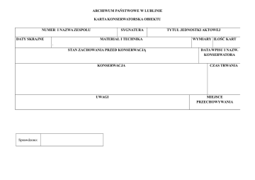 ARCHIWUM PAŃSTWOWE W LUBLINIE KARTA KONSERWATORSKA OBIEKTU NUMER I NAZWA ZESPOŁU DATY SKRAJNE SYGNATURA MATERIAŁ I TECHNIKA TYTUŁ JEDNOSTKI AKTOWEJ WYMIARY ILOŚĆ KART . STAN ZACHOWANIA PRZED KONSERWACJĄ KONSERWACJA UWAGI Sprawdzono: DATA WPISU I NAZW. KONSERWATORA CZAS TRWANIA MIEJSCE PRZECHOWYWANIA