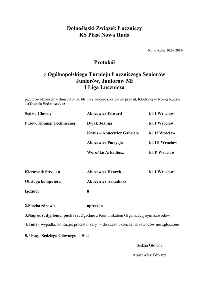 Dolnośląski Związek Łuczniczy KS Piast Nowa Ruda Nowa Ruda 20.09.2014r Protokół z Ogólnopolskiego Turnieju Łuczniczego Seniorów Juniorów, Juniorów Mł I Liga Łucznicza przeprowadzonych w dniu 20.09.2014r. na stadionie sportowym przy ul. Kłodzkiej w Nowej Rudzie 1.Obsada Sędziowska: Sędzia Główny Abucewicz Edward kl. I Wrocław Przew. Komisji Technicznej Dyjak Joanna kl. I Wrocław Kraus – Abucewicz Gabriela kl. II Wrocław Abucewicz Patrycja kl. III Wrocław Worońko Arkadiusz kl. P Wrocław Kierownik Strzelań Abucewicz Henryk kl. I Wrocław Obsługa komputera Abucewicz Arkadiusz łącznicy 8 2.Służba zdrowia apteczka 3.Nagrody, dyplomy, puchary: Zgodnie z Komunikatem Organizacyjnym Zawodów 4. Inne ( wypadki, kontuzje, protesty, kary) – do czasu ukończenia zawodów nie zgłoszono 5. Uwagi Sędziego Głównego – Brak Sędzia Główny Abucewicz Edward poz. Nazwisko imię Seniorzy 1 Gomoliszek Michał 2 Wojtkowiak Rafał 3 Borowiak Mateusz 4 Mozoła Waldemar 5 Futyma Krzysztof 6 Leśny Mateusz 7 Czech Jacek poz. Nazwisko imię Juniorzy 1 Marzec Paweł 2 Lubera Wojciech 3 Szułkowski Kacper 4 Grec Michał 5 Czernatowicz Krzysztof 6 Jurzak Adam poz. Nazwisko imię Seniorki 1 Jurzak Monika 2 Banaszewska Dudek Maja 3 Kantorska Magdalena 4 Jurzak Anna 5 Borowiak Paulina poz. Nazwisko imię Juniorki 1 Trzebińska Adrianna 2 Wierzchowska Monika 3 Huk Anna 4 Czerwińska Klaudia 5 Rybczyńska Małgorzata 6 Rybczyńska Anna poz. Nazwisko imię Junior Mł 1 Kotlarz Kajetan 2 Żmuda Przemysław 3 Wiśniewski Piotr 4 Pliński Wojciech 5 Nycz Mateusz 6 Rudnik Bartosz 7 Rabski Szymon 8 Niedźwiedź Maciej 9 Puchalski Kacper poz. Nazwisko imię Juniorka Mł 1 Ostrowska Paulina 2 Dudzik Klaudia 3 Futyma Anna r.u. 1992 1984 1991 1992 1973 1992 1980 r.u. 1994 1995 1996 1994 1996 1995 r.u. 1993 1987 1990 1993 1990 r.u. 1995 1995 1994 1997 1997 1997 r.u. 1997 1997 1997 1997 1997 1999 1999 1997 1999 r.u. Klub/miejscowość 90m 70m 50m 30m Razem OSŁ Strzelec Legnica GLKS Unia Pielgrzymka GLKS Unia Pielgrzymka KS AZS Politechnika W-w UKS Talent Wrocław GLKS Unia Pielgrzymka PTG Sokół Radom 287 275 265 244 241 198 183 Klub/miejscowość 90m 70m 50m 30m Razem UKS Talent Wrocław OSŁ Strzelec Legnica GLKS Unia Pielgrzymka UKS Talent Wrocław GLKS Unia Pielgrzymka GLKS Unia Pielgrzymka 281 264 259 268 244 259 Klub/miejscowość 70m 60m 50m 30m Razem GLKS Unia Pielgrzymka UKS Talent Wrocław KS Piast Nowa Ruda GLKS Unia Pielgrzymka GLKS Unia Pielgrzymka 285 274 276 260 232 Klub/miejscowość 70m 60m 50m 30m Razem UKS Talent Wrocław GLKS Unia Pielgrzymka UKS Talent Wrocław KS Piast Nowa Ruda KS Piast Nowa Ruda KS Piast Nowa Ruda 299 295 295 199 276 245 Klub/miejscowość 70m 60m 50m 30m Razem UKS Talent Wrocław OSŁ Strzelec Legnica OSŁ Strzelec Legnica OSŁ Strzelec Legnica UKS Talent Wrocław GLKS Unia Pielgrzymka GLKS Unia Pielgrzymka UKS Talent Wrocław UKS Talent Wrocław 304 312 299 281 292 269 248 226 186 Klub/miejscowość 60m 50m 40m 30m Razem 1999 OSŁ Strzelec Legnica 1998 UKS Victoria Ścinawka Śr 1998 UKS Talent Wrocław 282 295 261 311 301 293 297 266 280 250 290 306 300 286 300 282 317 296 271 253 213 311 300 287 265 59 320 314 309 293 274 287 262 255 248 314 288 309 311 312 297 289 224 235 266 321 314 306 307 287 272 274 264 231 253 245 286 278 289 195 303 297 274 287 270 222 241 225 240 305 292 277 343 334 339 337 312 313 299 339 338 340 333 324 317 318 327 321 308 269 333 319 310 278 343 340 331 335 311 295 293 295 267 319 313 306 1252 1222 1194 1167 1043 1026 998 1231 1222 1205 1194 1155 1130 1194 1161 1099 1074 959 1229 1192 1181 937 335 245 1270 1263 1213 1196 1147 1073 1044 1001 941 1220 1188 1153 I Liga Łucznicza Mężczyzn GLKS Unia Pielgrzymka 4776 1 2 3 4 Wojtkowiak Rafał Szułkowski Kacper Borowiak Mateusz Czernatowicz Krzysztof 1222 1205 1194 1155 Gwiazdy FITA Za 1200 Lubera Wojciech 1995 OSŁ Strzelec Legnica 1222 KS AZS Politechnika W-w 1167 Za 1100 Mozoła Waldemar 1992