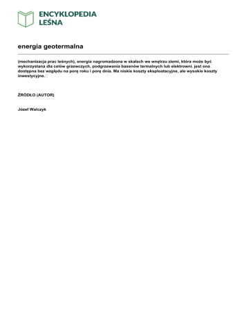 energia geotermalna (mechanizacja prac leśnych), energia nagromadzona w skałach we wnętrzu ziemi, która może być wykorzystana dla celów grzewczych, podgrzewania basenów termalnych lub elektrowni. jest ona dostępna bez względu na porę roku i porę dnia. Ma niskie koszty eksploatacyjne, ale wysokie koszty inwestycyjne. ŹRÓDŁO (AUTOR) Józef Walczyk