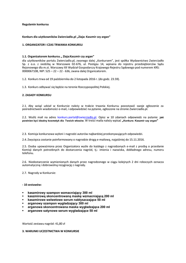 Regulamin konkursu Konkurs dla użytkowników Zwierciadlo.pl „Ziaja: Kaszmir czy argan” 1. ORGANIZATOR I CZAS TRWANIA KONKURSU 1.1. Organizatorem konkursu „ Ziaja:Kaszmir czy argan” dla użytkowników portalu Zwierciadlo.pl, zwanego dalej „Konkursem”, jest spółka Wydawnictwo Zwierciadło Sp. z o.o. z siedzibą w Warszawie 02-676, ul. Postępu 14, wpisana do rejestru przedsiębiorców Sądu Rejonowego dla m.st. Warszawy XII Wydział Gospodarczy Krajowego Rejestru Sądowego pod numerem KRS: 0000067108, NIP: 525 – 22 – 22 - 636, zwana dalej Organizatorem. 1.2. Konkurs trwa od 19 października do 2 listopada 2016 r. (do godz. 23.59). 1.3. Konkurs odbywać się będzie na terenie Rzeczypospolitej Polskiej. 2. ZASADY KONKURSU 2.1. Aby wziąć udział w Konkursie należy w trakcie trwania Konkursu pozostawić swoje zgłoszenie za pośrednictwem wiadomości e-mail, i odpowiedzieć na pytanie, ogłoszone na stronie Zwierciadlo.pl. 2.2. Wyślij mail na adres [email protected]. Opisz w 10 zdaniach odpowiedz na pytanie: powinien być idealny kosmetyk dla Twoich włosów. W treści maila należy wpisać „Konkurs: Kaszmir czy argan” jaki 2.3. Komisja konkursowa wyłoni i nagrodzi autorów najbardziej przekonywujących odpowiedzi. 2.4. Zwycięzca zostanie poinformowany o nagrodzie drogą e-mailową, najpóźniej do 15.11.2016. 2.5. Osoba upoważniona przez Organizatora wyśle do każdego z nagrodzonych e-mail z prośbą o przesłanie Komisji danych potrzebnych do dostarczenia nagród, tj.: imienia i nazwiska, dokładnego adresu, numeru telefonu. 2.6. Niedostarczenie wymienionych danych przez nagrodzonego w ciągu kolejnych 2 dni roboczych oznacza automatyczną i dobrowolną rezygnację z nagrody. 2.7. Nagrody w Konkursie: - 10 zestawów: kaszmirowy szampon wzmacniający 300 ml kaszmirową skoncentrowaną maskę wzmacniającą 200 ml kaszmirowe welwetowe serum nabłyszczające 50 ml arganowy szampon wygładzający 300 ml arganowa skoncentrowana maska wygładzająca 200 ml arganowe satynowe serum wygładzające 50 ml Wartość zestawu nagród: 41,80 zł 3. WARUNKI UCZESTNICTWA W KONKURSIE 3.1. W Konkursie mogą wziąć udział wyłącznie osoby pełnoletnie, za wyjątkiem osób wymienionych w pkt. 3.2. regulaminu. Każdy z uczestników Konkursu może wygrać tylko jedną nagrodę. 3.2. W Konkursie nie mogą brać udziału pracownicy i przedstawiciele Organizatora, członkowie ich najbliższej rodziny oraz inne osoby biorące udział w przygotowaniu i prowadzeniu Konkursu. 4. ODBIÓR NAGRODY 4.1. Nagroda zostanie przekazana na wskazany przez nagrodzonego adres. 4.1.1. Podczas odbioru przesyłki, odbiorca jest proszony o rozpakowanie jej w obecności kuriera lub listonosza i sprawdzenie czy nie jest uszkodzona. W przypadku dostarczenia uszkodzonej przesyłki jedynie otwarcie jej w obecności osoby dostarczającej upoważnia do złożenia reklamacji. Reklamacja składana jest wówczas do Poczty Polskiej lub odpowiedniej firmy kurierskiej. 4.2. Zgodnie z ustawą o podatku dochodowym od osób fizycznych laureat Konkursu obciążony zostanie podatkiem dochodowym z tytułu wygranej o wartości przekraczającej kwotę 760,00 zł, w wysokości 10% wartości nagrody, którego uiszczenie Organizatorowi w terminie 14 dni od dnia powiadomienia przez Organizatora o wygranej, jest warunkiem koniecznym do otrzymania nagrody. 4.3. Wysyłka nagród wygranych w Konkursie, nastąpi najpóźniej w ciągu miesiąca od opublikowania wyników Konkursu. W przypadku nieodebrania nagrody prawidłowo przesłanej przez Organizatora na podany adres przez laureata prawo do nagrody przepada. 4.4. Za wygrane nagrody rzeczowe nie przysługuje ekwiwalent pieniężny. 4.5. Dane osobowe uczestników Konkursu w zakresie: imię i nazwisko, adres zamieszkania, numer telefonu oraz adres email będą przetwarzane przez organizatora Konkursu, tj. Wydawnictwo Zwierciadło” Sp. z o.o. z siedzibą w Warszawie 02-676, ul. Postępu 14 w celu realizacji umowy przystąpienia do Konkursu i jego prawidłowego przeprowadzenia lub marketingu własnych produktów organizatora Konkursu. Gwarantujemy prawo wglądu do swoich danych osobowych oraz ich poprawiania, jak również żądania zaprzestania przetwarzania danych. Podanie danych jest dobrowolne, lecz ich brak uniemożliwia w przypadku wygranej dostarczenie do zwycięzcy nagrody. Dane osobowe nie będą udostępniane innym podmiotom. Regulamin Konkursu jest do wglądu w siedzibie organizatora. Dane osobowe uczestników Konkursu będą chronione zgodnie z ustawą o ochronie danych osobowych. Organizator informuje, iż Nazwy Użytkowników (loginy) Konkursu zostaną opublikowane na stronie internetowej Organizatora (www.zwierciadlo.pl) w ramach rozwiązania konkursu. 5. KOMISJA 5.1. Do kontroli prawidłowości Konkursu powołana zostanie Komisja Konkursowa w składzie: Aleksandra Mijakoska- Siemion, Natalia Stępień. 5.2. Komisja będzie nadzorować wykonanie przez Organizatora wszystkich zobowiązań wynikających z niniejszego regulaminu. 6. REKLAMACJE 6.1. Reklamacje związane z Konkursem będą przyjmowane przez Organizatora wyłącznie w formie pisemnej, na adres Organizatora w Warszawie 02-676, przy ul Postępu 14 w terminie 7 dni od daty zakończenia Konkursu. 6.2. Wszelkie reklamacje powinny zawierać imię, nazwisko, dokładny adres, nazwę Konkursu, jak również dokładny opis reklamacji. 6.3. Do rozstrzygania reklamacji powołana jest Komisja Reklamacyjna. 6.4. W przypadku przesłania reklamacji złożonej za pośrednictwem poczty, decyduje data stempla pocztowego na reklamacji. 6.5. Złożone przez uczestników reklamacje będą rozpatrywane przez Komisję Reklamacyjną nie później niż w terminie 14 dni od daty otrzymania reklamacji. 6.6. Zainteresowani zostaną powiadomieni o rozpatrzeniu reklamacji listem poleconym najpóźniej w ciągu 7 dni od daty rozpatrzenia reklamacji przez Komisję Reklamacyjną. 6.7. Decyzja Komisji Reklamacyjnej, co do zgłoszonej reklamac