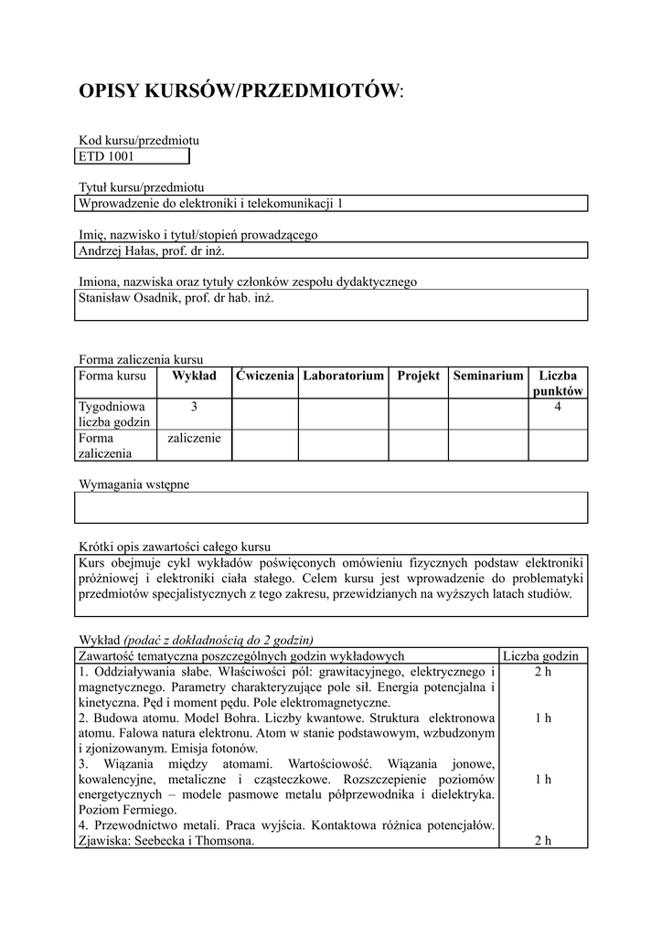OPISY KURSÓW/PRZEDMIOTÓW: Kod kursu/przedmiotu ETD 1001 Tytuł kursu/przedmiotu Wprowadzenie do elektroniki i telekomunikacji 1 Imię, nazwisko i tytuł/stopień prowadzącego Andrzej Hałas, prof. dr inż. Imiona, nazwiska oraz tytuły członków zespołu dydaktycznego Stanisław Osadnik, prof. dr hab. inż. Forma zaliczenia kursu Forma kursu Wykład Tygodniowa liczba godzin Forma zaliczenia 3 Ćwiczenia Laboratorium Projekt Seminarium Liczba punktów 4 zaliczenie Wymagania wstępne Krótki opis zawartości całego kursu Kurs obejmuje cykl wykładów poświęconych omówieniu fizycznych podstaw elektroniki próżniowej i elektroniki ciała stałego. Celem kursu jest wprowadzenie do problematyki przedmiotów specjalistycznych z tego zakresu, przewidzianych na wyższych latach studiów. Wykład (podać z dokładnością do 2 godzin) Zawartość tematyczna poszczególnych godzin wykładowych Liczba godzin 1. Oddziaływania słabe. Właściwości pól: grawitacyjnego, elektrycznego i 2h magnetycznego. Parametry charakteryzujące pole sił. Energia potencjalna i kinetyczna. Pęd i moment pędu. Pole elektromagnetyczne. 2. Budowa atomu. Model Bohra. Liczby kwantowe. Struktura elektronowa 1h atomu. Falowa natura elektronu. Atom w stanie podstawowym, wzbudzonym i zjonizowanym. Emisja fotonów. 3. Wiązania między atomami. Wartościowość. Wiązania jonowe, kowalencyjne, metaliczne i cząsteczkowe. Rozszczepienie poziomów 1h energetycznych – modele pasmowe metalu półprzewodnika i dielektryka. Poziom Fermiego. 4. Przewodnictwo metali. Praca wyjścia. Kontaktowa różnica potencjałów. Zjawiska: Seebecka i Thomsona. 2h 5. Półprzewodniki samoistne i domieszkowane. Przewodnictwo elektronowe i dziurowe. Złącze p-n. Dioda półprzewodnikowa i tranzystor bipolarny. Zjawisko Peltiera. 6. Zjawisko fotoelektryczne wewnętrzne: fotorezystory, fotodiody i fotoogniwa. Zjawisko fotoelektryczne zewnętrzne – zjawisko fotoemisji. Charakterystyki fotokomórek. 7. Termoemisja elektronów. Prawo Richardsona. Lampy elektronowe: dioda i trioda. Prawo Langmuire’a. 8. Emisja polowa. Prawo Fowlera-Nordheima. Emitery ostrzowe. Emisja wtórna. Rozkład energii elektronów wtórnych. 9. Wyładowania w gazach. Zderzenia sprężyste i niesprężyste. Jonizacja lawinowa. Systematyka wyładowań. Wyładowanie jarzeniowe i łukowe. Wyładowania iskrowe. Wyładowania atmosferyczne. ------------10. Podstawowe jednostki w układzie SI (International System) 11. Sygnał sinusoidalny, pulsacja, kąt fazowy, częstotliwość, długość fali. 12. Elementy R, L, C w obwodzie prądu zmiennego. 13. Sygnał periodyczny jako suma sygnałów sinusoidalnych: - impuls prostokątny - sygnał sinusoidalny modulowany amplitudowo - sygnał sinusoidalny zmodulowany częstotliwościowo - inne przebiegi typowe dla elektroniki. 14. Pojęcie liniowości i nieliniowości elementu (układu). Właściwości elementu (układu) nieliniowego - generacja harmonicznych; przykłady zastosowań, - przemiana częstotliwości; przykłady zastosowań, - modulacja amplitudy i modulacja częstotliwości, demodulacja. 15. Układ o stałych skupionych i rozłożonych. Podstawowe pojęcia . Rozmiary liniowe elementów i układów a górny zakres częstotliwości pracy. 16. Parametry pasożytnicze elementów konwencjonalnych a zakres przydatności w funkcji częstotliwości (długości fali) 17. Elementy bierne o stałych rozłożonych. 18. Mikroelektronika monolityczna i hybrydowa jako metoda zwiększania górnego zakresu częstotliwości pracy układu. Najważniejsze „kamienie milowe” w historii scalania układów elektronicznych: - fotolitografia jako klucz do scalania układów, - technika modułowa (elektronika próżniowa), - technika mikromodułowa, - tranzystor planarny jako podstawa wejściowa do układów monolitycznych na bazie Si, - zarys stanu współczesnego, - nowe tendencje rozwojowe, mikroelektronika próżniowa, fotonika. 19. Niektóre specyficzne rozwiązania układowe w technice monolitycznej jako konsekwencje ograniczeń a jednocześnie nowych możliwości (na przykładzie wzmacniacza tranzystorowego): - polaryzacja stałym prądem bazy, lustro prądowe, - obciążenie aktywne (źródło prądowe), - wzmacniacz różnicowy, - wzmacniacz operacyjny. 2h 2h 2h 1h 2h 2h 2h 2h 4h 3h 3h 2h 2h 4h 4h 2h 20. Kolokwium Ćwiczenia, seminarium - zawartość tematyczna Laboratorium, projekt - zawartość tematyczna Materiał do samodzielnego opracowania Literatura podstawowa Literatura uzupełniająca Warunki zaliczenia Kolokwium DESCRIPTION OF THE COURSES: Course code ETD 1001 Course title Introduction to Electronics and Telecommunications 1 Supervising course lecturer Andrzej Hałas, PhD, Prof. Other course lecturers Stanisław Osadnik, PhD, DSc, Prof. Course structure Course form Lecture Classes Laboratory Project Seminar Number of credits Number of hours /week Form of the course completion Prerequisites Course description Lecture Particular lectures contents Classes, seminars - the contents Number of hours Laboratory, project – the contents Material for self preparation Core literature Additional literature Conditions for course credition