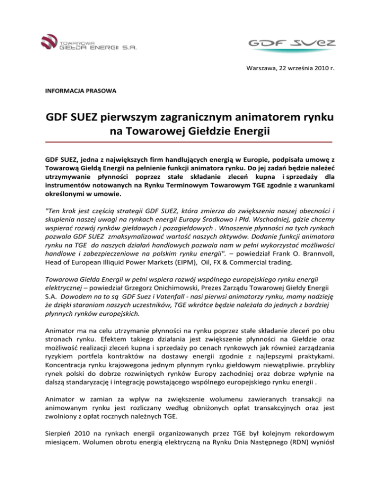 Warszawa, 22 września 2010 r. INFORMACJA PRASOWA GDF SUEZ pierwszym zagranicznym animatorem rynku na Towarowej Giełdzie Energii GDF SUEZ, jedna z największych firm handlujących energią w Europie, podpisała umowę z Towarową Giełdą Energii na pełnienie funkcji animatora rynku. Do jej zadao będzie należed utrzymywanie płynności poprzez stałe składanie zleceo kupna i sprzedaży dla instrumentów notowanych na Rynku Terminowym Towarowym TGE zgodnie z warunkami określonymi w umowie. "Ten krok jest częścią strategii GDF SUEZ, która zmierza do zwiększenia naszej obecności i skupienia naszej uwagi na rynkach energii Europy Środkowo i Płd. Wschodniej, gdzie chcemy wspierad rozwój rynków giełdowych i pozagiełdowych . Wnoszenie płynności na tych rynkach pozwala GDF SUEZ zmaksymalizowad wartośd naszych aktywów. Dodanie funkcji animatora rynku na TGE do naszych działao handlowych pozwala nam w pełni wykorzystad możliwości handlowe i zabezpieczeniowe na polskim rynku energii". – powiedział Frank O. Brannvoll, Head of European Illiquid Power Markets (EIPM), Oil, FX & Commercial trading. Towarowa Giełda Energii w pełni wspiera rozwój wspólnego europejskiego rynku energii elektrycznej – powiedział Grzegorz Onichimowski, Prezes Zarządu Towarowej Giełdy Energii S.A. Dowodem na to są GDF Suez i Vatenfall - nasi pierwsi animatorzy rynku, mamy nadzieję że dzięki staraniom naszych uczestników, TGE wkrótce będzie należała do jednych z bardziej płynnych rynków europejskich. Animator ma na celu utrzymanie płynności na rynku poprzez stałe składanie zleceo po obu stronach rynku. Efektem takiego działania jest zwiększenie płynności na Giełdzie oraz możliwośd realizacji zleceo kupna i sprzedaży po cenach rynkowych jak również zarządzania ryzykiem portfela kontraktów na dostawy energii zgodnie z najlepszymi praktykami. Koncentracja rynku krajowegona jednym płynnym rynku giełdowym niewątpliwie. przybliży rynek polski do dobrze rozwiniętych rynków Europy zachodniej oraz dobrze wpłynie na dalszą standaryzację i integrację powstającego wspólnego europejskiego rynku energii . Animator w zamian za wpływ na zwiększenie wolumenu zawieranych transakcji na animowanym rynku jest rozliczany według obniżonych opłat transakcyjnych oraz jest zwolniony z opłat rocznych należnych TGE. Sierpieo 2010 na rynkach energii organizowanych przez TGE był kolejnym rekordowym miesiącem. Wolumen obrotu energią elektryczną na Rynku Dnia Następnego (RDN) wyniósł 562 312 MWh i był wyższy od łącznego wolumenu w lipcu o 26,72%.Na Rynku Terminowym Towarowym (RTT) łaczny wolumen obrotów wyniósł 2 292 655 MWh. W stosunku do poprzedniego okresu, obroty na tym rynku wzrosły o 58,14%. *** GDF SUEZ jest jednym z największych dostawców energii na świecie. Roczne obroty samą energią elektryczną wynoszą ponad 600 TWh, co sprawia, że GDF Suez jest jednym z najważniejszych graczy na europejskim rynku energii. Od dłuższego czasu firma aktywnie uczestniczy w szeregu projektów budujących płynności rynków Europy Środkowo – Wschodniej. GDF SUEZ rozwija swoją działalnośd biznesową w oparciu o model odpowiedzialności społecznej aby sprostad dzisiejszym wyzwaniom energetycznym i środowiskowym, takim jak: zaspokojenie potrzeb energetycznych, zapewnienie bezpieczeostwa dostaw, walka przeciwko negatywnym zmianom klimatycznym oraz maksymalizacja wykorzystania zasobów. Grupa udostępnia wysoce wydajne i innowacyjne rozwiązania dla osób fizycznych, miast i firm, polegające na zdywersyfikowanych źródłach dostaw gazu, elastycznym oraz nisko emisyjnym wytwarzaniu energii elektrycznej, a także unikatowej znajomości czterech kluczowych sektorów: skroplonego gazu ziemnego, produckji energii elektrycznej, usług związanych z efektywnością energetyczną i usług środowiskowych. GDF SUEZ zatrudnia 200,650 ludzi na całym świecie osiągając przychód na poziomie 79.9 mld EUR w roku 2009. Grupa jest notowana na giełdach w Brukseli, Luksemburgu i Paryżu i jest reprezentowana w głównych międzynarodowych indeksach: CAC 40, BEL 20, DJ Stoxx 50, DJ Euro Stoxx 50, Euronext 100, FTSE Eurotop 100, MSCI Europe, ASPI Eurozone and ECPI Ethical Index EMU. Kontakt do prasy: Tel France: +33 (0)1 57 04 24 35 Tel Belgium: +32 2 510 76 70 E-Mail: [email protected] Towarowa Giełda Energii S.A. (TGE) powstała pod koniec 1999 roku z inicjatywy Ministra Skarbu Paostwa.. Działalnośd operacyjną rozpoczęła w dniu 30 czerwca 2000 roku, kiedy zawarte zostały pierwsze kontrakty na dostawę energii elektrycznej na tzw. Rynku Dnia Następnego. Obecnie TGE prowadzi następujące rynki: Rynek Dnia Następnego, Rynek Terminowy Energii Elektrycznej z fizyczną dostawą, Rynek Terminowy Finansowy, Rynek Praw Majątkowych dla OZE i Kogeneracji. TGE prowadzi również Rejestr Świadectw Pochodzenia dla energii elektrycznej wyprodukowanej w OZE oraz w wysokosprawnych źródłach kogeneracyjnych, a także Rynek Uprawnieo do Emisji CO2. Towarowa Giełda Energii S.A. posiada nowoczesny system giełdowy CONDICO dostarczony przez NASDAQ OMX – operatora giełd i największą na świecie firmę projektującą systemy notująco - rozliczeniowe, stosowane przez wiele giełd na całym świecie (ponad 40 wdrożeo na różnych giełdach). W 2008 roku TGE udostępniła Członkom Giełdy nową aplikacją maklerską do systemu notującego - CONDICO Trade, dostarczoną również przez NASDAQ OMX. Aplikacja jest wciąż rozwijana i zbiera pozytywne oceny. Więcej o TGE: http://www.tge.pl Kontakt do prasy: Grzegorz Onichimowski – TGE S.A., tel. 22 341 99 12 ,E-Mail: [email protected] Agata Samcik – ComPress S.A., tel. 603 856 031, E-Mail: [email protected]