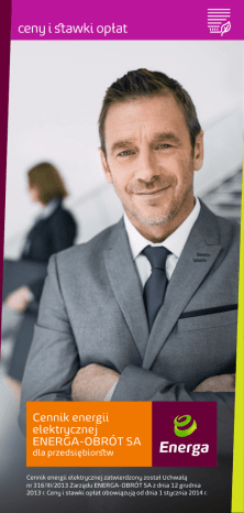 ceny i stawki opłat Cennik energii elektrycznej ENERGA-OBRÓT SA dla przedsiębiorstw Cennik energii elektrycznej zatwierdzony został Uchwałą nr 316/III/2013 Zarządu ENERGA-OBRÓT SA z dnia 12 grudnia 2013 r. Ceny i stawki opłat obowiązują od dnia 1 stycznia 2014 r. ceny i stawki opłat SPIS TREŚCI 1. Informacje ogólne. . . . . . . . . . . . . . . . . . . . . . . . . . . . . . . . . . . . . . . . . . . . . . . . 4 2. Definicje. . . . . . . . . . . . . . . . . . . . . . . . . . . . . . . . . . . . . . . . . . . . . . . . . . . . . . . . . . . . 5 3. Ogólne zasady rozliczeń za energię elektryczną. . . . . . . . . . . . . 6 3.1. Zasady kwalifikacji Odbiorców do grup taryfowych. . . . . 6 3.2. Strefy czasowe. . . . . . . . . . . . . . . . . . . . . . . . . . . . . . . . . . . . . . . . . . . . . . . 9 3.3. Ogólne zasady rozliczania Odbiorców. . . . . . . . . . . . . . . . . . 11 3.4. Zasady korygowania wystawionych faktur. . . . . . . . . . . 12 4. Szczegółowe zasady rozliczeń za energię elektryczną. . . . . 13 4.1. Rozliczenia za energię elektryczną czynną. . . . . . . . . . . . . 13 5. Bonifikaty i upusty. . . . . . . . . . . . . . . . . . . . . . . . . . . . . . . . . . . . . . . . . . . . . 14 6. Ceny za energię elektryczną . . . . . . . . . . . . . . . . . . . . . . . . . . . . . . . . . . 15 6.1. T abela cen energii dla Odbiorców końcowych . . . . . . . . . . 15 6.2. T abela cen energii przeznaczonej do dalszej odsprzedaży. . . . . . . . . . . . . . . . . . . . . . . . . . . . . . . . . . . . . . 16 6.3. T abela cen energii dla Odbiorców końcowych. . . . . . . . . . . 17 6.4. T abela cen energii przeznaczonej do dalszej odsprzedaży. . . . . . . . . . . . . . . . . . . . . . . . . . . . . . . . . . . . . . 18 6.5. Stawki opłat handlowych . . . . . . . . . . . . . . . . . . . . . . . . . . . . . . . . . . . 19 7. Postanowienia końcowe. . . . . . . . . . . . . . . . . . . . . . . . . . . . . . . . . . . . . . 20 3 ceny i stawki opłat 1. Informacje ogólne 2. Definicje 1.1. Niniejszy Cennik (zwany również Cennikiem Standardowym) ma zastosowanie dla Odbiorców obsługiwanych przez spółkę ENERGA-OBRÓT SA, zwaną dalej „Sprzedawcą”. Miejsce dostarczania energii elektrycznej – punkt w sieci, do którego przedsiębiorstwo energetyczne dostarcza energię elektryczną, określony w umowie o przyłączenie do sieci albo w umowie o świadczenie usług przesyłania lub dystrybucji energii elektrycznej, albo w umowie sprzedaży energii elektrycznej, albo w umowie kompleksowej, będący jednocześnie miejscem odbioru tej energii. 1.2. Obszar działania Sprzedawcy obejmuje terytorium Rzeczpospolitej Polskiej. 1.3.Cennik zawiera rodzaje oraz wysokość: a) cen za energię elektryczną, b) stawek opłat handlowych. 1.4.Cennik uwzględnia postanowienia: a) ustawy z dnia 10 kwietnia 1997 r. – Prawo energetyczne (Dz.U. z 2012 r., poz. 1059 z późn. zm), zwanej dalej „Ustawą”, b) rozporządzenia Ministra Gospodarki z dnia 18 sierpnia 2011 r. w sprawie szczegółowych zasad kształtowania i kalkulacji taryf oraz rozliczeń w obrocie energią elektryczną (Dz.U. z 2013 r., poz. 1200 t.j.), zwanego dalej „rozporządzeniem taryfowym”. 1.5.Ceny i stawki zawarte w Cenniku nie zawierają podatku od towarów i usług (VAT). W odniesieniu do nich podatek VAT nalicza się zgodnie z obowiązującymi przepisami. 1.6. Cennik stosuje się w rozliczeniach z Odbiorcami i innymi podmiotami stosownie do zakresu świadczonych usług i zawartych umów kompleksowych oraz umów sprzedaży energii elektrycznej. 1.7.W niniejszym Cenniku zawarte są dwa zestawy cen energii elektrycznej: a) pierwszy, przeznaczony dla Odbiorców końcowych dokonujących zakupu energii na własny użytek, uwzględniający koszty obowiązkowego zakupu i umorzenia świadectw pochodzenia energii wytwarzanej w odnawialnych źródłach energii oraz koszty obowiązkowego zakupu energii wytwarzanej w skojarzeniu z wytwarzaniem ciepła, b) drugi, przeznaczony wyłącznie dla przedsiębiorstw energetycznych w zakresie energii podlegającej dalszej odsprzedaży, nieuwzględniający kosztów, o których mowa w punkcie 1.7. a. 1.8. Rozliczenia z tytułu dystrybucji energii elektrycznej w ramach umów kompleksowych dokonywane będą według stawek, opłat i zasad ich stosowania określonych w Taryfie Operatora Systemu Dystrybucyjnego właściwego dla miejsca dostarczania energii elektrycznej. Napięcie niskie (nn) – napięcie znamionowe nie wyższe niż 1 kV. Napięcie średnie (SN) – obejmuje napięcia znamionowe wyższe niż 1 kV i niższe niż 110 kV. Napięcie wysokie (WN) – obejmuje napięcie znamionowe 110 kV. Odbiorca – każdy, kto otrzymuje lub pobiera energię elektryczną na podstawie umowy z przedsiębiorstwem energetycznym. Okres rozliczeniowy – okres pomiędzy dwoma kolejnymi rozliczeniowymi odczytami urządzeń do pomiaru energii elektrycznej. Operator Systemu Dystrybucyjnego (OSD) – przedsiębiorstwo energetyczne zajmujące się dystrybucją energii elektrycznej, odpowiedzialne za ruch sieciowy w systemie dystrybucyjnym, bieżące i długookresowe bezpieczeństwo funkcjonowania tego systemu, eksploatację, konserwację, remonty oraz niezbędną rozbudowę sieci dystrybucyjnej, w tym połączeń z innymi systemami elektroenergetycznymi. Przedsiębiorstwo energetyczne – podmiot prowadzący działalność gospodarczą w zakresie wytwarzania, przesyłania, dystrybucji lub obrotu energią elektryczną. Sprzedawca – ENERGA-OBRÓT SA – prowadząca działalność w zakresie obrotu energią elektryczną na podstawie posiadanej koncesji na obrót energią elektryczną. Umowa – umowa sprzedaży energii elektrycznej, umowa kompleksowa. Umowa kompleksowa – umowa zawierająca postanowienia umowy sprzedaży i umowy o świadczenie usługi przesyłania lub dystrybucji energii. 1.9. W przypadku sprzedaży energii elektrycznej w ramach umowy kompleksowej wystawiana jest jedna faktura zaw