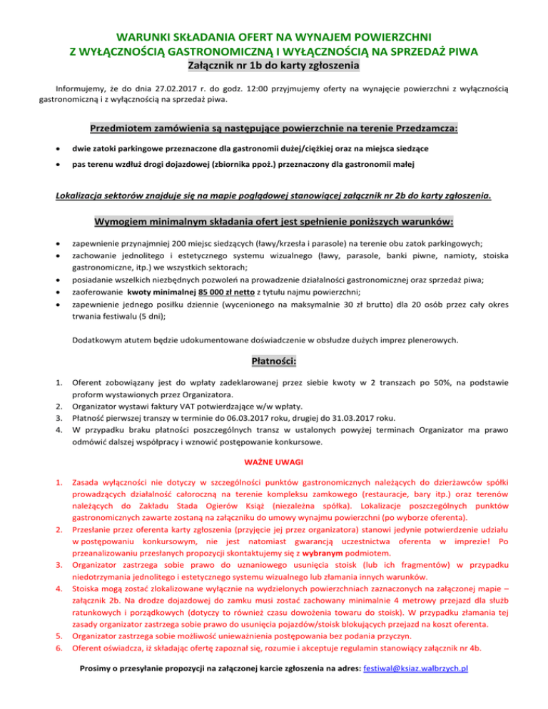 WARUNKI SKŁADANIA OFERT NA WYNAJEM POWIERZCHNI Z WYŁĄCZNOŚCIĄ GASTRONOMICZNĄ I WYŁĄCZNOŚCIĄ NA SPRZEDAŻ PIWA Załącznik nr 1b do karty zgłoszenia Informujemy, że do dnia 27.02.2017 r. do godz. 12:00 przyjmujemy oferty na wynajęcie powierzchni z wyłącznością gastronomiczną i z wyłącznością na sprzedaż piwa. Przedmiotem zamówienia są następujące powierzchnie na terenie Przedzamcza: dwie zatoki parkingowe przeznaczone dla gastronomii dużej/ciężkiej oraz na miejsca siedzące pas terenu wzdłuż drogi dojazdowej (zbiornika ppoż.) przeznaczony dla gastronomii małej Lokalizacja sektorów znajduje się na mapie poglądowej stanowiącej załącznik nr 2b do karty zgłoszenia. Wymogiem minimalnym składania ofert jest spełnienie poniższych warunków: zapewnienie przynajmniej 200 miejsc siedzących (ławy/krzesła i parasole) na terenie obu zatok parkingowych; zachowanie jednolitego i estetycznego systemu wizualnego (ławy, parasole, banki piwne, namioty, stoiska gastronomiczne, itp.) we wszystkich sektorach; posiadanie wszelkich niezbędnych pozwoleń na prowadzenie działalności gastronomicznej oraz sprzedaż piwa; zaoferowanie kwoty minimalnej 85 000 zł netto z tytułu najmu powierzchni; zapewnienie jednego posiłku dziennie (wycenionego na maksymalnie 30 zł brutto) dla 20 osób przez cały okres trwania festiwalu (5 dni); Dodatkowym atutem będzie udokumentowane doświadczenie w obsłudze dużych imprez plenerowych. Płatności: 1. 2. 3. 4. Oferent zobowiązany jest do wpłaty zadeklarowanej przez siebie kwoty w 2 transzach po 50%, na podstawie proform wystawionych przez Organizatora. Organizator wystawi faktury VAT potwierdzające w/w wpłaty. Płatność pierwszej transzy w terminie do 06.03.2017 roku, drugiej do 31.03.2017 roku. W przypadku braku płatności poszczególnych transz w ustalonych powyżej terminach Organizator ma prawo odmówić dalszej współpracy i wznowić postępowanie konkursowe. WAŻNE UWAGI 1. 2. 3. 4. 5. 6. Zasada wyłączności nie dotyczy w szczególności punktów gastronomicznych należących do dzierżawców spółki prowadzących działalność całoroczną na terenie kompleksu zamkowego (restauracje, bary itp.) oraz terenów należących do Zakładu Stada Ogierów Książ (niezależna spółka). Lokalizacje poszczególnych punktów gastronomicznych zawarte zostaną na załączniku do umowy wynajmu powierzchni (po wyborze oferenta). Przesłanie przez oferenta karty zgłoszenia (przyjęcie jej przez organizatora) stanowi jedynie potwierdzenie udziału w postępowaniu konkursowym, nie jest natomiast gwarancją uczestnictwa oferenta w imprezie! Po przeanalizowaniu przesłanych propozycji skontaktujemy się z wybranym podmiotem. Organizator zastrzega sobie prawo do uznaniowego usunięcia stoisk (lub ich fragmentów) w przypadku niedotrzymania jednolitego i estetycznego systemu wizualnego lub złamania innych warunków. Stoiska mogą zostać zlokalizowane wyłącznie na wydzielonych powierzchniach zaznaczonych na załączonej mapie – załącznik 2b. Na drodze dojazdowej do zamku musi zostać zachowany minimalnie 4 metrowy przejazd dla służb ratunkowych i porządkowych (dotyczy to również czasu dowożenia towaru do stoisk). W przypadku złamania tej zasady organizator zastrzega sobie prawo do usunięcia pojazdów/stoisk blokujących przejazd na koszt oferenta. Organizator zastrzega sobie możliwość unieważnienia postępowania bez podania przyczyn. Oferent oświadcza, iż składając ofertę zapoznał się, rozumie i akceptuje regulamin stanowiący załącznik nr 4b. Prosimy o przesyłanie propozycji na załączonej karcie zgłoszenia na adres: [email protected]