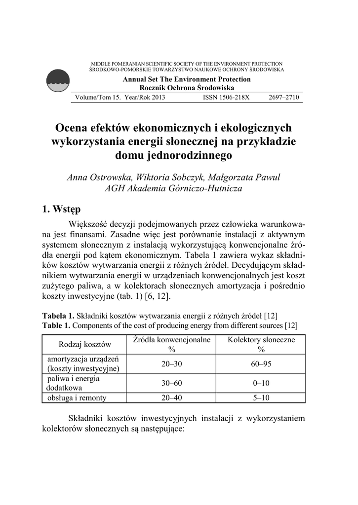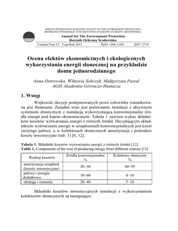 MIDDLE POMERANIAN SCIENTIFIC SOCIETY OF THE ENVIRONMENT PROTECTION ŚRODKOWO-POMORSKIE TOWARZYSTWO NAUKOWE OCHRONY ŚRODOWISKA Annual Set The Environment Protection Rocznik Ochrona Środowiska Volume/Tom 15. Year/Rok 2013 ISSN 1506-218X 2697–2710 Ocena efektów ekonomicznych i ekologicznych wykorzystania energii słonecznej na przykładzie domu jednorodzinnego Anna Ostrowska, Wiktoria Sobczyk, Małgorzata Pawul AGH Akademia Górniczo-Hutnicza 1. Wstęp Większość decyzji podejmowanych przez człowieka warunkowana jest finansami. Zasadne więc jest porównanie instalacji z aktywnym systemem słonecznym z instalacją wykorzystującą konwencjonalne źródła energii pod kątem ekonomicznym. Tabela 1 zawiera wykaz składników kosztów wytwarzania energii z różnych źródeł. Decydującym składnikiem wytwarzania energii w urządzeniach konwencjonalnych jest koszt zużytego paliwa, a w kolektorach słonecznych amortyzacja i pośrednio koszty inwestycyjne (tab. 1) [6, 12]. Tabela 1. Składniki kosztów wytwarzania energii z różnych źródeł [12] Table 1. Components of the cost of producing energy from different sources [12] Rodzaj kosztów amortyzacja urządzeń (koszty inwestycyjne) paliwa i energia dodatkowa obsługa i remonty Źródła konwencjonalne % Kolektory słoneczne % 20–30 60–95 30–60 0–10 20–40 5–10 Składniki kosztów inwestycyjnych instalacji z wykorzystaniem kolektorów słonecznych są następujące: 2698 Anna Ostrowska, Wiktoria Sobczyk, Małgorzata Pawul kolektory słoneczne 30–50%, rury, kanały, izolacja 25–30%, zasobnik wodny lub kamienny magazyn energii 20–25%, pompy, wentylator i urządzenia sterujące 5–15%. Opłacalność funkcjonowania instalacji słonecznej zależy od jej zastosowania, przyjętego rozwiązania technicznego kolektora słonecznego oraz od metody wykonania i montażu danej instalacji. Dla konwencjonalnych źródeł energii nawet do 60% stanowią koszty poniesione na paliwo [2, 5]. Warto więc porównać koszty uzyskania jednostki energii przy wykorzystaniu różnych źródeł (tab. 2). Tabela 2. Koszt uzyskania ciepła z różnych nośników [13] Table 2. The cost of obtaining heat from various media [13] nośnik energii energia elektryczna gaz płynny propan gaz ziemny olej opałowy węgiel kamienny kolektory słoneczne cena jednostkowa – 1,50 zł/m3 1,42 zł/m3 1,40 zł/l 0,41 zł/kg – koszt uzyskania 1 kWh energii [zł] 0,410 0,255 0,152 0,147 0,091 0,008 Wykorzystanie kolektorów słonecznych powoduje obniżenie kosztów uzyskania jednostki energii. W przyszłości poniesione koszty inwestycyjne zwrócą się w postaci zaoszczędzonej energii, a w efekcie w postaci kosztu zaoszczędzonych nośników kopalnych. Warto również zauważyć, że korzystanie z energii słonecznej na własne potrzeby nie jest opodatkowane [13]. 2. Opis przykładowego budynku i instalacji c.w.u. Ocenę efektów ekonomicznych i ekologicznych wykorzystania energii słonecznej przeprowadzono na przykładzie instalacji do podgrzewania c.w.u. z zastosowaniem kolektorów słonecznych. Budynek będący przedmiotem badań to dom parterowy z poddaszem użytkowym, z garażem jednostanowiskowym, niepodpiwniczony, przeznaczony dla 4osobowej rodziny. Zwarta bryła budynku sprzyja energooszczędności, Ocena efektów ekonomicznych i ekologicznych wykorzystania energii… 2699 a ergonomiczny układ pomieszczeń maksymalnie wykorzystuje przestrzeń użytkową [3]. Strefa dzienna została zaprojektowana na parterze. Tworzy ją salon z kominkiem, jadalnia oraz otwarta kuchnia. Znajdują się tu również mała łazienka, kotłownia i garaż. Na poddaszu zaplanowano strefę nocną z trzema sypialniami i łazienką. Rys. 1. Wizualizacja projektu domu i schemat przekroju [3] Fig. 1. Visualization of house design and schematic cross-section [3] Rys. 2. Schemat instalacji do podgrzewania c.w.u. [4] Fig. 2. Diagram of installation to heat the hot utility water [4] 2700 Anna Ostrowska, Wiktoria Sobczyk, Małgorzata Pawul Omawiany budynek charakteryzują następujące parametry: powierzchnia użytkowa: 99,55 m2, wysokość budynku: 8,4 m, kąt nachylenia dachu: 45o, powierzchnia dachu: 144,8 m2. Na potrzeby niniejszego artykułu budynek ulokowany został na osiedlu domków jednorodzinnych przy ulicy Michałki w Michałowicach w województwie małopolskim, około 10 km na północ od centrum Krakowa. Wartości nasłonecznienia są niezbędne przy doborze instalacji solarnej. Dla gminy Michałowice przyjęto wartości nasłonecznienia najbliżej położonego dużego miasta, jakim jest Kraków. Schemat instalacji do podgrzewania ciepłej wody użytkowej (c.w.u.) przedstawiono na rysunku 2. 3. Podstawy teoretyczne projektowania instalacji z kolektorem słonecznym do podgrzania c.w.u. Zapotrzebowanie na ciepłą wodę użytkową Zapotrzebowanie na ciepłą wodę użytkową przyjmuje się według niemieckich wytycznych VDI 2067. Obliczenia wykonuje się przy założeniu 45°C jako temperatury ciepłej wody użytkowej, a dzienne zapotrzebowanie na jednego mieszkańca przedstawia tab. 3. Tabela 3. Zapotrzebowanie c.w.u 2067 w budownictwie mieszkaniowym [4] Table 3. Water demand in the housing sector in 2067 [4] Stopień wymagań wysokie średnie zwykłe Zapotrzebowanie c.w.u. [dm3/(dzień·osoba)] temperatura c.w.u. 45°C 60–100 30–60 15–30 Zakładamy, że dla omawianego przypadku stopień wymagań jest średni i zapotrzebowanie na c.w.u. wynosi 50 dm3 dziennie na osobę. Dla 4-osobowej rodziny dzienne zapotrzebowanie wynosi 4·50 dm3, czyli 200 dm3. Dobór i ustawienie kolektorów Właściwie dobrana instalacja z kolektorem słonecznym do podgrzewania c.w.u. w klimacie umiarkowanym powinna pokrywać potrze- Ocena efektów ekonomicznych i ekologicznych wykorzystania energii… 2701 by użytkownika maksymalnie w 70% (1,5 m2 powierzchni kolektora na jednego mieszkańca) [9]. Błędne jest przyjęcie założenia, że instalacja słoneczna ma pokryć w 100% zapotrzebowa