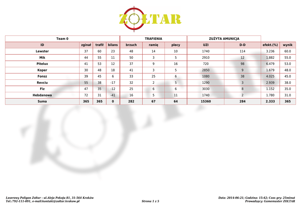 Team 0 TRAFIENIA ZUŻYTA AMUNICJA ID zginał trafił bilans brzuch ramię plecy UZI D-D efekt.(%) wynik Lewster 37 60 23 48 14 10 1740 114 3.236 60.0 Mik 44 55 11 50 3 5 2910 12 1.882 55.0 Pitelux 41 53 12 37 9 16 720 98 6.479 53.0 Koper 30 48 18 41 3 5 2850 9 1.679 48.0 Fonsz 39 45 6 33 25 6 1080 38 4.025 45.0 Revciu 55 38 -17 32 2 5 1290 3 2.939 38.0 Fiz 47 35 -12 25 6 6 3030 8 1.152 35.0 Hebdanowa 72 31 -41 16 5 11 1740 2 1.780 31.0 Suma 365 365 0 282 67 64 15360 284 2.333 365 Laserowy Poligon Zoltar - ul.Aleja Pokoju 81, 31-564 Kraków Tel.:792-111-091, e-mail:[email protected] Strona 1 z 5 Data: 2014-06-21; Godzina: 15:42; Czas gry: 25minut Prowadzący: Gamemaster ZOLTAR Team 1 TRAFIENIA ZUŻYTA AMUNICJA FR FIRE x100 % ID zginał trafił bilans brzuch ramię plecy UZI D-D Mhgun Shg Snp Fonsz 16 28 15 19 22 5 30 62 0 0 0 0 Mik 16 20 -1 17 2 1 2220 0 570 1 0 Hebdanowa 23 17 -7 10 4 3 1410 0 0 0 Koper 20 15 -10 12 1 2 630 0 420 Suma 75 80 -3 58 29 11 4290 62 990 Team 2 TRAFIENIA ATank efekt.(%) pkt - pkt + wynik 30.435 0.0 28.0 28.0 0 0.502 3.0 17.0 14.0 0 0 0.922 2.0 15.0 13.0 6 71 4 0.796 3.0 12.0 9.0 7 71 4 1.180 8 72 64 ZUŻYTA AMUNICJA FR FIRE x100 % ID zginał trafił bilans brzuch ramię plecy UZI D-D Mhgun Shg Snp Lewster 25 25 -4 16 5 4 2670 41 0 0 0 0 Revciu 20 18 -3 14 1 4 1500 0 0 0 0 Pitelux 20 17 -3 13 1 3 0 0 720 16 Fiz 16 16 -4 10 3 3 2730 0 0 Suma 81 76 -14 53 10 14 6900 41 720 Laserowy Poligon Zoltar - ul.Aleja Pokoju 81, 31-564 Kraków Tel.:792-111-091, e-mail:[email protected] Team 1 Team 2 64 58 Strona 2 z 5 ATank efekt.(%) pkt - pkt + wynik 0.701 3.0 22.0 19.0 0 1.067 1.0 17.0 16.0 21 4 1.708 2.0 15.0 13.0 0 0 0 0.366 3.0 13.0 10.0 16 21 4 0.753 9 67 58 Data: 2014-06-21; Godzina: 16:28; Czas gry: 25minut Prowadzący: Gamemaster ZOLTAR Drużyny Miejsce Laserowy Poligon Zoltar - ul.Aleja Pokoju 81, 31-564 Kraków Tel.:792-111-091, e-mail:[email protected] Rozgrywki Nazwa 1 2 Suma Team 1 - 64 64 Team 2 - 58 58 Strona 3 z 5 Data: 2014-06-21 Prowadzący: Gamemaster ZOLTAR Zestawienie wg wyniku Miejsce TRAFIENIA ZUŻYTA AMUNICJA ID zginał trafił bilans brzuch ramię plecy UZI D-D Mhgun Shg Snp aTank efekt.(%) pkt - pkt + wynik Lewster 74.40 102.00 20.40 76.80 22.80 16.80 5292.00 186.00 0.00 0.00 0.00 0.00 1.731 3.60 98.40 94.80 Fonsz 66.00 87.60 21.60 62.40 56.40 13.20 1332.00 120.00 0.00 0.00 0.00 0.00 6.033 0.00 87.60 87.60 Mik 72.00 90.00 10.80 80.40 6.00 7.20 6156.00 14.40 684.00 1.20 0.00 0.00 1.208 3.60 86.40 82.80 4 Pitelux 73.20 84.00 6.00 60.00 12.00 22.80 864.00 117.60 864.00 19.20 25.20 4.80 4.180 2.40 81.60 79.20 5 Koper 60.00 75.60 8.40 63.60 4.80 8.40 4176.00 10.80 504.00 7.20 85.20 4.80 1.429 3.60 72.00 68.40 6 Revciu 90.00 67.20 -25.20 55.20 3.60 10.80 3348.00 3.60 0.00 0.00 0.00 0.00 1.933 1.20 66.00 64.80 7 Fiz 75.60 61.20 -21.60 42.00 10.80 10.80 6912.00 9.60 0.00 0.00 0.00 0.00 0.780 3.60 57.60 54.00 8 Hebdanowa 114.00 57.60 -61.20 31.20 10.80 16.80 3780.00 2.40 0.00 0.00 0.00 0.00 1.396 2.40 55.20 52.80 Zestawienie wg bilansu Miejsce TRAFIENIA ZUŻYTA AMUNICJA ID zginał trafił bilans brzuch ramię plecy UZI D-D Mhgun Shg Snp aTank efekt.(%) pkt - pkt + wynik Fonsz 66.00 87.60 21.60 62.40 56.40 13.20 1332.00 120.00 0.00 0.00 0.00 0.00 6.033 0.00 87.60 87.60 Lewster 74.40 102.00 20.40 76.80 22.80 16.80 5292.00 186.00 0.00 0.00 0.00 0.00 1.731 3.60 98.40 94.80 Mik 72.00 90.00 10.80 80.40 6.00 7.20 6156.00 14.40 684.00 1.20 0.00 0.00 1.208 3.60 86.40 82.80 4 Koper 60.00 75.60 8.40 63.60 4.80 8.40 4176.00 10.80 504.00 7.20 85.20 4.80 1.429 3.60 72.00 68.40 5 Pitelux 73.20 84.00 6.00 60.00 12.00 22.80 864.00 117.60 864.00 19.20 25.20 4.80 4.180 2.40 81.60 79.20 6 Fiz 75.60 61.20 -21.60 42.00 10.80 10.80 6912.00 9.60 0.00 0.00 0.00 0.00 0.780 3.60 57.60 54.00 7 Revciu 90.00 67.20 -25.20 55.20 3.60 10.80 3348.00 3.60 0.00 0.00 0.00 0.00 1.933 1.20 66.00 64.80 8 Hebdanowa 114.00 57.60 -61.20 31.20 10.80 16.80 3780.00 2.40 0.00 0.00 0.00 0.00 1.396 2.40 55.20 52.80 Laserowy Poligon Zoltar - ul.Aleja Pokoju 81, 31-564 Kraków Tel.:792-111-091, e-mail:[email protected] Strona 4 z 5 Data: 2014-06-21 Prowadzący: Gamemaster ZOLTAR Zestawienie wg efektywności Miejsce TRAFIENIA ZUŻYTA AMUNICJA ID zginał trafił bilans brzuch ramię plecy UZI D-D Mhgun Shg Snp aTank efekt.(%) pkt - pkt + wynik Fonsz 66.00 87.60 21.60 62.40 56.40 13.20 1332.00 120.00 0.00 0.00 0.00 0.00 6.033 0.00 87.60 87.60 Pitelux 73.20 84.00 6.00 60.00 12.00 22.80 864.00 117.60 864.00 19.20 25.20 4.80 4.180 2.40 81.60 79.20 Revciu 90.00 67.20 -25.20 55.20 3.60 10.80 3348.00 3.60 0.00 0.00 0.00 0.00 1.933 1.20 66.00 64.80 4 Lewster 74.40 102.00 20.40 76.80 22.80 16.80 5292.00 186.00 0.00 0.00 0.00 0.00 1.731 3.60 98.40 94.80 5 Koper 60.00 75.60 8.40 63.60 4.80 8.40 4176.00 10.80 504.00 7.20 85.20 4.80 1.429 3.60 72.00 68.40 6 Hebdanowa 114.00 57.60 -61.20 31.20 10.80 16.80 3780.00 2.40 0.00 0.00 0.00 0.00 1.396 2.40 55.20 52.80 7 Mik 72.00 90.00 10.80 80.40 6.00 7.20 6156.00 14.40 684.00 1.20 0.00 0.00 1.208 3.60 86.40 82.80 8 Fiz 75.60 61.20 -21.60 42.00 10.80 10.80 6912.00 9.60 0.00 0.00 0.00 0.00 0.780 3.60 57.60 54.00 Laserowy Poligon Zoltar - ul.Aleja Pokoju 81, 31-564 Kraków Tel.:792-111-091, e-mail:[email protected] Strona 5 z 5 Data: 2014-06-21 Prowadzący: Gamemaster ZOLTAR