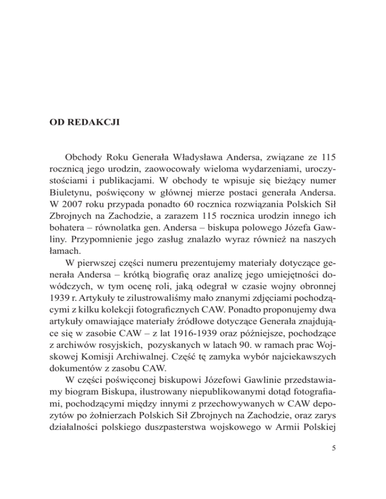 OD REDAKCJI Obchody Roku Generała Władysława Andersa, związane ze 115 rocznicą jego urodzin, zaowocowały wieloma wydarzeniami, uroczystościami i publikacjami. W obchody te wpisuje się bieżący numer Biuletynu, poświęcony w głównej mierze postaci generała Andersa. W 2007 roku przypada ponadto 60 rocznica rozwiązania Polskich Sił Zbrojnych na Zachodzie, a zarazem 115 rocznica urodzin innego ich bohatera – równolatka gen. Andersa – biskupa polowego Józefa Gawliny. Przypomnienie jego zasług znalazło wyraz również na naszych łamach. W pierwszej części numeru prezentujemy materiały dotyczące generała Andersa – krótką biografię oraz analizę jego umiejętności dowódczych, w tym ocenę roli, jaką odegrał w czasie wojny obronnej 1939 r. Artykuły te zilustrowaliśmy mało znanymi zdjęciami pochodzącymi z kilku kolekcji fotograficznych CAW. Ponadto proponujemy dwa artykuły omawiające materiały źródłowe dotyczące Generała znajdujące się w zasobie CAW – z lat 1916-1939 oraz późniejsze, pochodzące z archiwów rosyjskich, pozyskanych w latach 90. w ramach prac Wojskowej Komisji Archiwalnej. Część tę zamyka wybór najciekawszych dokumentów z zasobu CAW. W części poświęconej biskupowi Józefowi Gawlinie przedstawiamy biogram Biskupa, ilustrowany niepublikowanymi dotąd fotografiami, pochodzącymi między innymi z przechowywanych w CAW depozytów po żołnierzach Polskich Sił Zbrojnych na Zachodzie, oraz zarys działalności polskiego duszpasterstwa wojskowego w Armii Polskiej 5 w ZSRR i II Korpusie Polskim generała Andersa. Zwieńczeniem tej części jest wybór dokumentów pochodzących z Archiwum Katedry Polowej Wojska Polskiego. Mamy nadzieję, że zamieszczone materiały, szczególnie źródłowe, zainteresują naszych czytelników i poszerzą wiedzę o ludziach, którzy pozostawili trwały ślad w historii Polski. 6
