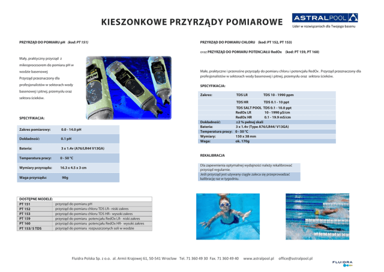 KIESZONKOWE PRZYRZĄDY POMIAROWE PRZYRZĄD DO POMIARU pH (kod: PT 151) Lider w rozwiązaniach dla Twojego basenu PRZYRZĄD DO POMIARU CHLORU (kod: PT 152, PT 153) oraz PRZYRZĄD DO POMIARU POTENCJAŁU RedOx (kod: PT 159, PT 160) Mały, praktyczny przyrząd z mikroprocesorem do pomiaru pH w Małe, praktyczne i przenośne przyrządy do pomiaru chloru i potencjału RedOx . Przyrząd przeznaczony dla profesjonalistów w sektorach wody basenowej i pitnej, przemysłu oraz sektora ścieków. wodzie basenowej Przyrząd przeznaczony dla profesjonalistów w sektorach wody SPECYFIKACJA: basenowej i pitnej, przemysłu oraz Zakres: sektora ścieków. SPECYFIKACJA: Zakres pomiarowy: 0.0 - 14.0 pH Dokładność: 0.1 pH Bateria: 3 x 1.4v (A76/LR44 V13GA) Temperatura pracy: 0 - 50 °C Wymiary przyrządu: 16.3 x 4.5 x 3 cm Waga przyrządu: DOSTĘPNE MODELE: PT 151 PT 152 PT 153 PT 159 PT 160 PT 153/ S TDS 90g TDS LR TDS 10 - 1990 ppm TDS HR TDS 0.1 - 10 ppt TDS SALT POOL TDS 0.1 - 10.0 ppt RedOx LR 10 - 1990 μS/cm RedOx HR 0.1 - 19.9 mS/cm Dokładność: ±2 % pełnej skali Bateria: 3 x 1.4v (Type A76/LR44/ V13GA) Temperatura pracy: 0 - 50 °C Wymiary: 150 x 38 mm Waga: ok. 170g REKALIBRACJA Dla zapewnienia optymalnej wydajności należy rekalibrować przyrząd regularnie. Jeśli przyrząd jest używany ciągle zaleca się przeprowadzać kalibrację raz w tygodniu. przyrząd do pomiaru pH przyrząd do pomiaru chloru TDS LR– niski zakres przyrząd do pomiaru chloru TDS HR– wysoki zakres przyrząd do pomiaru potencjału RedOx LR- niski zakres przyrząd do pomiaru potencjału RedOx HR- wysoki zakres przyrząd do pomiaru rozpuszczonych soli w wodzie Fluidra Polska Sp. z o.o. al. Armii Krajowej 61, 50-541 Wrocław Tel. 71 360 49 30 Fax. 71 360 49 40 www.astralpool.pl [email protected] KIESZONKOWE PRZYRZĄDY POMIAROWE • Ulepszone właściwości dzięki zastosowaniu filtra wąskiego pasma światła • Uniwersalne symbole • Duży wyświetlacz ciekłokrystaliczny • Dłuższa cela pomiarowa, wspaniałe właściwości pomiarowe przy niskiej koncentracji. POOLTEST 3 Regularne sprawdzanie parametrów wody basenowej jest podstawowym działaniem dla utrzymania prawidłowego pH oraz efektywnej dezynfekcji wody basenowej. Urządzenie Pooltest 3 jest idealnym rozwiązaniem pozwalającym kontrolować 3 najważniejsze parametry wody basenowej. Głównymi zaletami urządzenia jest szybkość i precyzja pomiaru oraz niezawodność działania. Lider w rozwiązaniach dla Twojego basenu Urządzenie posiada automatyczny system rozpoznawania próbki zerowej i programowania punktu ZERO , oraz przechowuje w pamięci 10 ostatnich pomiarów. PARAMETRY TECHNICZNE TYP: bezpośredni odczyt kolorymetru, podwójna długość fali OPTYKA: źródło światła Palintest dual LED z filtrem wąskiego pasma światła oraz fotodetektorem DŁUGOŚĆ FAL: automatyczny wybór 530 i 575 nm TOLERANCJA: +/- 2 nm WŁAŚCIWOŚCI: FILTR SZEROKOŚCI PASMA: 10 nm • Pomiar zawartości: chloru wolnego, pH oraz kwasu cyjanurowego; • Solidna , wodoodporna obudowa , IP 67 WYŚWIETLACZ LCD: 128 x 65 pixeli TEMPERATURA WODY: 0 - 50°C KOMORA TESTOWA: rurka d 25 mm • Łatwy w użyciu ( 4 intuicyjne przyciski) USTAWIENIA: przechowywanie w pamięci lub RESET dla każdego z odczytów • Idealny do codziennej kontroli stanu wody basenowej ZASILANIE: 2 X 1,5 V „baterie AA” automatyczne wyłączanie • Dostępna wersja z rozszerzonym zakresem pomiarowym chloru (0,01 – 10 mg/l) WYMIARY: 150 x 65 x 40 mm WAGA: 200 g ( z bateriami) Fluidra Polska Sp. z o.o. al. Armii Krajowej 61, 50-541 Wrocław Tel. 71 360 49 30 Fax. 71 360 49 40 www.astralpool.pl [email protected] KIESZONKOWE PRZYRZĄDY POMIAROWE Lider w rozwiązaniach dla Twojego basenu Reagenty ( 1 karton z reagentami) – DPD 1, DPD 3 , pH, kwas cyjanurowy. D – standardowy zakres pomiarowy; X – rozszerzony zakres pomiarowy REAGENTY URZĄDZENIE – kod SPC 006 TEST ZAKRES (mg/l) OPAKOWANIE ( 50 SZTUK) OPAKOWANIE ( 250 SZTUK) Chlor wolny (DPD 1) 0,01 – 5,0 PM 011 AP 011 Chlor całkowity (DPD 3) 0,01 – 5,0 PM 031 AP 031 SZCZOTECZKA DO CZYSZCZENIA MENZUREK – PT 663 0,01 – 10,0 PM 013 AP 013 PRĘCIKI DO ROZDRABNIANIA (10 SZTUKI) – PT 502 0,01 – 10,0 PM 033 AP 033 Kwas cyjanurowy 2 - 200 PM 087 AP 087 pH 6,8 – 8,4 PM 130 AP 130 Chlor wolny (DPD 1) – rozszerzony zakres Chlor wolny i całkowity (DPD 1 i DPD 3) – rozszerzony zakres MENZURKI ( 5 SZTUK) – PT 555 ZESTAWY ZESTAW W TWARDEJ ODBUDOWIE – kod SPH 003D , SPH 003X Urządzenie POOLTEST 3 , Instrukcja, 4 pręciki do rozdrabniania, Szczoteczka do czyszczenie menzurek testowych, 4 menzurki Reagenty ( 4 kartony po 100 reagentów w kartonie) – DPD 1, DPD 3 , pH, kwas cyjanurowy. ZESTAW W MIĘKKIEJ ODBUDOWIE – kod SPS 003D , SPS 003X Urządzenie POOLTEST 3 , Instrukcja, 4 pręciki do rozdrabniania, Szczoteczka do czyszczenie menzurek testowych, 2 menzurki Fluidra Polska Sp. z o.o. al. Armii Krajowej 61, 50-541 Wrocław Tel. 71 360 49 30 Fax. 71 360 49 40 www.astralpool.pl [email protected]