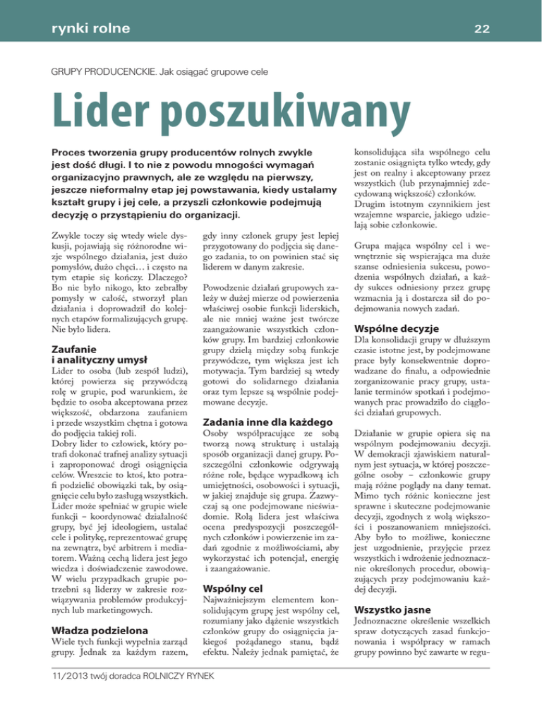 rynki rolne 22 GRUPY PRODUCENCKIE. Jak osiągać grupowe cele Lider poszukiwany Proces tworzenia grupy producentów rolnych zwykle jest dość długi. I to nie z powodu mnogości wymagań organizacyjno prawnych, ale ze względu na pierwszy, jeszcze nieformalny etap jej powstawania, kiedy ustalamy kształt grupy i jej cele, a przyszli członkowie podejmują decyzję o przystąpieniu do organizacji. Zwykle toczy się wtedy wiele dyskusji, pojawiają się różnorodne wizje wspólnego działania, jest dużo pomysłów, dużo chęci… i często na tym etapie się kończy. Dlaczego? Bo nie było nikogo, kto zebrałby pomysły w całość, stworzył plan działania i doprowadził do kolejnych etapów formalizujących grupę. Nie było lidera. Zaufanie i analityczny umysł Lider to osoba (lub zespół ludzi), której powierza się przywódczą rolę w grupie, pod warunkiem, że będzie to osoba akceptowana przez większość, obdarzona zaufaniem i przede wszystkim chętna i gotowa do podjęcia takiej roli. Dobry lider to człowiek, który potrafi dokonać trafnej analizy sytuacji i zaproponować drogi osiągnięcia celów. Wreszcie to ktoś, kto potrafi podzielić obowiązki tak, by osiągnięcie celu było zasługą wszystkich. Lider może spełniać w grupie wiele funkcji ‒ koordynować działalność grupy, być jej ideologiem, ustalać cele i politykę, reprezentować grupę na zewnątrz, być arbitrem i mediatorem. Ważną cechą lidera jest jego wiedza i doświadczenie zawodowe. W wielu przypadkach grupie potrzebni są liderzy w zakresie rozwiązywania problemów produkcyjnych lub marketingowych. Władza podzielona Wiele tych funkcji wypełnia zarząd grupy. Jednak za każdym razem, gdy inny członek grupy jest lepiej przygotowany do podjęcia się danego zadania, to on powinien stać się liderem w danym zakresie. Powodzenie działań grupowych zależy w dużej mierze od powierzenia właściwej osobie funkcji liderskich, ale nie mniej ważne jest twórcze zaangażowanie wszystkich członków grupy. Im bardziej członkowie grupy dzielą między sobą funkcje przywódcze, tym większa jest ich motywacja. Tym bardziej są wtedy gotowi do solidarnego działania oraz tym lepsze są wspólnie podejmowane decyzje. konsolidująca siła wspólnego celu zostanie osiągnięta tylko wtedy, gdy jest on realny i akceptowany przez wszystkich (lub przynajmniej zdecydowaną większość) członków. Drugim istotnym czynnikiem jest wzajemne wsparcie, jakiego udzielają sobie członkowie. Grupa mająca wspólny cel i wewnętrznie się wspierająca ma duże szanse odniesienia sukcesu, powodzenia wspólnych działań, a każdy sukces odniesiony przez grupę wzmacnia ją i dostarcza sił do podejmowania nowych zadań. Wspólne decyzje Dla konsolidacji grupy w dłuższym czasie istotne jest, by podejmowane prace były konsekwentnie doprowadzane do finału, a odpowiednie zorganizowanie pracy grupy, ustalanie terminów spotkań i podejmowanych prac prowadziło do ciągłości działań grupowych. Zadania inne dla każdego Osoby współpracujące ze sobą tworzą nową strukturę i ustalają sposób organizacji danej grupy. Poszczególni członkowie odgrywają różne role, będące wypadkową ich umiejętności, osobowości i sytuacji, w jakiej znajduje się grupa. Zazwyczaj są one podejmowane nieświadomie. Rolą lidera jest właściwa ocena predyspozycji poszczególnych członków i powierzenie im zadań zgodnie z możliwościami, aby wykorzystać ich potencjał, energię i zaangażowanie. Wspólny cel Najważniejszym elementem konsolidującym grupę jest wspólny cel, rozumiany jako dążenie wszystkich członków grupy do osiągnięcia jakiegoś pożądanego stanu, bądź efektu. Należy jednak pamiętać, że 11/2013 twój doradca ROLNICZY RYNEK Działanie w grupie opiera się na wspólnym podejmowaniu decyzji. W demokracji zjawiskiem naturalnym jest sytuacja, w której poszczególne osoby ‒ członkowie grupy mają różne poglądy na dany temat. Mimo tych różnic konieczne jest sprawne i skuteczne podejmowanie decyzji, zgodnych z wolą większości i poszanowaniem mniejszości. Aby było to możliwe, konieczne jest uzgodnienie, przyjęcie przez wszystkich i wdrożenie jednoznacznie określonych procedur, obowiązujących przy podejmowaniu każdej decyzji. Wszystko jasne Jednoznaczne określenie wszelkich spraw dotyczących zasad funkcjonowania i współpracy w ramach grupy powinno być zawarte w regu- rynki rolne laminach wewnętrznych przyjętych przez Walne Zgromadzenie organizacji i podpisane przez wszystkich członków. Regulaminy te nie podlegają rejestracji, a stanowią jedynie wewnętrzne uregulowania pracy grupy. Powinny one obejmować wszelkie obszary jej działania i funkcjonowania. Każdy ma prawo być wysłuchany W każdej grupie występują różnice zdań, wypowiedzi krytyczne oraz inne zjawiska potencjalnie zagrażające spójności organizacji. Chcąc im zapobiec, grupa powinna być otwarta na nowe pomysły, rozwiązania czy słowa krytyki. Przyjęcie zasady, że każdy ma prawo się wypowiedzieć i każdy ma prawo być wysłuchany, umożliwia dyskusję i rozwiązywanie 23 problemów. Rolą lidera w tej sytuacji jest zapanowanie nad różnicą zdań i konstruktywne rozwiązanie problemu. Jednym z głównych czynników utrudniających pracę grupy jest brak dyscypliny członków, wyrażający się podejmowaniem przez pojedyncze osoby, decyzji np. o sprzedaży produktów wbrew przyjętym w grupie zasadom. Brak dyscypliny może też wyrażać się nieuczestniczeniem w zebraniach grupy, niewywiązywaniem się z przyjętych zobowiązań, niepłaceniem ustalonych składek na pokrycie kosztów funkcjonowania grupy itp. Grupowe ADHD Problemem może stać się też nadmierna aktywność członków grupy, wyrażająca się zgłaszaniem zbyt dużej liczby pomysłów na wspólne działanie. Skutkiem realizacji kilku zadań jednocześnie jest niebezpieczeństwo zatracenia głównego celu grupy. 
