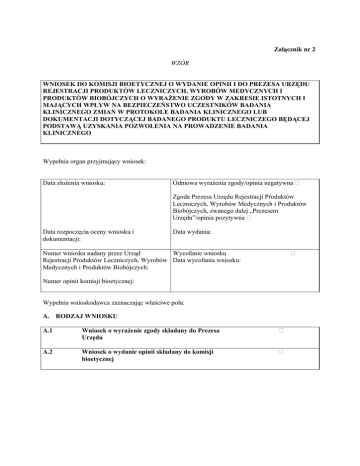 Załącznik nr 2 WZÓR WNIOSEK DO KOMISJI BIOETYCZNEJ O WYDANIE OPINII I DO PREZESA URZĘDU REJESTRACJI PRODUKTÓW LECZNICZYCH, WYROBÓW MEDYCZNYCH I PRODUKTÓW BIOBÓJCZYCH O WYRAŻENIE ZGODY W ZAKRESIE ISTOTNYCH I MAJĄCYCH WPŁYW NA BEZPIECZEŃSTWO UCZESTNIKÓW BADANIA KLINICZNEGO ZMIAN W PROTOKOLE BADANIA KLINICZNEGO LUB DOKUMENTACJI DOTYCZĄCEJ BADANEGO PRODUKTU LECZNICZEGO BĘDĄCEJ PODSTAWĄ UZYSKANIA POZWOLENIA NA PROWADZENIE BADANIA KLINICZNEGO Wypełnia organ przyjmujący wniosek: Data złożenia wniosku: Odmowa wyrażenia zgody/opinia negatywna Zgoda Prezesa Urzędu Rejestracji Produktów Leczniczych, Wyrobów Medycznych i Produktów Biobójczych, zwanego dalej „Prezesem Urzędu”/opinia pozytywna Data rozpoczęcia oceny wniosku i dokumentacji: Data wydania: Wycofanie wniosku Numer wniosku nadany przez Urząd Rejestracji Produktów Leczniczych, Wyrobów Data wycofania wniosku: Medycznych i Produktów Biobójczych: Numer opinii komisji bioetycznej: Wypełnia wnioskodawca zaznaczając właściwe pola: A. RODZAJ WNIOSKU A.1 Wniosek o wyrażenie zgody składany do Prezesa Urzędu A.2 Wniosek o wydanie opinii składany do komisji bioetycznej B. DANE IDENTYFIKACYJNE BADANIA KLINICZNEGO B.1 Czy zmiany dotyczą więcej niż jednego badania klinicznego w zakresie tego samego badanego produktu leczniczego? tak B.1.1 Jeżeli „tak”, należy powtórzyć część. B.2 Numer EudraCT: B.3 Pełny tytuł badania klinicznego: B.4 Numer kodowy protokołu sponsora, numer wersji i jej data: nie C. DANE IDENTYFIKACYJNE SPONSORA ODPOWIEDZIALNEGO ZA ZŁOŻENIE WNIOSKU C.1 Sponsor C.1.1 Imię i nazwisko/nazwa: C.1.2 Imię i nazwisko osoby kontaktowej: C.1.3 Adres/siedziba: C.1.4 Numer telefonu: C.1.5 Numer faksu: C.1.6 Adres poczty elektronicznej: C.2 Prawny przedstawiciel sponsora1) w zakresie badania klinicznego C.2.1 Imię i nazwisko/nazwa: C.2.2 Imię i nazwisko osoby kontaktowej: C.2.3 Adres/siedziba: C.2.4 Numer telefonu: C.2.5 Numer faksu: C.2.6 Adres poczty elektronicznej: D. DANE IDENTYFIKACYJNE SKŁADAJĄCEGO WNIOSEK D.1 Wniosek do Prezesa Urzędu D.1.1 Sponsor: D.1.2 Prawny przedstawiciel sponsora: D.1.3 Pełnomocnik upoważniony przez sponsora do złożenia wniosku: D.1.4 Dane osoby składającej wniosek: D.1.4.1 Imię i nazwisko/nazwa: D.1.4.2 Imię i nazwisko osoby kontaktowej: D.1.4.3 Adres/siedziba: D.1.4.4 Numer telefonu: D.1.4.5 Numer faksu: D.1.4.6 Adres poczty elektronicznej: D.2 Wniosek do komisji bioetycznej D.2.1 Sponsor D.2.2 Prawny przedstawiciel sponsora D.2.3 Pełnomocnik upoważniony przez sponsora do złożenia wniosku D.2.4 Dane osoby składającej wniosek: D.2.4.1 Imię i nazwisko/nazwa: D.2.4.2 Adres/siedziba: D.2.4.3 Numer telefonu: D.2.4.4 Numer faksu: D.2.5 Adres poczty elektronicznej: E. ZAKRES ZMIAN E.1 Numer kodowy zmiany sponsora, numer wersji i jej data: E.2 Rodzaj zmian: E.2.1 Zmiany w zakresie informacji zawartych we wniosku o rozpoczęcie badania klinicznego tak nie E.2.2 Zmiany w protokole badania klinicznego tak nie E.2.3 Zmiany w dokumentacji dołączonej do wniosku o rozpoczęcie badania klinicznego tak nie E.2.3.1 Jeżeli „tak”, należy podać: E.2.4 Zmiany w innych dokumentach lub informacjach tak nie E.2.4.1 Jeżeli „tak”, należy podać: E.2.5 Zmiany głównie w zakresie podjętych pilnych środków bezpieczeństwa tak nie E.2.6 Przekazanie informacji o tymczasowym zawieszeniu badania klinicznego tak nie E.2.7 Wniosek w celu uzyskania pozwolenia na ponowne rozpoczęcie badania klinicznego tak nie E.3 Uzasadnienie zmian: E.3.1 Zmiany dotyczące bezpieczeństwa i integralności uczestników badania klinicznego tak nie E.3.2 Zmiany dotyczące interpretacji dokumentacji naukowej/wartości badania klinicznego tak nie E.3.3 Zmiany dotyczące jakości badanego produktu leczniczego tak nie E.3.4 Zmiany w zakresie prowadzenia lub zarządzania badaniem klinicznym tak nie E.3.5 Zmiana lub dodanie nowego badacza lub koordynatora badania tak nie E.3.6 Zmiana/dodanie nowego ośrodka badawczego tak nie E.3.7 Inne zmiany tak nie E.3.7.1 Jakie: E.3.8. Inny przypadek tak nie E.3.8.1 Jaki: E.4 Informacje o tymczasowym zawieszeniu badania klinicznego E.4.1 Data tymczasowego zawieszenia badania klinicznego (RRRR/MM/DD): E.4.2 Wstrzymanie rekrutacji tak nie E.4.3 Wstrzymanie leczenia tak nie E.4.4 Liczba uczestników badania klinicznego, którym nadal podawany jest badany produkt leczniczy w chwili zawieszenia badania klinicznego na terytorium Rzeczypospolitej Polskiej E.4.5 Krótki opis (słowny): * Uzasadnienie tymczasowego zawieszenia badania klinicznego * Proponowany sposób opieki nad uczestnikami badania klinicznego, którym nadal podawany jest badany produkt leczniczy w chwili zawieszenia badania klinicznego (opis słowny): * Wpływ tymczasowego zawieszenia badania klinicznego, na ocenę wyników badania oraz ogólne oszacowanie stosunku korzyści do ryzyka dla badanego produktu leczniczego (opis słowny): F. KRÓTKI OPIS ZMIAN (opis słowny) Poprzednie brzmienie Nowe brzmienie Komentarze/wyjaśnienia/powody dokonania istotnych zmian G. ZMIANA OŚRODKA(-ÓW) BADAWCZEGO/BADACZA(-Y) UCZESTNICZĄCYCH W BADANIU KLINICZNYM NA TERYTORIUM RZECZYPOSPOLITEJ POLSKIEJ G.1 Rodzaj zmian G.1.1 Dodanie nowego ośrodka: G.1.1.1 Badacz: G.1.1.1.1 Imię: G.1.1.1.2 Drugie imię: G.1.1.1.3 Nazwisko: G.1.1.1.4 Kwalifikacje: G.1.1.1.5 Adres służbowy/adres ośrodka: G.1.2 Wycofanie ośrodka badawczego uczestniczącego w badaniu: G.1.2.1 Badacz: G.1.2.1.1 Imię: G.1.2.1.2 Drugie imię: G.1.2.1.3 Nazwisko: G.1.2.1.4 Kwalifikacje: G.1.2.1.5 Adres służbowy/adres ośrodka: G.1.3 Zmiana koordynatora badania klinicznego (należy podać dane nowego koordynatora badania klinicznego): G.1.3.1 Imię: G.1.3.2 Drugie imię: G.1.3.3 Nazwisko: G.1.3.4 Kwalifikacje: G.1.3.5 Adres służbowy/adres ośrodka: G.1.3.6 Imię i nazwisko dotychczasowego koordynatora badania klinicznego: G.1.4 Zmiana badacza: G.1.4.1 Imię: G.1.4.2 Drugie imię, jeżeli posiada: G.1.4.3 Nazwisko: G.1.4.4 Kwalif