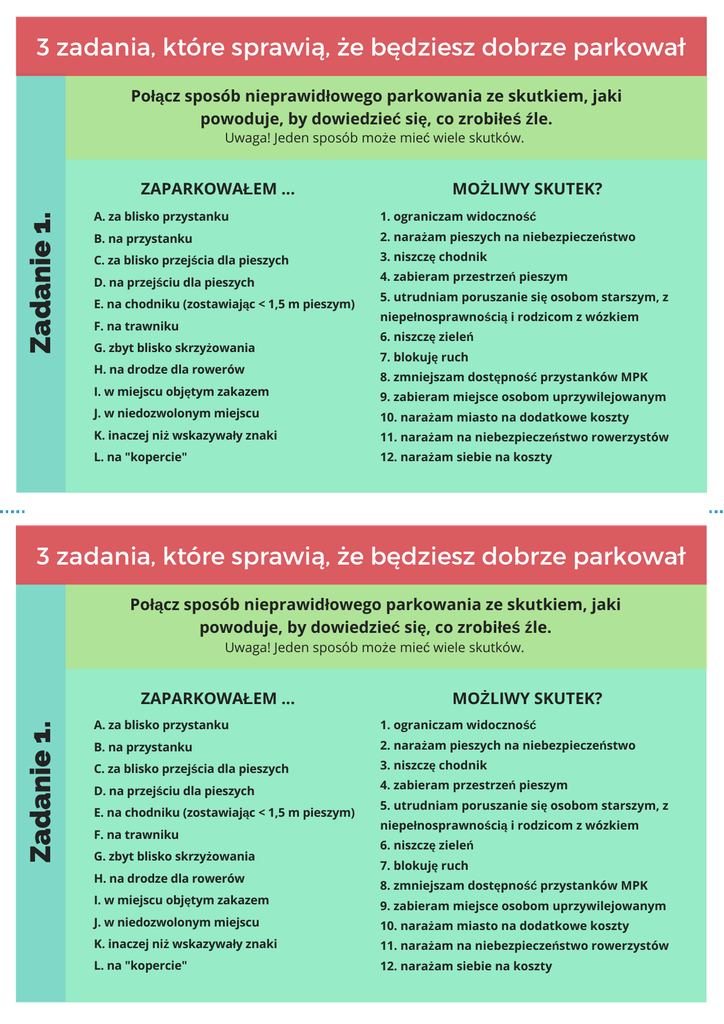 3 zadania, które sprawią, że będziesz dobrze parkował Połącz sposób nieprawidłowego parkowania ze skutkiem, jaki powoduje, by dowiedzieć się, co zrobiłeś źle. Uwaga! Jeden sposób może mieć wiele skutków. Zadanie 1. ZAPARKOWAŁEM ... MOŻLIWY SKUTEK? A. za blisko przystanku 1. ograniczam widoczność B. na przystanku 2. narażam pieszych na niebezpieczeństwo C. za blisko przejścia dla pieszych 3. niszczę chodnik D. na przejściu dla pieszych 4. zabieram przestrzeń pieszym E. na chodniku (zostawiając < 1,5 m pieszym) F. na trawniku G. zbyt blisko skrzyżowania H. na drodze dla rowerów I. w miejscu objętym zakazem J. w niedozwolonym miejscu 5. utrudniam poruszanie się osobom starszym, z niepełnosprawnością i rodzicom z wózkiem 6. niszczę zieleń 7. blokuję ruch 8. zmniejszam dostępność przystanków MPK 9. zabieram miejsce osobom uprzywilejowanym 10. narażam miasto na dodatkowe koszty K. inaczej niż wskazywały znaki 11. narażam na niebezpieczeństwo rowerzystów L. na "kopercie" 12. narażam siebie na koszty 3 zadania, które sprawią, że będziesz dobrze parkował Połącz sposób nieprawidłowego parkowania ze skutkiem, jaki powoduje, by dowiedzieć się, co zrobiłeś źle. Uwaga! Jeden sposób może mieć wiele skutków. Zadanie 1. ZAPARKOWAŁEM ... MOŻLIWY SKUTEK? A. za blisko przystanku 1. ograniczam widoczność B. na przystanku 2. narażam pieszych na niebezpieczeństwo C. za blisko przejścia dla pieszych 3. niszczę chodnik D. na przejściu dla pieszych 4. zabieram przestrzeń pieszym E. na chodniku (zostawiając < 1,5 m pieszym) F. na trawniku G. zbyt blisko skrzyżowania H. na drodze dla rowerów I. w miejscu objętym zakazem J. w niedozwolonym miejscu 5. utrudniam poruszanie się osobom starszym, z niepełnosprawnością i rodzicom z wózkiem 6. niszczę zieleń 7. blokuję ruch 8. zmniejszam dostępność przystanków MPK 9. zabieram miejsce osobom uprzywilejowanym 10. narażam miasto na dodatkowe koszty K. inaczej niż wskazywały znaki 11. narażam na niebezpieczeństwo rowerzystów L. na "kopercie" 12. narażam siebie na koszty Zadanie 2. Zadanie 3. Wśród nieprawidłowych wymówek znajduje się jedna prawidłowa reakcja. Znajdź ją. Spośród wymienionych parkingów wybierz z listy ten, który jest dla Ciebie najdogodniejszy. Zaparkuj na nim samochód. A. Ja tylko na chwilę. B. A co komu to przeszkadza? 1. Szewska Centrum - 350 miejsc C. Przecież wszyscy tu parkują! 2. ul. Rzeźnicza - 300 miejsc D. Po co mam płacić, jak tu jest za darmo? 3. Renoma - 650 miejsc E. Tędy i tak nikt nie chodzi. F. Na co komu ten trawnik? 4. pl. Nowy Targ - 340 miejsc G. Stanie ci się coś jak pójdziesz naokoło? 5. ul. św. Antoniego (Helios) - 140 miejsc H. Śpieszyło mi się! 6. Galeria Dominikańska - 900 miejsc I. Tylko tu było miejsce. J. Przecież możesz przejść bokiem, zmieścisz się. 7. Narodowe Forum Muzyki - 660 miejsc K. Ale ja tu pracuję, to gdzie mam parkować? 8. Arkady Wrocławskie - 1100 miejsc L. Chodnik i tak jest już zniszczony. 9. Pasaż Grunwaldzki - 1400 miejsc M. Przecież nie ma zakazu. N. No bez przesady! O. Będę parkować tylko w miejscach do tego przeznaczonych. 10. Dworzec PKP - 220 miejsc its.wroc.pl/parkingi facebook.com/PieszyWroclaw Zadanie 2. Zadanie 3. Wśród nieprawidłowych wymówek znajduje się jedna prawidłowa reakcja. Znajdź ją. Spośród wymienionych parkingów wybierz z listy ten, który jest dla Ciebie najdogodniejszy. Zaparkuj na nim samochód. A. Ja tylko na chwilę. B. A co komu to przeszkadza? 1. Szewska Centrum - 350 miejsc C. Przecież wszyscy tu parkują! 2. ul. Rzeźnicza - 300 miejsc D. Po co mam płacić, jak tu jest za darmo? 3. Renoma - 650 miejsc E. Tędy i tak nikt nie chodzi. F. Na co komu ten trawnik? 4. pl. Nowy Targ - 340 miejsc G. Stanie ci się coś jak pójdziesz naokoło? 5. ul. św. Antoniego (Helios) - 140 miejsc H. Śpieszyło mi się! 6. Galeria Dominikańska - 900 miejsc I. Tylko tu było miejsce. J. Przecież możesz przejść bokiem, zmieścisz się. 7. Narodowe Forum Muzyki - 660 miejsc K. Ale ja tu pracuję, to gdzie mam parkować? 8. Arkady Wrocławskie - 1100 miejsc L. Chodnik i tak jest już zniszczony. 9. Pasaż Grunwaldzki - 1400 miejsc M. Przecież nie ma zakazu. N. No bez przesady! O. Będę parkować tylko w miejscach do tego przeznaczonych. 10. Dworzec PKP - 220 miejsc its.wroc.pl/parkingi facebook.com/PieszyWroclaw