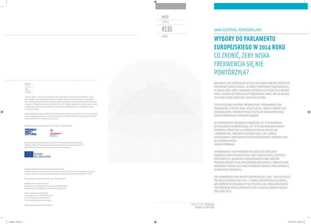 ANALIZY I OPINIE #135 10.2013 ANALIZY I OPINIE #135 10.2013 „Analizy i Opinie” – seria kilkustronicowych analiz dotyczących ważnych tematów dla Polski i Europy. W ten sposób Instytut Spraw Publicznych chce aktywnie włączyć się w debatę publiczną – pokazywać istotne problemy, często nieobecne w polskiej i ogólnoeuropejskiej debacie, oraz proponować konkretne rozwiązania. Tematyka poruszana w „Analizach i Opiniach” obejmuje zagadnienia związane między innymi z integracją europejską, polityką społeczną, edukacją, administracją publiczną, polityką migracyjną i polityką wschodnią. Projekt współfinansowany ze środków Ministerstwa Spraw Zagranicznych. Wyrażone w niniejszej publikacji opinie są poglądami jej Autorów. Treści prezentowane w niniejszej publikacji nie są tożsame z oficjalnym stanowiskiem Ministerstwa Spraw Zagranicznych. Publikacja powstała przy współpracy z Fundacją im. Friedricha Eberta. Niniejsza publikacja została wydana przy wsparciu finansowym Komisji Europejskiej. Publikacja odzwierciedla jedynie stanowiska autorów i Komisja Europejska nie ponosi odpowiedzialności za umieszczoną w nich zawartość merytoryczną. Za treść publikacji odpowiada Instytut Spraw Publicznych. Przedruk materiałów Instytutu Spraw Publicznych w całości lub części jest możliwy wyłącznie za zgodą Instytutu. Cytowanie oraz wykorzystanie danych empirycznych jest dozwolone z podaniem źródła. © Copyright by Instytut Spraw Publicznych, Warszawa 2013 Redaktor serii: dr Jacek Kucharczyk Koordynator serii: Rafał Załęski, e-mail: [email protected] Redakcja językowa: Magdalena Otlewska (www.bezbledu.pl) Adres: Instytut Spraw Publicznych ul. Szpitalna 5 lok. 22, 00-031 Warszawa tel. 22 556 42 60, faks 22 556 42 62 e-mail: [email protected], www.isp.org.pl ANNA JEZIERSKA, AGNIESZKA ŁADA WYBORY DO PARLAMENTU EUROPEJSKIEGO W 2014 ROKU CO ZROBIĆ, ŻEBY NISKA FREKWENCJA SIĘ NIE POWTÓRZYŁA? OBYWATELE UNII EUROPEJSKIEJ W MAJU 2014 ROKU WYBIORĄ POSŁÓW DO PARLAMENTU EUROPEJSKIEGO. W DWÓCH POPRZEDNICH GŁOSOWANIACH, W LATACH 2004 I 2009, FREKWENCJA WYBORCZA W POLSCE BYŁA BARDZO NISKA. DLATEGO JUŻ TERAZ NALEŻY PODEJMOWAĆ KROKI, ABY NA WIOSNĘ 2014 ROKU WIĘCEJ OBYWATELI UDAŁO SIĘ DO URN. DOTYCHCZASOWE KAMPANIE INFORMACYJNE I PROFREKWENCYJNE PROWADZONE W POLSCE MIAŁY RÓŻNY SKUTEK. WARTO CZERPAĆ Z ICH DOŚWIADCZENIA I WYKORZYSTYWAĆ SKUTECZNE MECHANIZMY ORAZ UNIKAĆ POPEŁNIANYCH WÓWCZAS BŁĘDÓW. DLA PODNIESIENIA FREKWENCJI WYBORCZEJ, CZY TO W WYBORACH DO PARLAMENTU EUROPEJSKIEGO, CZY TO W JAKICHKOLWIEK INNYCH WYBORACH, KONIECZNE SĄ ZARÓWNO DZIAŁANIA EDUKACYJNE I INFORMACYJNE, TRWAJĄCE W SPOSÓB CIĄGŁY, JAK I DOBRZE ZAPLANOWANA I DOPASOWANA DO POTRZEB KAMPANIA INFORMACYJNA REALIZOWANA PRZED SAMYMI WYBORAMI. INFORMOWANIE I MOTYWOWANIE POLAKÓW JEST WSPÓLNYM ZADANIEM SAMYCH KANDYDATÓW I PARTII POLITYCZNYCH, INSTYTUCJI PAŃSTWOWYCH, ORGANIZACJI POZARZĄDOWYCH ORAZ MEDIÓW, POWINNO OPIERAĆ SIĘ NA DWUSTRONNEJ KOMUNIKACJI Z OBYWATELAMI. KIEROWANY PRZEKAZ MUSI MIEĆ CHARAKTER ZUPEŁNIE PODSTAWOWYCH, KLAROWNYCH INFORMACJI. ROK WYBORÓW DO PARLAMENTU EUROPEJSKIEGO, 2014 – DZIESIĘCIOLECIE POLSKIEGO CZŁONKOSTWA W UE – STWARZA NIEPOWTARZALNĄ SZANSĘ, ABY ZARÓWNO W DZIAŁANIACH POLITYCZNYCH, JAK I KOMUNIKACYJNYCH (PROFREKWENCYJNYCH) POŚWIĘCIĆ WIELE UWAGI BILANSOWI POLSKIEJ OBECNOŚCI W UE. Publikacja rozpowszechniana bezpłatnie okladka_135.indd 1 2013-10-16 09:10:19 1 ANNA JEZIERSKA, AGNIESZKA ŁADA. WYBORY DO PARLAMENTU EUROPEJSKIEGO W 2014 ROKU. CO ZROBIĆ, ŻEBY NISKA FREKWENCJA SIĘ NIE POWTÓRZYŁA? W maju 2014 roku odbędą się trzecie wybory do Parlamentu Europejskiego, w których także Polacy będą mogli zadecydować, kto zasiądzie w tej instytucji. W poprzednich głosowaniach, w latach 2004 i 2009, z prawa oddania głosu skorzystało wyjątkowo niewielu z nich – odpowiednio co piąty (20,8%) i co czwarty (24,53%) uprawniony. Polska zajęła w ten sposób niechlubne przedostatnie miejsce wśród wszystkich krajów UE pod względem frekwencji. Stało się tak pomimo ogólnego zadowolenia Polaków z przynależności naszego kraju do UE oraz z prowadzonych kampanii informacyjnych i „profrekwencyjnych”. Jednym z powodów tak wysokiej absencji przy urnach był brak zainteresowania i łącząca się z nim niewiedza, także na temat samych procedur wyborczych – w badaniu opinii publicznej przeprowadzonym przez Instytut Spraw Publicznych tuż po wyborach, w sierpniu 2009 roku jedynie 57% uprawnionych odpowiedziało, że posłów do PE wybierają wszyscy obywatele. Osoby niegłosujące jako powód niepójścia na wybory podawały przede wszystkim brak odpowiednich kandydatów oraz zniechęcenie polityką. Zadanie redukowania przyczyn bierności wyborczej – zwłaszcza tych dwóch ostatnich, choć nie tylko – spoczywa przede wszystkim na partiach politycznych1. Powodów absencji jest jednak więcej, należą do nich np.: niedostateczne poinformowanie o sytuacji w kraju i Europie czy wątpliwości, czy pojedynczy głos się liczy. Zwłaszcza w obszarze informowania o procedurach i przebiegu głosowania, jego znaczeniu oraz kontekście społeczno-politycznym wiele mogą zdziałać instytucje państwowe, organizacje pozarządowe oraz media. Ich postawa pośrednio wpływa także na zainteresowanie obywateli polityką. Organizowane przez nie kampanie informacyjne i profrekwencyjne mają szansę wpłynąć na udział obywateli w wyborach. Aby były one skuteczne, konieczne jest spełnienie kilku warunków. Po pierwsze, uwzględniać muszą specyfikę danego głosowania i aktualnej sytuacji politycznej. W tym celu ich twórcy powinni przeanalizować panujące w społeczeństwie opinie czy uwarunkowania prawne. Po drugie, ważne, aby na podstawie tych analiz stworzyć odpowiedni plan działań, bazujący także na doświadczeniach poprzednich podobnych akcji, tak aby od1 Więcej na temat, jaki powinien być odpowi