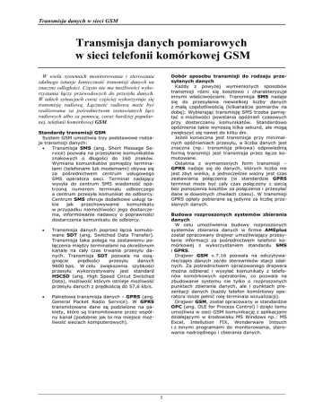 Transmisja danych w sieci GSM Transmisja danych pomiarowych w sieci telefonii komórkowej GSM Dobór sposobu transmisji do rodzaju przesyłanych danych Każdy z powyżej wymienionych sposobów transmisji różni się kosztowo i charakteryzuje innymi właściwościami. Transmisja SMS nadaje się do przesyłania niewielkiej liczby danych z małą częstotliwością (kilkanaście pomiarów na dobę). Wybierając transmisję SMS trzeba pamiętać o możliwości powstania opóźnień czasowych przy dostarczaniu komunikatów. Standardowo opóźnienia takie wynoszą kilka sekund, ale mogą zwiększyć się nawet do kilku dni. Jeżeli konieczna jest transmisja przy minimalnych opóźnieniach przesyłu, a liczba danych jest znaczna (np.: transmisja plikowa) odpowiednią formą transmisji jest transmisja przez łącze komutowane. Ostatnia z wymienionych form transmisji – GPRS nadaje się do danych, których liczba nie jest zbyt wielka, a jednocześnie ważny jest czas zestawiania połączenia (w standardzie GPRS terminal może być cały czas połączony z siecią bez ponoszenia kosztów za połączenia i przesyłać dane w dowolnych chwilach czasu). W transmisji GPRS opłaty pobierane są jedynie za liczbę przesłanych danych. W wielu systemach monitorowania i sterowania zdalnego istnieje konieczność transmisji danych na znaczne odległości. Często nie ma możliwości wykorzystania łączy przewodowych do przesyłu danych. W takich sytuacjach coraz częściej wykorzystuje się transmisję radiową. Łączność radiowa może być realizowana za pośrednictwem zestawianych łącz radiowych albo za pomocą, coraz bardziej popularnej, telefonii komórkowej GSM. Standardy transmisji GSM System GSM umożliwia trzy podstawowe rodzaje transmisji danych: • Transmisja SMS (ang. Short Message Service) pozwala na przesyłanie komunikatów znakowych o długości do 160 znaków. Wymiana komunikatów pomiędzy terminalami (telefonami lub modemami) obywa się za pośrednictwem centrum usługowego SMS operatora sieci. Terminal nadający wysyła do centrum SMS wiadomość opatrzoną numerem terminalu odbiorczego a centrum przesyła komunikat do odbiorcy. Centrum SMS oferuje dodatkowe usługi takie jak przechowywanie komunikatu w przypadku niemożliwości jego dostarczenia, informowanie nadawcy o poprawności dostarczenia komunikatu do odbiorcy. • Transmisja danych poprzez łącza komutowane SDT (ang. Switched Data Transfer). Transmisja taka polega na zestawieniu połączenia między terminalami na określonym kanale na cały czas trwania przesyłu danych. Transmisja SDT pozwala na osiągnięcie prędkości przesyłu danych 9600 bps. W celu zwiększenia szybkości przesyłu wykorzystywany jest standard HSCSD (ang. High Speed Circut Switched Data), możliwość którym istnieje możliwość przesyłu danych z prędkością do 57,6 kb/s. • Pakietowa transmisja danych – GPRS (ang. General Packet Radio Service). W GPRS transmitowane dane są podzielone na pakiety, które są transmitowane przez wspólny kanał (podobnie jak to ma miejsce możliwość sieciach komputerowych). Budowa rozproszonych systemów zbierania danych W celu umożliwienia budowy rozproszonych systemów zbierania danych w firmie AMEplus został opracowany drajwer umożliwiający przesyłanie informacji za pośrednictwem telefonii komórkowej z wykorzystaniem standardu SMS i GPRS. Drajwer GSM v.7.16 pozwala na odczytywanie/zapis danych ze/do sterowników stacji zdalnych. Za pośrednictwem opracowanego drajwera można odbierać i wysyłać komunikaty z telefonów komórkowych operatorów, co pozwala na zbudowanie systemu nie tylko o rozproszonych punktach zbierania danych, ale i punktach prezentacji danych (każdy telefon komórkowy operatora może pełnić rolę terminala wizualizacji). Drajwer GSM, został opracowany w standardzie OPC (ang. OLE for Process Control) i dzięki temu umożliwia w sieci GSM komunikację z aplikacjami działającymi w środowisku MS Windows np.: MS Excel, Intellution FIX, Wonderware Intouch i z innymi programami do monitorowania, sterowania nadrzędnego i zbierania danych. 1 Transmisja danych w sieci GSM System rozproszonego zbierania i udostępniania danych z wykorzystaniem drajwera GSM v.7.16 Systemy sterowania i monitorowania bazujące na drajwerze GSM v. 7.16 udostępnia firma: AmePlus Sp. z o.o, 44-100 Gliwice, ul. Wieczorka 33 tel. (032) 231 85 30 tel./fax (032) 231 82 92 www.ameplus.pl 2