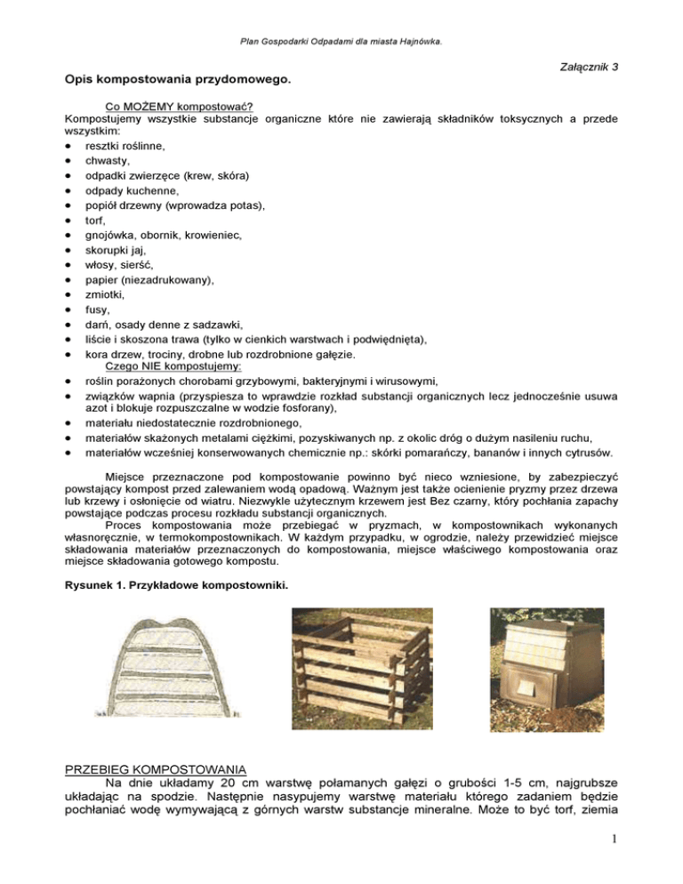 Plan Gospodarki Odpadami dla miasta Hajnówka. Opis kompostowania przydomowego. Załącznik 3 Co MOśEMY kompostować? Kompostujemy wszystkie substancje organiczne które nie zawierają składników toksycznych a przede wszystkim: • resztki roślinne, • chwasty, • odpadki zwierzęce (krew, skóra) • odpady kuchenne, • popiół drzewny (wprowadza potas), • torf, • gnojówka, obornik, krowieniec, • skorupki jaj, • włosy, sierść, • papier (niezadrukowany), • zmiotki, • fusy, • darń, osady denne z sadzawki, • liście i skoszona trawa (tylko w cienkich warstwach i podwiędnięta), • kora drzew, trociny, drobne lub rozdrobnione gałęzie. Czego NIE kompostujemy: • roślin poraŜonych chorobami grzybowymi, bakteryjnymi i wirusowymi, • związków wapnia (przyspiesza to wprawdzie rozkład substancji organicznych lecz jednocześnie usuwa azot i blokuje rozpuszczalne w wodzie fosforany), • materiału niedostatecznie rozdrobnionego, • materiałów skaŜonych metalami cięŜkimi, pozyskiwanych np. z okolic dróg o duŜym nasileniu ruchu, • materiałów wcześniej konserwowanych chemicznie np.: skórki pomarańczy, bananów i innych cytrusów. Miejsce przeznaczone pod kompostowanie powinno być nieco wzniesione, by zabezpieczyć powstający kompost przed zalewaniem wodą opadową. WaŜnym jest takŜe ocienienie pryzmy przez drzewa lub krzewy i osłonięcie od wiatru. Niezwykle uŜytecznym krzewem jest Bez czarny, który pochłania zapachy powstające podczas procesu rozkładu substancji organicznych. Proces kompostowania moŜe przebiegać w pryzmach, w kompostownikach wykonanych własnoręcznie, w termokompostownikach. W kaŜdym przypadku, w ogrodzie, naleŜy przewidzieć miejsce składowania materiałów przeznaczonych do kompostowania, miejsce właściwego kompostowania oraz miejsce składowania gotowego kompostu. Rysunek 1. Przykładowe kompostowniki. PRZEBIEG KOMPOSTOWANIA Na dnie układamy 20 cm warstwę połamanych gałęzi o grubości 1-5 cm, najgrubsze układając na spodzie. Następnie nasypujemy warstwę materiału którego zadaniem będzie pochłaniać wodę wymywającą z górnych warstw substancje mineralne. MoŜe to być torf, ziemia 1 Plan Gospodarki Odpadami dla miasta Hajnówka. ogrodowa, słoma lub częściowo rozłoŜony kompost. PowyŜej układamy warstwy materiału, przekładane ziemią ogrodową, drobno rozkruszoną gliną lub iłem w ilości 5% objętości pryzmy. Dobrze jest dodawać teŜ nieco gotowego kompostu z wcześniejszej pryzmy. Po osiągnięciu wysokości 120 cm (przy dobrym dostępie powietrza), pryzmę okrywamy ziemią lub innym materiałem, profilując ją tak aby woda opadowa ściekała do wnętrza pryzmy. Niektórzy proponują polewać tak przygotowaną pryzmę, gnojówką roślinną z pokrzywy, rumianku i krwawnika. Na zimę, pryzmę okrywamy materiałem izolacyjnym, co umoŜliwi dalszy rozkład materiału. WYKORZYSTANIE KOMPOSTU Właściwie dojrzały kompost, poza brunatną barwą, wydziela przyjemny zapach, zbliŜony do zapachu próchnicy leśnej. Jego cząstki nie muszą być całkowicie rozłoŜone. Jedynie, stosując go do kwiatów doniczkowych lub jako komponent do wysiewu nasion, doprowadzamy do pełniejszego rozkładu a następnie przesiewamy na sicie. Do tych zastosowań moŜemy wymieszać go z piaskiem i gliną w równych ilościach. W ogrodzie, kompost rozprowadzamy na powierzchni gleby w ilości 10 litrów kompostu na 2 m2 a następnie mieszamy go z jej górną, ok. 10cm warstwą. Podczas sadzenia drzew i krzewów, "zaprawiamy" dołki, wsypując kompost na dno. Ziemię, którą zasypujemy bryłę korzeniową, mieszamy z kompostem w stosunku 1:1. 2