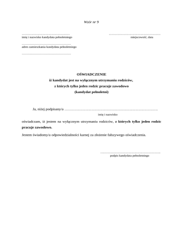 Wzór nr 9 ………………………………… …………………………………… imię i nazwisko kandydata pełnoletniego miejscowość, data ………………………………………… adres zamieszkania kandydata pełnoletniego ………………………………………… OŚWIADCZENIE iż kandydat jest na wyłącznym utrzymaniu rodziców, z których tylko jeden rodzic pracuje zawodowo (kandydat pełnoletni) Ja, niżej podpisany/a …………………………………………………………………. imię i nazwisko oświadczam, iż jestem na wyłącznym utrzymaniu rodziców, z których tylko jeden rodzic pracuje zawodowo. Jestem świadomy/a odpowiedzialności karnej za złożenie fałszywego oświadczenia. …………………………………………. podpis kandydata pełnoletniego