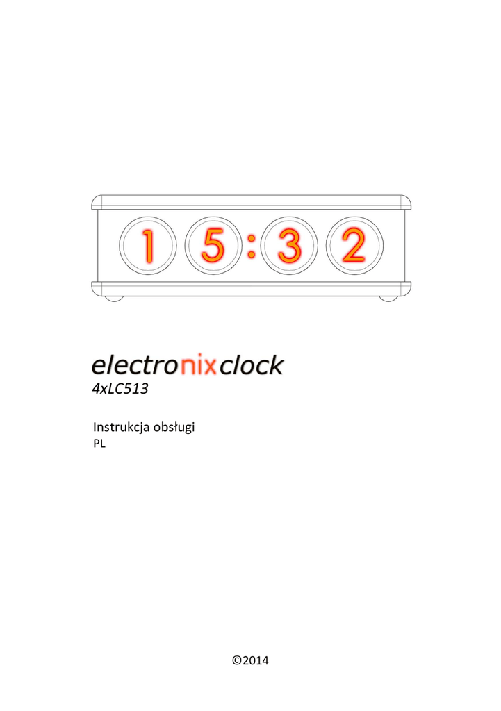 4xLC513 Instrukcja obsługi PL ©2014 TESTA-QUADRA 4xLC513 Spis treści: Spis treści: .............................................................................2 Wstęp ....................................................................................3 Elementy zestawu .................................................................3 Dane techniczne ....................................................................3 Rozpakowanie zegara............................................................4 Podłączenie ...........................................................................4 Nastawianie godziny .............................................................6 Nastawianie alarmu ..............................................................7 Wygaszanie lamp ..................................................................7 Czujnik światła ......................................................................7 Czyszczenie ............................................................................8 Gwarancja .............................................................................8 Producent..............................................................................8 ©2014 v1.0 TESTA-QUADRA 2/8 TESTA-QUADRA 4xLC513 Wstęp Dziękujemy za zakup zegara electroNIXclock. Jego oryginalna obudowa na pewno dopełni wysmakowane wnętrze. Natomiast ciepła i niespotykana barwa wyświetlaczy nikomu nie pozwoli przejść obok obojętnie. Zegar wyświetla czas w formacie 24 lub 12 godzinnym, w zależności od wybranej nastawy dwukropek sekundnika mruga lub nie. Jest też możliwość zupełnego wygaszenia dwukropka. Niniejsza instrukcja obsługi wyjaśnia jak prawidłowo posługiwać się zegarem. Elementyzestawu - kompletny, zmontowany zegar wraz z lampkami nixie - dedykowany wtyczkowy zasilacz sieciowy - instrukcja obsługi Uwaga! Lampy w które wyposażony jest zegar są bardzo delikatne. Zegarem należy się posługiwać ostrożnie. Unikać wstrząsów oraz uderzeń. W przypadku uszkodzenia szklanej bańki lampy zegar należy niezwłocznie odłączyć od sieci zasilającej! Danetechniczne Parametr: Wymiary [wys. x dł. x szer.] [mm]: Masa: Napięcie zasilania: Pobór prądu: Wysokość cyfry: Możliwość wygaszenia lamp: ©2014 v1.0 TESTA-QUADRA Wartość: 50 x 60 x 155 245g 12V DC z dostarczonego zasilacza 230VAC ~1,5W 15,5mm tak 3/8 TESTA-QUADRA 4xLC513 Automatyczna regulacja jasności lamp: Alarm: Podtrzymanie zasilania zegara (maks. 8 godz.): tak tak tak Rozpakowaniezegara Rozpakowanie należy przeprowadzić ze szczególną uwagą. Ostrożnie wyjąć zegar z pudełka, odwinąć z folii. Sprawdzić wizualnie stan lamp świecących nixie. Podłączenie Zegar elektroNIXclock jest wyposażony w kondensatorowy układ podtrzymania odliczania czasu w przypadku zaniku napięcia sieciowego. W zależności od warunków podtrzymanie trwa do 8 godzin. Aby uruchomić zegar należy podłączyć złącze zasilacza sieciowego do zegara: 1 Następnie podłączyć wtyczkę zasilacza sieciowego do gniazdka: ©2014 v1.0 TESTA-QUADRA 4/8 TESTA-QUADRA 4xLC513 2 Uwaga! Niedopuszczalne jest otwieranie obudowy zegara, gdy jest on podłączony do sieci! Przed otwarciem obudowy odłącz zasilacz od zegara! Zegar należy umiejscowić miejscu suchym i wolnym od kurzu. Niezalecane jest umiejscawianie zegara niedaleko źródeł ciepła, takich jak grzejniki, żarówki, bezpośrednie działanie promieni słonecznych. Nie należy niczym przykrywać zegara. Stosowanie się do powyższych zaleceń zapewni długowieczną i niezawodną eksploatację zegara. Producent dokonał wszelkich starań, aby zastosowane lampy świeciły równomiernie i mocno. Każdy egzemplarz zegara jest indywidualnie testowany zanim trafi do klienta. Jednak z uwagi na wiek zastosowanych lamp, może się zdarzyć, że zaraz po włączeniu lampki nie świecą równomiernie. Należy wtedy pozostawić zegar włączony do sieci i odczekać około godziny na tzw. wyżarzenie. Po tym czasie wszystkie lampki powinny powrócić do pełnej jasności. ©2014 v1.0 TESTA-QUADRA 5/8 TESTA-QUADRA 4xLC513 Jeżeli podłączenie do sieci nastąpi w chwili, gdy układ podtrzymania jest rozładowany na wyświetlaczu pojawi się godzina 00:00 i rozlegnie się sygnał alarmu. Aby wyłączyć alarm należy nacisnąć którykolwiek z przycisków z tyłu obudowy. Jeżeli podłączenie nastąpi w momencie, gdy układ podtrzymania działa nie ma potrzeby nastawiania godziny. Nastawianiegodziny Zegar wyposażony jest w 3 przyciski: „SET”, „+” i „-”. - + SET Aby nastawić godzinę należy przytrzymać dłużej niż 3 sek. przycisk „SET”. Wyświetlacz minutowy zostanie wygaszony. Zaświeci się górna kropka sekundnika oraz zaczną mrugać cyfry godzinowe. Odpowiednią godzinę należy nastawić przyciskami „+” oraz „-”. Aby przejść do nastawienia minut, należy ponownie przytrzymać przycisk „SET”. Odpowiednią ilość minut należy nastawić przyciskami „+” oraz „-”. Ponowne przytrzymanie przycisku „SET” spowoduje zapisanie nastawionej godziny i przejście do odmierzania czasu. ©2014 v1.0 TESTA-QUADRA 6/8 TESTA-QUADRA 4xLC513 Nastawianiealarmu Aby nastawić alarm należy przytrzymać krócej niż 1 sek. przycisk „SET”. Wyświetlacz minutowy zostanie wygaszony. Zaświeci się dolna kropka sekundnika oraz zaczną mrugać cyfry godzinowe. Aby zrezygnować z nastawiania alarmu należy nacisnąć równocześnie i przytrzymać przycisk „+” i „-”. Alarm zostanie dezaktywowany, a zegar powróci do trybu odmierzania czasu. Nastawianie alarmu odbywa się analogicznie do nastawiania czasu. Ponowne przytrzymanie przycisku „SET” spowoduje zapisanie nastawionej godziny alarmu oraz przejście do trybu odliczania czasu. Alarm zostanie uruchomiony po osiągnięciu nastawionej godziny na czas 1min. i zostanie automatycznie dezaktywowany po upływie 1 min. Wcześniejsza dezaktywacja możliwa jest poprzez naciśnięci