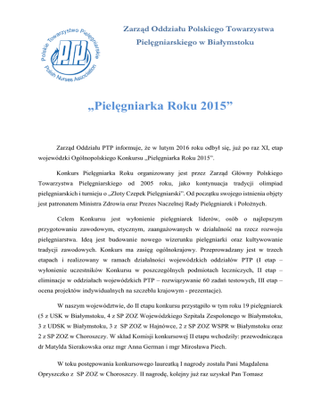 Zarząd Oddziału Polskiego Towarzystwa Pielęgniarskiego w Białymstoku „Pielęgniarka Roku 2015” Zarząd Oddziału PTP informuje, że w lutym 2016 roku odbył się, już po raz XI, etap wojewódzki Ogólnopolskiego Konkursu „Pielęgniarka Roku 2015”. Konkurs Pielęgniarka Roku organizowany jest przez Zarząd Główny Polskiego Towarzystwa Pielęgniarskiego od 2005 roku, jako kontynuacja tradycji olimpiad pielęgniarskich i turnieju o „Złoty Czepek Pielęgniarski”. Od początku swojego istnienia objęty jest patronatem Ministra Zdrowia oraz Prezes Naczelnej Rady Pielęgniarek i Położnych. Celem Konkursu jest wyłonienie pielęgniarek liderów, osób o najlepszym przygotowaniu zawodowym, etycznym, zaangażowanych w działalność na rzecz rozwoju pielęgniarstwa. Ideą jest budowanie nowego wizerunku pielęgniarki oraz kultywowanie tradycji zawodowych. Konkurs ma zasięg ogólnokrajowy. Przeprowadzany jest w trzech etapach i realizowany w ramach działalności wojewódzkich oddziałów PTP (I etap – wyłonienie uczestników Konkursu w poszczególnych podmiotach leczniczych, II etap – eliminacje w oddziałach wojewódzkich PTP – rozwiązywanie 60 zadań testowych, III etap – ocena projektów indywidualnych na szczeblu krajowym - prezentacje). W naszym województwie, do II etapu konkursu przystąpiło w tym roku 19 pielęgniarek (5 z USK w Białymstoku, 4 z SP ZOZ Wojewódzkiego Szpitala Zespolonego w Białymstoku, 3 z UDSK w Białymstoku, 3 z SP ZOZ w Hajnówce, 2 z SP ZOZ WSPR w Białymstoku oraz 2 z SP ZOZ w Choroszczy. W skład Komisji konkursowej II etapu wchodziły: przewodnicząca dr Matylda Sierakowska oraz mgr Anna German i mgr Mirosława Piech. W toku postępowania konkursowego laureatką I nagrody została Pani Magdalena Opryszczko z SP ZOZ w Choroszczy. II nagrodę, kolejny już raz uzyskał Pan Tomasz Perłowski SP ZOZ WSPR w Białymstoku, a III Pani Karolina Kufta z SP ZOZ w Choroszczy i ex aequo Pani Elżbieta Cerkiewnik z USK w Białymstoku. Tematem przewodnim tegorocznej edycji jest „Pielęgniarstwo wielokulturowe wyzwaniem dla edukacji i praktyki pielęgniarskiej w Polsce”. 07.04. laureatki etapów wojewódzkich przedstawią przed komisją powołaną przez ZG PTP swoje prezentacje. Finał Konkursu odbędzie się w dniu 08 kwietnia 2016 roku w Warszawie. Finalistka Konkursu „Pielęgniarka Roku” zostanie uhonorowana pucharem przechodnim, przekazywanym do macierzystego podmiotu leczniczego. Serdecznie gratulujemy laureatkom etapu wojewódzkiego, a Pani mgr Magdalenie Opryszczko życzymy sukcesu na III etapie postępowania konkursowego. PRZEWODNCZĄCA Zarządu Oddziału PTP w Białymstoku dr n. med. Matylda Sierakowska