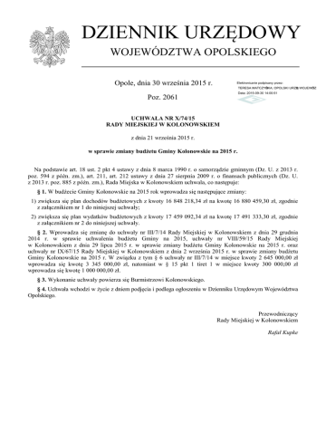 DZIENNIK URZĘDOWY WOJEWÓDZTWA OPOLSKIEGO Opole, dnia 30 września 2015 r. Elektronicznie podpisany przez: TERESA MATCZYŃSKA; OPOLSKI URZĄD WOJEWÓDZKI Data: 2015-09-30 14:00:51 Poz. 2061 UCHWAŁA NR X/74/15 RADY MIEJSKIEJ W KOLONOWSKIEM z dnia 21 września 2015 r. w sprawie zmiany budżetu Gminy Kolonowskie na 2015 r. Na podstawie art. 18 ust. 2 pkt 4 ustawy z dnia 8 marca 1990 r. o samorządzie gminnym (Dz. U. z 2013 r. poz. 594 z późn. zm.), art. 211, art. 212 ustawy z dnia 27 sierpnia 2009 r. o finansach publicznych (Dz. U. z 2013 r. poz. 885 z późn. zm.), Rada Miejska w Kolonowskiem uchwala, co następuje: § 1. W budżecie Gminy Kolonowskie na 2015 rok wprowadza się następujące zmiany: 1) zwiększa się plan dochodów budżetowych z kwoty 16 848 218,34 zł na kwotę 16 880 459,30 zł, zgodnie z załącznikiem nr 1 do niniejszej uchwały; 2) zwiększa się plan wydatków budżetowych z kwoty 17 459 092,34 zł na kwotę 17 491 333,30 zł, zgodnie z załącznikiem nr 2 do niniejszej uchwały. § 2. Wprowadza się zmianę do uchwały nr III/7/14 Rady Miejskiej w Kolonowskiem z dnia 29 grudnia 2014 r. w sprawie uchwalenia budżetu Gminy na 2015, uchwały nr VIII/59/15 Rady Miejskiej w Kolonowskiem z dnia 29 lipca 2015 r. w sprawie zmiany budżetu Gminy Kolonowskie na 2015 r. oraz uchwały nr IX/67/15 Rady Miejskiej w Kolonowskiem z dnia 2 września 2015 r. w sprawie zmiany budżetu Gminy Kolonowskie na 2015 r. W związku z tym § 6 uchwały nr III/7/14 w miejsce kwoty 2 645 000,00 zł wprowadza się kwotę 3 345 000,00 zł, natomiast w § 15 pkt 1 tiret 1 w miejsce kwoty 300 000,00 zł wprowadza się kwotę 1 000 000,00 zł. § 3. Wykonanie uchwały powierza się Burmistrzowi Kolonowskiego. § 4. Uchwała wchodzi w życie z dniem podjęcia i podlega ogłoszeniu w Dzienniku Urzędowym Województwa Opolskiego. Przewodniczący Rady Miejskiej w Kolonowskiem Rafał Kupke Dziennik Urzędowy Województwa Opolskiego –2– Poz. 2061 Załącznik nr 1 do uchwały nr X/74/15 Rady Miejskiej w Kolonowskiem z dnia 21 września 2015 r. Zmiana planu dochodów budżetowych Gminy Kolonowskie na 2015 rok Dział Rozdział § Nazwa 1 2 3 4 Plan przed zmianą Zmniejszenie Zwiększenie Plan po zmianach (5+6+7) 5 6 7 8 bieżące 751 75108 2010 758 75814 2030 921 Urzędy naczelnych organów władzy państwowej, kontroli i ochrony prawa oraz sądownictwa Wybory do Sejmu i Senatu Dotacje celowe otrzymane z budżetu państwa na realizację zadań bieżących z zakresu administracji rządowej oraz innych zadań zleconych gminie (związkom gmin) ustawami Różne rozliczenia Różne rozliczenia finansowe Dotacje celowe otrzymane z budżetu państwa na realizację własnych zadań bieżących gmin (związków gmin) Kultura i ochrona dziedzictwa narodowego Pozostała działalność 92195 0960 Otrzymane spadki, zapisy i darowizny w postaci pieniężnej 75814 6330 0,00 7 794,00 48 606,00 0,00 0,00 7 794,00 7 794,00 0,00 0,00 7 794,00 7 794,00 6 101 211,00 165 001,00 0,00 0,00 13 768,54 13 768,54 6 114 979,54 178 769,54 0,00 0,00 13 768,54 13 768,54 59 500,00 0,00 1 800,00 61 300,00 0,00 0,00 1 800,00 1 800,00 0,00 0,00 1 800,00 1 800,00 14 882 280,34 0,00 23 362,54 14 905 642,88 Różne rozliczenia 0,00 0,00 8 878,42 8 878,42 Różne rozliczenia finansowe 0,00 0,00 8 878,42 8 878,42 0,00 0,00 8 878,42 8 878,42 bieżące 758 40 812,00 razem: majątkowe Dotacje celowe otrzymane z budżetu państwa na realizację inwestycji i zakupów inwestycyjnych własnych gmin (związków gmin) majątkowe razem: Ogółem: w tym z tytułu dotacji i środków na finansowanie wydatków na realizację zadań finansowanych z udziałem środków, o których mowa w art. 5 ust. 1 pkt 2 i 3 1 965 938,00 0,00 8 878,42 1 974 816,42 16 848 218,34 0,00 32 240,96 16 880 459,30 1 136 377,00 0,00 0,00 1 136 377,00 Dziennik Urzędowy Województwa Opolskiego –3– Poz. 2061 Załącznik nr 2 do uchwały nr X/74/15 Rady Miejskiej w Kolonowskiem Zmiana planu wydatków budżetowych Gminy Kolonowskie na 2015 rok z dnia 21 września 2015 r. Z tego z tego: z tego: w tym: z tego: Dział 1 Rozdział Nazwa 3 2 700 70095 750 75095 751 75108 75704 Wydatki bieżące 4 wynagrodzenia i składki od nich naliczane wydatki związane z realizacją ich statutowych zadań 6 7 8 dotacje na zadania bieżące wypłaty z tytułu poręczeń i gwarancji 10 11 Wydatki majątkowe inwestycje i zakupy inwestycyjne 12 14 192100 0 32876,96 224976,96 129000 0 32876,96 161876,96 2541806 0 120000 2661806 29300 0 120000 149300 40812 0 7794 192100 0 32876,96 224976,96 129000 0 32876,96 161876,96 2477036 0 120000 2597036 29300 0 120000 149300 18442 0 7144 0 0 0 0 0 0 0 0 1743267 0 0 1743267 0 0 0 0 7894 0 3200 192100 0 32876,96 224976,96 129000 0 32876,96 161876,96 733769 0 120000 853769 29300 0 120000 149300 10548 0 3944 0 0 0 0 0 0 0 0 0 0 0 0 0 0 0 0 0 0 0 0 0 0 0 0 0 0 0 64770 0 0 64770 0 0 0 0 22370 0 650 0 0 0 0 0 0 0 0 0 0 0 0 0 0 0 0 0 0 0 258610 0 0 258610 8610 0 0 8610 69000 0 0 69000 10000 0 0 10000 0 0 0 13 258610 0 0 258610 8610 0 0 8610 69000 0 0 69000 10000 0 0 10000 0 0 0 48606 48606 25586 11094 14492 0 23020 0 0 0 0 przed zmianą zmniejszenie zwiększenie po zmianach przed zmianą zmniejszenie zwiększenie po zmianach przed zmianą zmniejszenie 0 0 7794 7794 217730 -137730 0 80000 137730 -137730 0 0 7794 7794 217730 -137730 0 80000 137730 -137730 0 0 7144 7144 0 0 0 0 0 0 0 0 3200 3200 0 0 0 0 0 0 0 0 3944 3944 0 0 0 0 0 0 0 0 0 0 0 0 0 0 0 0 0 0 650 650 0 0 0 0 0 0 0 0 0 0 137730 -137730 0 0 137730 -137730 0 0 0 0 0 0 0 0 0 0 0 0 0 0 0 0 0 0 0 0 0 0 0 0 0 0 0 0 0 0 zwiększenie 0 0 0 0 0 0 0 0 0 0 0 po zmianach 0 0 0 0 0 0 0 0 0 0 0 Rozliczenia z tytułu poręczeń i gwarancji udzielonych przez Skarb Państwa lub jednostkę samorządu terytorialnego 9 świadczenia na rzecz osób fizycznych; 450710 0 32876,96 483586,96 137610 0 32876,96 170486,96 2610806 0 120000 2730806 39300 0 120000 159300 40812 0 7794 Wybory do Sejmu i Senatu 5 wydatki jednostek budżetowych 