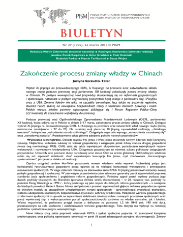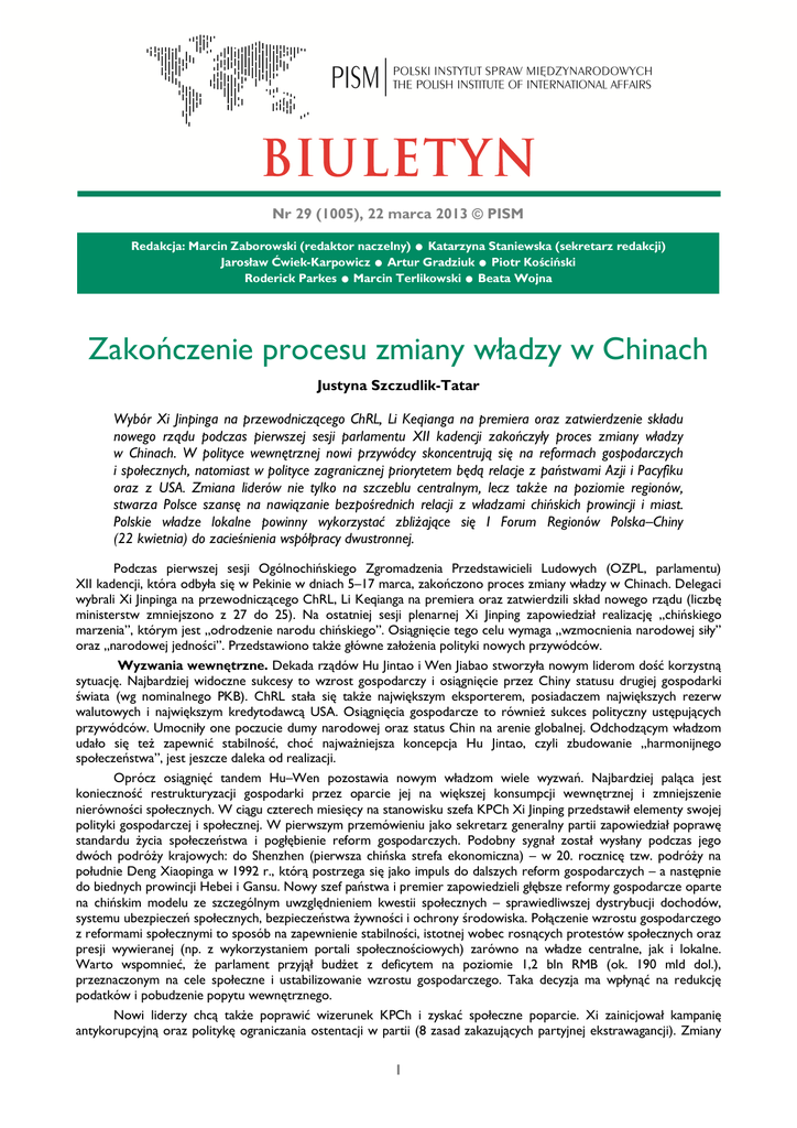 Nr 29 (1005), 22 marca 2013 © PISM . . . .. Redakcja: Marcin Zaborowski (redaktor naczelny) Katarzyna Staniewska (sekretarz redakcji) Jarosław Ćwiek-Karpowicz Artur Gradziuk Piotr Kościński Roderick Parkes Marcin Terlikowski Beata Wojna Zakończenie procesu zmiany władzy w Chinach Justyna Szczudlik-Tatar Wybór Xi Jinpinga na przewodniczącego ChRL, Li Keqianga na premiera oraz zatwierdzenie składu nowego rządu podczas pierwszej sesji parlamentu XII kadencji zakończyły proces zmiany władzy w Chinach. W polityce wewnętrznej nowi przywódcy skoncentrują się na reformach gospodarczych i społecznych, natomiast w polityce zagranicznej priorytetem będą relacje z państwami Azji i Pacyfiku oraz z USA. Zmiana liderów nie tylko na szczeblu centralnym, lecz także na poziomie regionów, stwarza Polsce szansę na nawiązanie bezpośrednich relacji z władzami chińskich prowincji i miast. Polskie władze lokalne powinny wykorzystać zbliżające się I Forum Regionów Polska–Chiny (22 kwietnia) do zacieśnienia współpracy dwustronnej. Podczas pierwszej sesji Ogólnochińskiego Zgromadzenia Przedstawicieli Ludowych (OZPL, parlamentu) XII kadencji, która odbyła się w Pekinie w dniach 5–17 marca, zakończono proces zmiany władzy w Chinach. Delegaci wybrali Xi Jinpinga na przewodniczącego ChRL, Li Keqianga na premiera oraz zatwierdzili skład nowego rządu (liczbę ministerstw zmniejszono z 27 do 25). Na ostatniej sesji plenarnej Xi Jinping zapowiedział realizację „chińskiego marzenia”, którym jest „odrodzenie narodu chińskiego”. Osiągnięcie tego celu wymaga „wzmocnienia narodowej siły” oraz „narodowej jedności”. Przedstawiono także główne założenia polityki nowych przywódców. Wyzwania wewnętrzne. Dekada rządów Hu Jintao i Wen Jiabao stworzyła nowym liderom dość korzystną sytuację. Najbardziej widoczne sukcesy to wzrost gospodarczy i osiągnięcie przez Chiny statusu drugiej gospodarki świata (wg nominalnego PKB). ChRL stała się także największym eksporterem, posiadaczem największych rezerw walutowych i największym kredytodawcą USA. Osiągnięcia gospodarcze to również sukces polityczny ustępujących przywódców. Umocniły one poczucie dumy narodowej oraz status Chin na arenie globalnej. Odchodzącym władzom udało się też zapewnić stabilność, choć najważniejsza koncepcja Hu Jintao, czyli zbudowanie „harmonijnego społeczeństwa”, jest jeszcze daleka od realizacji. Oprócz osiągnięć tandem Hu–Wen pozostawia nowym władzom wiele wyzwań. Najbardziej paląca jest konieczność restrukturyzacji gospodarki przez oparcie jej na większej konsumpcji wewnętrznej i zmniejszenie nierówności społecznych. W ciągu czterech miesięcy na stanowisku szefa KPCh Xi Jinping przedstawił elementy swojej polityki gospodarczej i społecznej. W pierwszym przemówieniu jako sekretarz generalny partii zapowiedział poprawę standardu życia społeczeństwa i pogłębienie reform gospodarczych. Podobny sygnał został wysłany podczas jego dwóch podróży krajowych: do Shenzhen (pierwsza chińska strefa ekonomiczna) – w 20. rocznicę tzw. podróży na południe Deng Xiaopinga w 1992 r., którą postrzega się jako impuls do dalszych reform gospodarczych – a następnie do biednych prowincji Hebei i Gansu. Nowy szef państwa i premier zapowiedzieli głębsze reformy gospodarcze oparte na chińskim modelu ze szczególnym uwzględnieniem kwestii społecznych – sprawiedliwszej dystrybucji dochodów, systemu ubezpieczeń społecznych, bezpieczeństwa żywności i ochrony środowiska. Połączenie wzrostu gospodarczego z reformami społecznymi to sposób na zapewnienie stabilności, istotnej wobec rosnących protestów społecznych oraz presji wywieranej (np. z wykorzystaniem portali społecznościowych) zarówno na władze centralne, jak i lokalne. Warto wspomnieć, że parlament przyjął budżet z deficytem na poziomie 1,2 bln RMB (ok. 190 mld dol.), przeznaczonym na cele społeczne i ustabilizowanie wzrostu gospodarczego. Taka decyzja ma wpłynąć na redukcję podatków i pobudzenie popytu wewnętrznego. Nowi liderzy chcą także poprawić wizerunek KPCh i zyskać społeczne poparcie. Xi zainicjował kampanię antykorupcyjną oraz politykę ograniczania ostentacji w partii (8 zasad zakazujących partyjnej ekstrawagancji). Zmiany 1 w strukturze rządu to również odpowiedź na oczekiwania społeczne. Likwidacja ministerstwa kolei, postrzeganego jako skorumpowane „państwo w państwie” (poprzedni minister Liu Zhijun oskarżony o korupcję czeka na proces), oraz lepsza kontrola bezpieczeństwa żywności po skandalu ze skażonym mlekiem (powołano nową agencję ds. żywności) mają na celu zwiększenie nadzoru nad administracją centralną i zapobiegnięcie niepokojom społecznym. Polityka zagraniczna. Podczas rządów ustępujących przywódców Chiny pogłębiły współpracę gospodarczą z ASEAN (m.in. podpisały umowę o wolnym handlu) oraz zdecydowanie poprawiły stosunki z Tajwanem. ChRL stała się także bardziej asertywna, szczególnie w relacjach z sąsiadami oraz Stanami Zjednoczonymi. Dla nowych władz najważniejszym kierunkiem polityki zagranicznej będzie region Azji i Pacyfiku, szczególnie wobec pogorszenia stosunków z państwami, z którymi Chiny mają spory terytorialne. Władze będą chciały pokazać determinację w zapewnieniu suwerenności i integralności terytorialnej kraju. Nadal napięte relacje z Japonią czy wzrost wydatków na flotę to odpowiedzi na oczekiwania społeczne. Jednocześnie hasło „chińskiego marzenia” można interpretować jako zapowiedź wywierania presji na prezydenta Tajwanu Ma Ying-jeou w celu rozpoczęcia negocjacji politycznych jako pierwszego kroku do zjednoczenia. Mianowanie ministrem spraw zagranicznych Wang Yi, szefa chińskiego Biura ds. Tajwanu, uczestnika rozmów sześciostronnych i byłego ambasadora ChRL w Japonii, oznacza, że relacje w regionie pot
