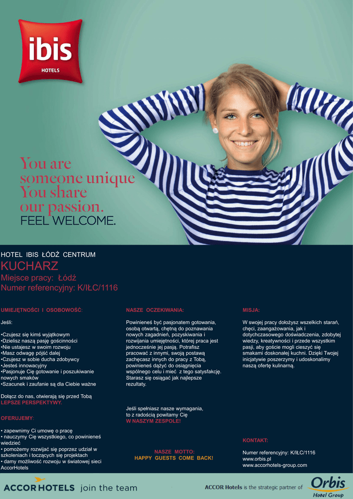 HOTEL IBIS ŁÓDŹ CENTRUM KUCHARZ Miejsce pracy: Łódź Numer referencyjny: K/IŁC/1116 UMIEJĘTNOŚCI I OSOBOWOŚĆ: NASZE OCZEKIWANIA: MISJA: Jeśli: Powinieneś być pasjonatem gotowania, osobą otwartą, chętną do poznawania nowych zagadnień, pozyskiwania i rozwijania umiejętności, której praca jest jednocześnie jej pasją. Potrafisz pracować z innymi, swoją postawą zachęcasz innych do pracy z Tobą, powinieneś dążyć do osiągnięcia wspólnego celu i mieć z tego satysfakcję. Starasz się osiągać jak najlepsze rezultaty. W swojej pracy dołożysz wszelkich starań, chęci, zaangażowania, jak i dotychczasowego doświadczenia, zdobytej wiedzy, kreatywności i przede wszystkim pasji, aby goście mogli cieszyć się smakami doskonałej kuchni. Dzięki Twojej inicjatywie poszerzymy i udoskonalimy naszą ofertę kulinarną. •Czujesz się kimś wyjątkowym •Dzielisz naszą pasję gościnności •Nie ustajesz w swoim rozwoju •Masz odwagę pójść dalej •Czujesz w sobie ducha zdobywcy •Jesteś innowacyjny •Pasjonuje Cię gotowanie i poszukiwanie nowych smaków •Szacunek i zaufanie są dla Ciebie ważne Dołącz do nas, otwierają się przed Tobą LEPSZE PERSPEKTYWY. OFERUJEMY: • zapewnimy Ci umowę o pracę • nauczymy Cię wszystkiego, co powinieneś wiedzieć • pomożemy rozwijać się poprzez udział w szkoleniach i toczących się projektach • damy możliwość rozwoju w światowej sieci AccorHotels Jeśli spełniasz nasze wymagania, to z radością powitamy Cię W NASZYM ZESPOLE! KONTAKT: NASZE MOTTO: HAPPY GUESTS COME BACK! Numer referencyjny: K/IŁC/1116 www.orbis.pl www.accorhotels-group.com