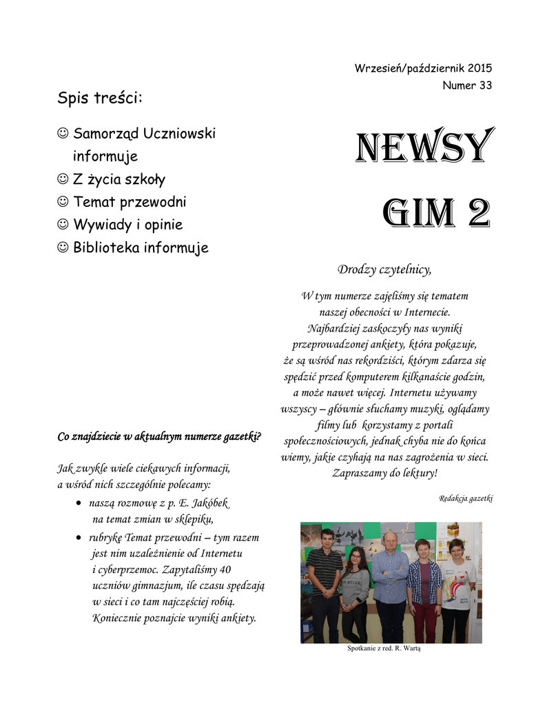 Wrzesień/październik 2015 Numer 33 Spis treści: Samorząd Uczniowski informuje Z życia szkoły Temat przewodni Wywiady i opinie Biblioteka informuje Newsy Gim 2 Drodzy czytelnicy, Co znajdziecie w aktualnym numerze gazetki? Jak zwykle wiele ciekawych informacji, a wśród nich szczególnie polecamy: naszą rozmowę z p. E. Jakóbek na temat zmian w sklepiku, rubrykę Temat przewodni – tym razem jest nim uzależnienie od Internetu i cyberprzemoc. Zapytaliśmy 40 uczniów gimnazjum, ile czasu spędzają w sieci i co tam najczęściej robią. Koniecznie poznajcie wyniki ankiety. W tym numerze zajęliśmy się tematem naszej obecności w Internecie. Najbardziej zaskoczyły nas wyniki przeprowadzonej ankiety, która pokazuje, że są wśród nas rekordziści, którym zdarza się spędzić przed komputerem kilkanaście godzin, a może nawet więcej. Internetu używamy wszyscy – głównie słuchamy muzyki, oglądamy filmy lub korzystamy z portali społecznościowych, jednak chyba nie do końca wiemy, jakie czyhają na nas zagrożenia w sieci. Zapraszamy do lektury! Redakcja gazetki Spotkanie z red. R. Wartą Samorząd Uczniowski informuje Rocznica Polskiego Państwa Podziemnego 27 września uczniowie naszej szkoły wzięli udział w uroczystościach związanych z obchodami 76 rocznicy powstania Polskiego Państwa Podziemnego. Uroczystości rozpoczęły się w kościele garnizonowym, w którym została odprawiona msza w intencji poległych w czasie II wojny światowej. Następnie przez Stare Miasto przemaszerowały poczty sztandarowe oraz inni uczestnicy obchodów, którzy skierowali się do Muzeum Etnograficznego. Tam odbyła się akademia z udziałem dzieci i młodzieży toruńskich szkół: SP7, SP27, SP32, ZSE. Nasi gimnazjaliści, głównie z klas 2a, 3a, 3b i 3c, śpiewali w chórze piosenki patriotyczne, a niezwykłe solistki, przygotowane przez p. A. Brożek i p. L. Gołębiowskiego, Wiktoria Parulska, Wiktoria Dzioba, Wiktoria Jankiewicz oraz Liwia Krajnik, koncertowo wykonały piosenki: Gdzie są kwiaty z tamtych lat i Za wolność. Publiczność przyłączała się do wspólnego śpiewania pieśni oraz oglądała wystawiony sprzęt wojskowy. Na chętnych czekała także pyszna grochówka. W trakcie uroczystości młodzież zachowywała się godnie, co docenił gen. Bogusław Pacek, który powiedział, że dzięki właśnie takiej młodzieży Jeszcze Polska nie zginęła. Kasia i Natalia K. Wybory do Samorządu Uczniowskiego 12 października w naszej szkole odbyły się wybory do Samorządu Uczniowskiego. W tym roku startowało 5 kandydatów: W. Parulska z Ia, N. Grabowska z IIc, W. Lewandowska z IIc, N. Żuchowska z IIIb oraz P. Sztandarski również z IIIb. Do trójki samorządu szkolnego dostali się Weronika Lewandowska (przewodnicząca), Wiktoria Parulska (zastępca) oraz Przemysław Sztandarski (rzecznik). Nad wyborami pieczę sprawował nauczyciel religii, pan Paweł Lubrański, który tydzień wcześniej został wybrany przez uczniów na opiekuna samorządu. Przemek Z życia szkoły Narodowe czytanie Lalki Bolesława Prusa W ramach przyłączenia się naszej szkoły do 4. edycji Narodowego Czytania 7 września na jednej godzinie lekcyjnej nauczyciele we wszystkich klasach odczytali fragment Lalki. Do wyboru były trzy rozdziały zaproponowane przez literaturoznawcę p. Bronisława Maja. W ten sposób wszyscy mieliśmy okazję odrobinę posłuchać powieści Bolesława Prusa. 2 Festyn w Biskupinie 25 września nasze gimnazjum wspólnie ze Szkołą Podstawową nr 2 wzięło udział w XXI Festynie Archeologicznym w Biskupinie, który w tym roku odbywał się pod hasłem przewodnim Smaki przeszłości. Podczas festynu mogliśmy dowiedzieć się, co jedli nasi przodkowie z epoki kamienia i neolitu oraz czym żywiono się w kulturze łużyckiej i wczesnym średniowieczu. Skorzystaliśmy również z innych atrakcji tej plenerowej imprezy, m.in. obejrzeliśmy walki wojów, słuchaliśmy koncertów, braliśmy udział w warsztatach tanecznych. Po poznaniu biskupińskich smaków przeszłości pojechaliśmy do Zaurolandii Rodzinnego Parku Rozrywki w Rogowie. Dobrą zabawę zawdzięczamy p. Alicji Brożek, która, jak co roku, zorganizowała tę wycieczkę. Daria Noc Naukowców 25 września wszyscy chętni uczniowie pod opieką p. Lewandowskiej i p. Orzłowskiej wybrali się do Młyna Wiedzy na Toruńską Noc Naukowców. Wydarzenie rozpoczęło się o godzinie 18:00, a zakończyło o 22:00. Podczas tej nocy każdy uczestnik mógł wejść bezpłatnie do Młyna Wiedzy i obejrzeć przygotowane tam wystawy. Każde piętro dotyczyło innego zagadnienia i dodatkowo każdy temat wzbogacany był różnorodnymi doświadczeniami. Poza atrakcjami w Młynie, przygotowane były także stoiska w namiotach, w których można było obejrzeć ciekawe zjawiska naukowe. Braliśmy również udział w pokazach oraz doświadczeniach chemicznych. Na zakończenie imprezy usłyszeliśmy interesujący wykład o działaniu wiązki laserowej, a zaraz potem obejrzeliśmy pokaz laserowy wyświetlany na murach Młyna oraz w chmurach dymu. Krótko mówiąc, mogliśmy poczuć działanie lasera na własnej skórze. Z Nocy Naukowców wszyscy wróciliśmy do domów bardzo zadowoleni. Następna taka niezwykła noc już za rok. Natalia K. RKO 16 października wzięliśmy udział w biciu rekordu liczby osób prowadzących jednocześnie resuscytację krążeniowo – oddechową. Akcja została zorganizowana przez WOŚP. Każdy z nas, a było nas ponad 60 uczniów, wykonał RKO raz lub kilka razy, i każdy wykonał to świetnie. W akcji wzięło udział również kilku nauczycieli. Całe wydarzenie było filmowane, aby potwierdzić, ile osób brało w nim udział i czy został pobity rekord. Na wynik jeszcze czekamy! Natalia Ż. 3 Książki naszych marzeń - filmik Na stronie www.youtube.com można obejrzeć Koszmar senny – film Gimnazjum nr 2 w Toruniu na konkurs Książki naszych marzeń zrealizowany przez uczniów na
