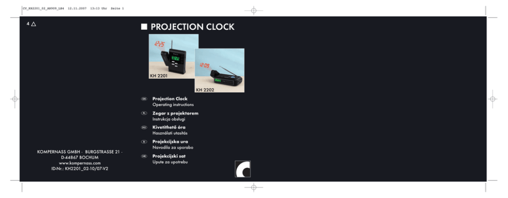 CV_KH2201_02_AR909_LB4 12.11.2007 13:13 Uhr Seite 1 4 PROJECTION CLOCK KH 2201 KH 2202 Projection Clock Operating instructions Zegar z projektorem Instrukcja obsługi Kivetíthető óra Használati utasítás KOMPERNASS GMBH · BURGSTRASSE 21 · D-44867 BOCHUM www.kompernass.com ID-Nr.: KH2201_02-10/07-V2 Projekcijska ura Navodila za uporabo Projekcijski sat Upute za upotrebu CV_KH2201_02_AR909_LB4 12.11.2007 13:13 Uhr KH 2201 q Seite 5 KH 2202 w e w r u i s t y u i o a e r d k l o a 2) s j d f h ; l k g h j q t y f g ; IB_KH2201_02_AR909_UK_4.qxd 12.11.2007 13:10 Uhr LIST OF CONTENTS Seite 3 PAGE Safety instructions Intended Use Items supplied Operating Elements Technical data Placement Operation 4 5 6 6 7 8 8 Radio operation 9 Setting up the telescope aerial 9 Setting the time 10 Setting the alarm time 10 Snooze Function 11 Projection 11 Background lighting for the display and projection 11 Cleaning CE- Conformity Disposal Warranty and Service Importer 11 12 12 13 14 Read these operating instructions carefully before using the appliance for the first time and preserve this manual for later reference. Pass this manual on to whoever might acquire the appliance at a future date. -3- IB_KH2201_02_AR909_UK_4.qxd 12.11.2007 13:10 Uhr Seite 4 PROJECTION CLOCK Safety instructions To avoid fatal injury through electric shock: • Use the clock in dry environments only. • Make sure that fluids or any other objects do not get inside the device. • Do not place objects containing fluids, e.g. flower vases, on the appliance. To avoid burn and other injuries: • Place the appliance in an open and well-ventilated area so that heat pockets cannot be created within it. Never cover the ventilation slits! • Do not place open fire sources, e.g. candles, on the appliance. • Avoid close proximity to heat sources, e.g. direct solar radiation, heaters and other appliances etc.! • This appliance is not intended for use by individuals (including children) with restricted physical, physiological or intellectual abilities or deficiences in experience and/or knowledge unless they are supervised by a person responsible for their safety or receive from this person instruction in how the appliance is to be used. • Children should be supervised to ensure that they do not play with the appliance.. Electro-magnetic fields This appliance complies with the statutory limits for electro-magnetic compatibility! If you still have any doubts regarding its use in bedrooms: • Place the appliance about half a meter from the bed. From this distance the electro magnetic fields are no longer effective even for electro sensitive people itself. -4- IB_KH2201_02_AR909_UK_4.qxd 12.11.2007 13:10 Uhr Seite 5 Note: This appliance is equipped with non-slip rubber feet. As floor and furniture upper surfaces comprise of various materials and are cleaned with various types of polishes and/or cleaning agents, it cannot be completely excluded that some of these substances contain components that could attack the rubber pads and soften them. If possible place an anti-slip material under the feet of the appliance. Note: In certain countries there could be special regulations in force regarding the allocated radio frequency ranges. Take note that you may not exploit these radio services, pass details heard from them on to third parties or otherwise improperly misuse them. Intended Use The equipment is intended for employment as an alarm clock, using a tone signal, and for receiving radio transmissions. Any other usage of, or modification to, the appliance is deemed to be improper usage and carries the risk of serious personal injury. The manufacturer accepts no liability for damages that result from improper use of the appliance or are caused by the incorrect operation of it. Not intended for commercial use. -5- IB_KH2201_02_AR909_UK_4.qxd 12.11.2007 13:10 Uhr Seite 6 Items supplied After unpacking the appliance, immediately check to determine that all listed items are present and that the appliance is in a faultless condition. 1 Projection clock with radio, 1 Operating manual The batteries and a 3V-mains adaptor (accessories), required for operation, are not included in the supply. Operating Elements q Projection lens w Telescopic antenna e Button Snooze r Projection, Display illumination t Display y Frequency scale u Button Alarm i Button Hour o Button Time a Button Min (Minute) s Loudspeakers d Projection focus f Tuning wheel g Volume controller VOLUME / BUZZ h External 3V Direct current connection for 4.0 mm x 1.7 mm barrel connector j Battery Compartment k Switch-Projection ON/OFF l Switch - Alarm ON/OFF ; Waveband selector FM/AM 2) Stand-up support (only Model KH 2202) -6- IB_KH2201_02_AR909_UK_4.qxd 12.11.2007 13:10 Uhr Seite 7 Technical data Power rating: 3V Rated current : 300 mA Frequency range : FM (VHF) 87.5 - 108 MHz AM (MW) 530 - 1600 kHz Dimensions: KH 2201 14.2 cm x 13.1 cm x 3.8 cm KH 2202 17 cm x 8.8 cm x 4.2 cm Weight : KH 2201 and KH 2202: ca. 245 gr. Operating temperature : 5°C - 40°C at <85% rel. humidity Batteries: (Batteries not supplied) • Model KH 2201: 1.5 V Type Mignon/AA • Model KH 2202: 1.5 V Type Micro/AAA • 2 x 1.5 V for radio operation, display illumination and projection • 1 x 1.5 V for the LCD clock (the compartment is described in “CLOCK USE“) Mains adapter: (Item not supplied) Rated voltage: DC 3V (+/- 5%) Rated current : min. 300 mA Barrel connector: 4.0 mm x 1.7 mm When using a 3 V mains adaptor, a battery must be inserted into the compartment “CLOCK USE”. Otherwise, the clock will not function. -7- IB_KH2201_02_AR909_UK_4.qxd 12.11.2007 13:10 Uhr Seite 8 Placement • Place the projection clock onto a level surface. • Position the projection clock such that the projection lens q is directed onto an empty surface. Only Model KH 2202: • Fold out the stand-up support 2). Operation Connect the external mains adaptor This appliance can be operated with an external mains adaptor.