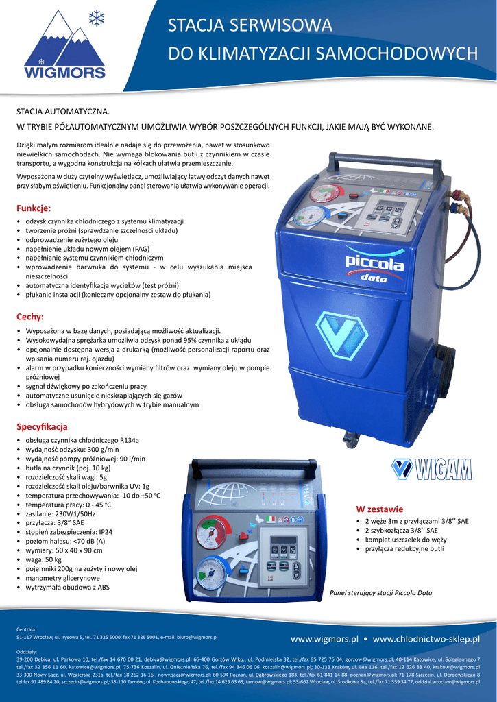 STACJA SERWISOWA DO KLIMATYZACJI SAMOCHODOWYCH STACJA AUTOMATYCZNA. W TRYBIE PÓŁAUTOMATYCZNYM UMOŻLIWIA WYBÓR POSZCZEGÓLNYCH FUNKCJI, JAKIE MAJĄ BYĆ WYKONANE. Dzięki małym rozmiarom idealnie nadaje się do przewożenia, nawet w stosunkowo niewielkich samochodach. Nie wymaga blokowania butli z czynnikiem w czasie transportu, a wygodna konstrukcja na kółkach ułatwia przemieszczanie. Wyposażona w duży czytelny wyświetlacz, umożliwiający łatwy odczyt danych nawet przy słabym oświetleniu. Funkcjonalny panel sterowania ułatwia wykonywanie operacji. Funkcje: • • • • • • odzysk czynnika chłodniczego z systemu klimatyzacji tworzenie próżni (sprawdzanie szczelności układu) odprowadzenie zużytego oleju napełnienie układu nowym olejem (PAG) napełnianie systemu czynnikiem chłodniczym wprowadzenie barwnika do systemu - w celu wyszukania miejsca nieszczelności • automatyczna identyfikacja wycieków (test próżni) • płukanie instalacji (konieczny opcjonalny zestaw do płukania) Cechy: • Wyposażona w bazę danych, posiadającą możliwość aktualizacji. • Wysokowydajna sprężarka umożliwia odzysk ponad 95% czynnika z ukłądu • opcjonalnie dostępna wersja z drukarką (możliwość personalizacji raportu oraz wpisania numeru rej. ojazdu) • alarm w przypadku konieczności wymiany filtrów oraz wymiany oleju w pompie próżniowej • sygnał dźwiękowy po zakończeniu pracy • automatyczne usunięcie nieskraplających się gazów • obsługa samochodów hybrydowych w trybie manualnym Specyfikacja • • • • • • • • • • • • • • • • • obsługa czynnika chłodniczego R134a wydajność odzysku: 300 g/min wydajność pompy próżniowej: 90 l/min butla na czynnik (poj. 10 kg) rozdzielczość skali wagi: 5g rozdzielczość skali oleju/barwnika UV: 1g temperatura przechowywania: -10 do +50 oC temperatura pracy: 0 - 45 oC zasilanie: 230V/1/50Hz przyłącza: 3/8” SAE stopień zabezpieczenia: IP24 poziom hałasu: <70 dB (A) wymiary: 50 x 40 x 90 cm waga: 50 kg pojemniki 200g na zużyty i nowy olej manometry glicerynowe wytrzymała obudowa z ABS Centrala: 51-117 Wrocław, ul. Irysowa 5, tel. 71 326 5000, fax 71 326 5001, e-mail: [email protected] W zestawie • • • • 2 węże 3m z przyłączami 3/8’’ SAE 2 szybkozłącza 3/8’’ SAE komplet uszczelek do węży przyłącza redukcyjne butli Panel sterujący stacji Piccola Data www.wigmors.pl • www.chlodnictwo-sklep.pl Oddziały: 39-200 Dębica, ul. Parkowa 10, tel./fax 14 670 00 21, [email protected]; 66-400 Gorzów Wlkp., ul. Podmiejska 32, tel./fax 95 725 75 04; [email protected]; 40-114 Katowice, ul. Ściegiennego 7 tel./fax 32 356 11 60, [email protected]; 75-736 Koszalin, ul. Gnieźnieńska 76, tel./fax 94 346 06 06, [email protected]; 30-133 Kraków, ul. Lea 116, tel./fax 12 626 83 40, [email protected] 33-300 Nowy Sącz, ul. Węgierska 231a, tel./fax 18 262 16 16 , [email protected]; 60-594 Poznań, ul. Dąbrowskiego 183, tel./fax 61 841 14 88, [email protected]; 71-178 Szczecin, ul. Derdowskiego 8 tel.fax 91 489 84 20; [email protected]; 33-110 Tarnów; ul. Kochanowskiego 47, tel./fax 14 629 63 63, [email protected]; 53-662 Wrocław, ul. Środkowa 3a, tel./fax 71 359 34 77, [email protected]