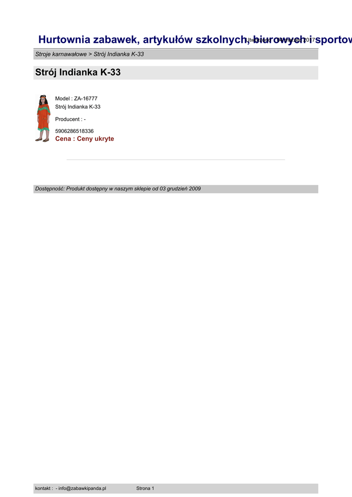 : 04 marzec 2017 Hurtownia zabawek, artykułów szkolnych,Utworzono biurowych i sportow Stroje karnawałowe > Strój Indianka K-33 Strój Indianka K-33 Model : ZA-16777 Strój Indianka K-33 Producent : 5906286518336 Cena : Ceny ukryte Dostępność: Produkt dostępny w naszym sklepie od 03 grudzień 2009 kontakt : - [email protected] Strona 1