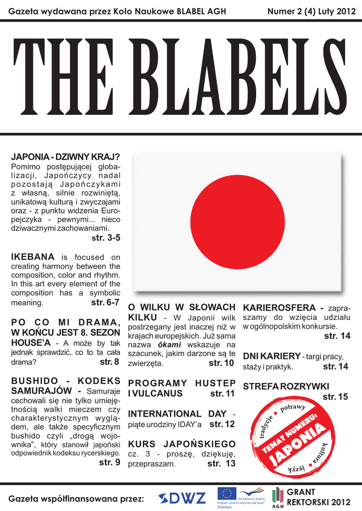 Gazeta wydawana przez Koło Naukowe BLABEL AGH Numer 2 (4) Luty 2012 JAPONIA - DZIWNY KRAJ? Pomimo postępującej globalizacji, Japończycy nadal pozostają Japończykami z własną, silnie rozwiniętą, unikatową kulturą i zwyczajami oraz - z punktu widzenia Europejczyka - pewnymi... nieco dziwacznymi zachowaniami. str. 3-5 IKEBANA is focused on creating harmony between the composition, color and rhythm. In this art every element of the composition has a symbolic meaning. str. 6-7 O WILKU W SŁOWACH KARIEROSFERA - zapraKILKU - W Japonii wilk szamy do wzięcia udziału P O C O M I D R A M A , postrzegany jest inaczej niż w w ogólnopolskim konkursie. W KOŃCU JEST 8. SEZON krajach europejskich. Już sama str. 14 HOUSE’A - A może by tak nazwa ōkami wskazuje na jednak sprawdzić, co to ta cała szacunek, jakim darzone są te DNI KARIERY - targi pracy, drama? str. 8 zwierzęta. str. 10 staży i praktyk. str. 14 BUSHIDO - KODEKS PROGRAMY HUSTEP STREFA ROZRYWKI SAMURAJÓW - Samuraje I VULCANUS str. 11 str. 15 cechowali się nie tylko umiejętnością walki mieczem czy charakterystycznym wyglą- INTERNATIONAL DAY dem, ale także specyficznym piąte urodziny IDAY’a str. 12 bushido czyli „drogą wojownika”, który stanowił japoński KURS JAPOŃSKIEGO odpowiednik kodeksu rycerskiego. cz. 3 - proszę, dziękuję, str. 9 przepraszam. str. 13 Gazeta współfinansowana przez: : A I N O P NU T MA E T JA RU E M GRANT REKTORSKI 2012 KALENDARIUM LUTY 2012 16.02 CZ THE BLUESMOBILE BAND (GW) 17.02 PT ŚWIATOWY DZIEŃ KOTA 18.02 SO Maski w zachodnim Piemoncie (Instytuł Cervantesa) MARZEC 2012 PAWEŁ ORKISZ (Pub Kuranty) BREATH & MIRACLE (GW) DYSKOTEKA W STUDIO CZ 1.03 PT 2.03 . SO 3.03 19.02 ND ND 4.03 20.02 PN PROJEKT GÓRA FUJI (MANGGHA) GRZEGORZ TURNAU (STUDIO) 21.02 WT wzROCKowisko: GARY MOORE (GW) DachOOFka 4: THAIM (ZA) WT 6.03 22.02 ŚR STUDIO KABARETU (GW) ŚR 7.03 23.02 CZ KRECIA ROBOTA (GWAREK) 24.02 PT SHANTIES (STUDIO) 25.02 SO SHANTIES (STUDIO) 26.02 ND BEZ GWARU: R. KASPRZYCKI (GW) ND 11.03 27.02 PN SPOTKANIE BLABELA PN 12.03 28.02 WT SPOTKANIE Z KULTURĄ (STUDIO) wzROCKowisko: QUEEN (GW) WT 13.03 29.02 ŚR STUDIO KABARETU: JURKI (STUDIO) INŻYNIERSKIE TARGI PRACY DZIEŃ KOBIET KARIEROSFERA- START KONCERT OR AGH (GW) CZ 8.03 PT 9.03 KARAOKE NA ŻYWO (ZA) SO 10.03 DZIEŃ MĘŻCZYZNY . STUDIO KABARETU (STUDIO) ŚWIATOWY DZIEŃ LICZBY PI Redakcja: Urszula Strojny, Wojciech Jarosz, Bartosz Madziar, Aleksandra Rzemyk, Aleksandra Ginter, Marcin Stelmach Opiekun naukowy: Magdalena Pabisiak, Anna Cisowska Skład i oprawa graficzna: osFlake (www.sniezek.eu) Druk: Drukarnia SKOTGRAF, ul. Smolki 5 / 402, 30-513 Kraków Nakład: 500 szt. Kolportaż: Akademia Górniczo - Hutnicza w Krakowie 2 PO 5.03 ŚR 14.03 JAPONIA - DZIWNYWojciech KRAJ? Jarosz CZYLI OPOWIEŚCI O KRAJU KWITNĄCEJ WIŚNI (PRAWIE) Z PIERWSZEJ RĘKI Japonia - górzysty kraj wyspiarski, którego cywilizacja najpierw rozwijała się w izolacji, potem z politycznych i religijnych powodów została odcięta od krajów Zachodu. Japończycy - od wieków zdani praktycznie tylko na siebie, stanowiący hermetyczne społeczeństwo, które dopiero stosunkowo niedawno zaczęło powoli otwierać się na inne kultury. Nic dziwnego więc, że pomimo postępującej globalizacji, Japończycy nadal pozostają Japończykami z własną, silnie rozwiniętą, unikatową kulturą i zwyczajami oraz z punktu widzenia Europejczyka pewnymi… nieco dziwacznymi zachowaniami. Przyczyny takich zachowań oraz ich analizy zostały opisane w wielu książkach i publikacjach, a pisać o nich można by miesiącami. Dlatego skupię się na kilku sytuacjach z udziałem Japończyków, które dotyczyły bezpośrednio mnie lub moich znajomych. Sytuacja I Gaijin oraz różnica pokoleń Miejsce akcji: jeden z krakowskich supermarketów Gdy przechadzałem się ulicą Grodzką w Krakowie, mijając większy sklep, stwierdziłem, że wstąpię do niego na chwilę uzupełnić domowe zapasy. W środku usłyszałem znajomy ton głosu - języka japońskiego nie sposób pomylić z jakimkolwiek innym (różni się znacząco od np. chińskiego). Zauważyłem dwie kobiety - jedną młodszą, drugą starszą. Wyglądały jak matka z córką, ale uwaga, nie dajcie się zwieść, bo w Japonii wszystkie kobiety przed menopauzą wyglądają na 25 lat lub mniej. Zauważyłem, że nie mogą dojść do porozumienia w sprawie wyboru… zupek instant, które były opisane tylko po polsku. Podszedłem i, w miarę moich umiejętności językowych, grzecznie zaproponowałem pomoc. Widząc mnie, starsza kobieta schowała się za młodszą, położyła ręce na jej plecach, niczym dziecko chowające się za mamą, gdy zobaczy „potwora”. Młodsza, ignorując zachowanie Starszej, zapytała mnie o smak zupki, którą właśnie trzymała w ręku. Zapomniałem, jak po japońsku brzmi „kurczak”, więc wyjaśniłem, że danie ma „smak mięsa z ptaka, który jest często hodowany w gospodarstwach”. Młodsza, chcąc się upewnić pomachała rękami udając, że ma skrzydła i zapytała „Czikin?”. Potwierdziłem, na co Młodsza bardzo grzecznie mi podziękowała i powiedziała, że tego właśnie szukały. Starsza jedynie nieco drżącym głosem rzuciła mi charakterystyczne „Senkju” na pożegnanie. Wtedy pierwszy raz zetknąłem się z faktem, że dla Japończyka zawsze będę Gaijinem (外 人 ), czyli, jak mówią znaki, osobą z zewnątrz. Choć Japończycy czasami o tym zapominają i bariera się zmniejsza, to jednak nigdy „przyjezdny” nie będzie traktowany jak „swój”. Widać też bardzo dużą różnicę pomiędzy pokoleniami - młodsi są wychowywani w dobie zaawansowanej globalizacji oraz powszechnym dostępie do Internetu, więc nie mają aż takich barier, jak ich rodzice czy dziadkowie. Sytuacja II Dukany angielski i wszyscy jesteśmy z Ameryki Miejsce: zlot Skautów, Szwecja Miałem wyjątkową okazję poznać wielu ciekawych Japończyków na największym zloci