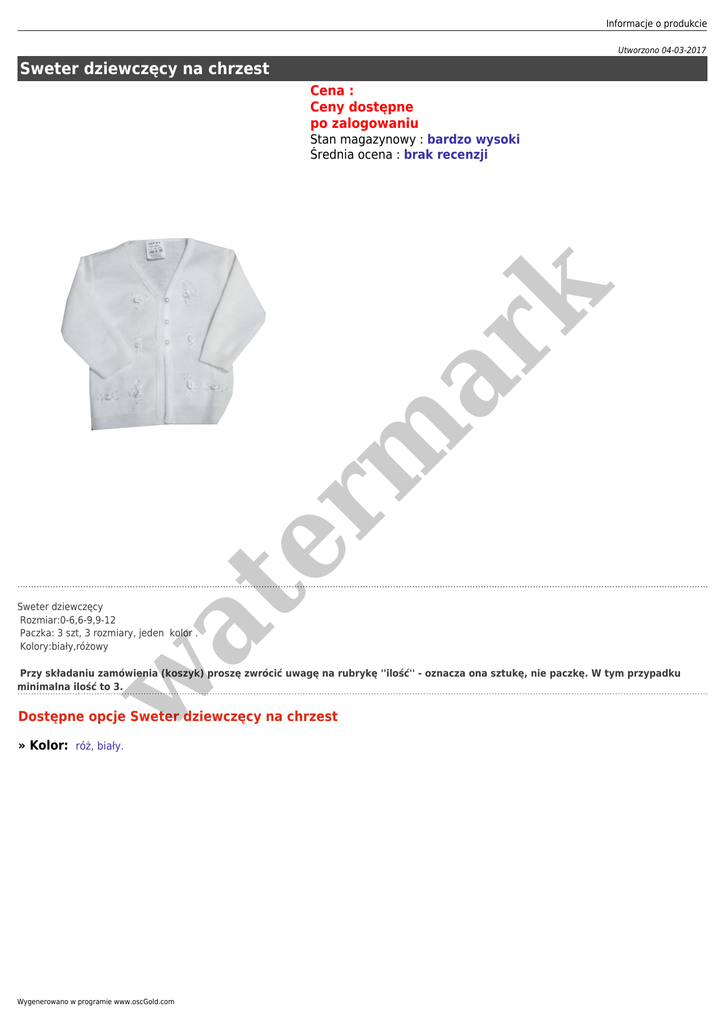 Informacje o produkcie Utworzono 04-03-2017 Sweter dziewczęcy na chrzest Cena : Ceny dostępne po zalogowaniu at er m ar k Stan magazynowy : bardzo wysoki Średnia ocena : brak recenzji Sweter dziewczęcy Rozmiar:0-6,6-9,9-12 Paczka: 3 szt, 3 rozmiary, jeden kolor . Kolory:biały,różowy w Przy składaniu zamówienia (koszyk) proszę zwrócić uwagę na rubrykę ''ilość'' - oznacza ona sztukę, nie paczkę. W tym przypadku minimalna ilość to 3. Dostępne opcje Sweter dziewczęcy na chrzest » Kolor: róż, biały. Wygenerowano w programie www.oscGold.com