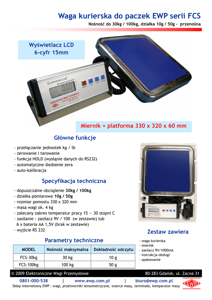 Waga kurierska do paczek EWP serii FCS Nośność do 30kg / 100kg, działka 10g / 50g - przenośna Wyświetlacz LCD 6-cyfr 15mm Miernik + platforma 330 x 320 x 60 mm Główne funkcje - przełączanie jednostek kg / lb zerowanie i tarowanie funkcja HOLD (wysłąnie danych do RS232) automatyczne śledzenie zera auto-kalibracja Specyfikacja techniczna dopuszczalne obciążenie 30kg / 100kg działka pomiarowa 10g / 50g rozmiar pomostu 330 x 320 mm masa wagi ok. 4 kg zalecany zakres temperatur pracy 15 — 30 stopni C zasilanie : zasilacz 9V / 100 (w zestawie) lub 6 x bateria AA 1,5V (brak w zestawie) - wyjście RS 232 - Zestaw zawiera Parametry techniczne MODEL Nośność maksymalna Dokładność odczytu FCS-30kg 30 kg 10 g FCS-100kg 100 kg 50 g © 2009 Elektroniczne Wagi Przemysłowe 0801-000-538 | www.ewp.com.pl - waga kurierska - miernik - zasilacz 9V/1000mA - instrukcja obsługi - opakowanie 80-283 Gdańsk, ul. Zacna 31 | [email protected] Sklep internetowy EWP : wagi, przetworniki tensometryczne, wzorce masy, terminale, komparator masy