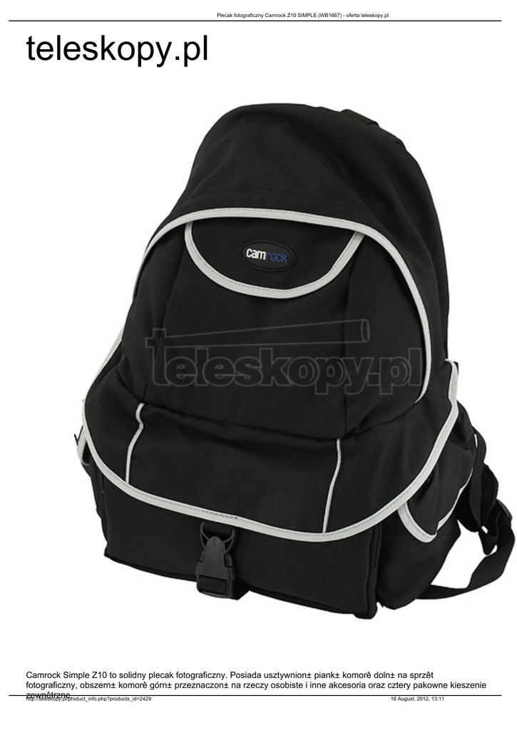 Plecak fotograficzny Camrock Z10 SIMPLE (WB1667) - oferta teleskopy.pl teleskopy.pl Camrock Simple Z10 to solidny plecak fotograficzny. Posiada usztywnion± piank± komorê doln± na sprzêt fotograficzny, obszern± komorê górn± przeznaczon± na rzeczy osobiste i inne akcesoria oraz cztery pakowne kieszenie zewnêtrzne. http://teleskopy.pl/product_info.php?products_id=2429 18 August, 2012, 13:11 Plecak fotograficzny Camrock Z10 SIMPLE (WB1667) - oferta teleskopy.pl Komora fotograficzna mo¿e byæ dowolnie podzielona na 6 czê¶ci dziêki przestawialnym przegrodom, które zapewniaj± optymalne wykorzystanie przestrzeni oraz perfekcyjne dopasowanie do sprzêtu. Wnêtrze wykonane zosta³o z usztywnionej pianki pokrytej materia³em co zapewnia jeszcze wiêksze bezpieczeñstwo przenoszonego sprzêtu. Dodatkowe bezpieczeñstwo zapewniaj± kryte zamki oraz klamra zabezpieczaj±c±. Du¿a komora górna pomie¶ci prowiant, kurtkê, butelkê, dodatkowe akcesoria fotograficzne, dokumenty, klucze, d³ugopisy, ksi±¿kê, itp. Dwie zewnêtrzne kieszenie przednie oraz boczne przeznaczone s± na dodatkowe wyposa¿enie i inne niezbêdne rzeczy. System no¶ny plecaka to specjalnie wyprofilowane, komfortowe (oddychaj±ce) szelki o regulowanej d³ugo¶ci. Szelki posiadaj± zabezpieczaj±cy pasek piersiowy oraz specjalne ta¶my pozwalaj±ce na przypiêcie dodatkowych futera³ów oraz przedmiotów takich jak np.: MP3 Player czy telefon komórkowy. Dodatkowo plecak posiada wygodny uchwyt do przenoszenia w rêku w pozycji pionowej. Oddychaj±cy materia³ na ¶ciance przylegaj±cej do pleców oraz szelkach zapewnia wentylacjê podczas noszenia. SPECYFIKACJA Materia³y, z których wykonany zosta³ plecak, gwarantuj± jego niezwyk³± wytrzyma³o¶æ. S± to: 700D Poliester, 160D poliestrowy Ripstop, specjalny rodzaj nylonu 2010D TXP, pianka PE. Wymiary zewnêtrzne • wysoko¶æ: 40 cm • szeroko¶æ: 33 cm • g³êboko¶æ: 21 cm Wymiary wewnêtrzne Komora g³ówna fotograficzna • wysoko¶æ: 17 cm • szeroko¶æ: 26 cm • g³êboko¶æ : 15 cm Komora górna • wysoko¶æ: 20 cm • szeroko¶æ: 27 cm Waga: 0,7 kg http://teleskopy.pl/product_info.php?products_id=2429 18 August, 2012, 13:11 Plecak fotograficzny Camrock Z10 SIMPLE (WB1667) - oferta teleskopy.pl Plecak Camrock Simple Z10 pomie¶ci m.in. takie aparaty jak: • Canon EOS 550D, 500D, 450D, 400D, 350D, 300D, 1000D, 60D, 50D, 40D, 30D, 20D, 7D, 5D Mark II, 5D, 1D, 1Ds Mark IV • Nikon D3X, D3S, D3, D2H, D2, D700, D400, D300S, D300, D200, D100, D5000, D3100, D3000, D90, D80, D70s, D60, D40, D40X • Sony Alpha A900, A850, A700, A550, A500, A450, A390, A380, A350, A330, A300, A290, A230, A200, A100 • Olympus E-30, E-3, E-620, E-520, E-510, E-500, E-450, E-420, E-410, E-400, E-330, E-300 • Pentax K-7, K-x, K-m, K20D, K10D, K200D, K110D, K100D, K100D Super • Fuji Finepix S1 Pro, S2 Pro, S5 Pro • Samsung GX-20, GX-10, GX-1L, GX-1S http://teleskopy.pl/product_info.php?products_id=2429 18 August, 2012, 13:11