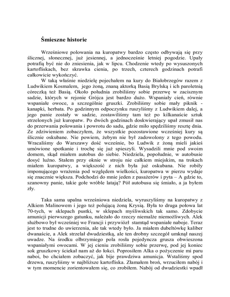 Śmieszne historie Wrześniowe polowania na kuropatwy bardzo często odbywają się przy ślicznej, słonecznej, już jesiennej, a jednocześnie letniej pogodzie. Upały potrafią być nie do zniesienia, jak w lipcu. Chodzenie wtedy po wysuszonych kartofliskach, bez skrawka cienia, po trzech, czterech godzinach potrafi całkowicie wykończyć. W taką właśnie niedzielę pojechałem na kury do Białobrzegów razem z Ludwikiem Kosmalem, jego żoną, znaną aktorką Basią Brylską i ich paroletnią córeczką też Basią. Około południa zrobiliśmy sobie przerwę w zacisznym sadzie, których w rejonie Grójca jest bardzo dużo. Wspaniały cień, równie wspaniałe owoce, a szczególnie gruszki. Zrobiliśmy sobie mały piknik kanapki, herbata. Po godzinnym odpoczynku ruszyliśmy z Ludwikiem dalej, a jego panie zostały w sadzie, zostawiliśmy tam też po kilkanaście sztuk strzelonych już kuropatw. Po dwóch godzinach doskwierający upał zmusił nas do przerwania polowania i powrotu do sadu, gdzie miło spędziliśmy resztę dnia. Ze zdziwieniem zobaczyłem, że wszystkie pozostawione wcześniej kury są ślicznie oskubane. Nie powiem, żebym nie był zadowolony z tego powodu. Wracaliśmy do Warszawy dość wcześnie, bo Ludwik z żoną mieli jakieś umówione spotkanie i trochę się już spieszyli. Wysadzili mnie pod swoim domem, skąd miałem autobus do siebie. Niedziela, popołudnie, w autobusie dosyć luźno. Stałem przy oknie w stroju nie całkiem miejskim, na trokach miałem kuropatwy, a większość z nich była już oskubana. Nie robiły imponującego wrażenia pod względem wielkości, kuropatwa w pierzu wydaje się znacznie większa. Podchodzi do mnie jeden z pasażerów i pyta – A gdzie to, szanowny panie, takie gołe wróble latają? Pół autobusu się śmiało, a ja byłem zły. Taka sama upalna wrześniowa niedziela, wyruszyliśmy na kuropatwy z Alkiem Malinowem i jego też polującą żoną Krysią. Była to druga połowa lat 70-tych, w sklepach pustki, w sklepach myśliwskich tak samo. Zdobycie amunicji pierwszego gatunku, należało do rzeczy niemalże niemożliwych. Alek służbowo był wcześniej we Francji i przywiózł stamtąd wspaniałe naboje. Teraz jest to trudne do uwierzenia, ale tak wtedy było. Ja miałem dubeltówkę kaliber dwanaście, a Alek strzelał dwudziestką, ale ten drobny szczegół umknął naszej uwadze. Na środku olbrzymiego pola rosła pojedyncza grusza obwieszona wspaniałymi owocami. W jej cieniu zrobiliśmy sobie przerwę, pod jej koniec sok gruszkowy ściekał nam aż do łokci. Poprosiłem Alka o pożyczenie mi paru naboi, bo chciałem zobaczyć, jak bije prawdziwa amunicja. Wstaliśmy spod drzewa, ruszyliśmy w najbliższe kartofliska. Złamałem broń, wrzuciłem nabój i w tym momencie zorientowałem się, co zrobiłem. Nabój od dwudziestki wpadł głęboko do lufy i już poza komorą nabojową zaklinował się. Nie pomagały żadne próby wydobycia go, ani stukanie, ani wstrząsanie, ani dmuchanie, stałem się po prostu bezpieczny dla kuropatw. Musiałem poszukać drzewa z długimi, prostymi gałązkami, zrobiłem coś w rodzaju wycioru i takim kijkiem wybiłem nabój z lufy. Czasami trochę sprytu na polowaniu też się przydaje. więcej w Merkuriuszu Człuchowskim 2-3 (56-57) 2008