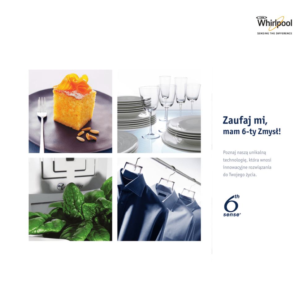 Zaufaj mi, mam 6-ty Zmysł! Poznaj naszą unikalną technologię, która wnosi innowacyjne rozwiązania do Twojego życia. Urządzenia Whirlpool 6-ty Zmysł Technologia 6-ty Zmysł Witaj w świecie 6-tego Zmysłu! Lodówki 6-ty Zmysł FreshControl Dłuższa świeżość przechowywanych produktów dzięki optymalnej wilgotności i błyskawicznie przywracanej idealnej temperaturze. Odkryj unikalną technologię Whirlpool 6-ty Zmysł, która w pełni kontroluje pracę urządzeń, gwarantując zawsze doskonałe rezultaty oraz niezwykle prostą obsługę przy możliwie najniższym zużyciu wody, energii i czasu. 6-ty Zmysł – poczuj różnicę! Technologia 6-ty Zmysł – najnowsze rozwiązania dla Twojego domu! Jako największy na świecie producent sprzętu AGD bardzo dobrze wiemy, czego oczekują nasi Klienci – doskonałych rezultatów i prostej obsługi. Dlatego właśnie stworzyliśmy technologię 6-ty Zmysł. Najnowocześniejszy układ sensorów, w połączeniu ze specjalnie opracowanymi przez naszych inżynierów algorytmami, pozwala sterować jednocześnie wieloma parametrami pracy urządzenia – nieustannie je kontroluje i optymalizuje zgodnie ze zmieniającymi się warunkami. W efekcie osiągamy najlepsze rezultaty prania, gotowania, zmywania czy przechowywania żywności, nie zużywając jednak więcej zasobów, niż jest to konieczne i zapewniając użytkownikowi prostą, intuicyjną obsługę – najczęściej za pomocą jednego przycisku. Dzięki technologii 6-ty Zmysł każdy z nas zyska więcej czasu dla siebie i rodziny oraz poczyni znaczne oszczędności w skali gospodarstwa domowego. Przyczyni się też do ochrony środowiska naturalnego. Zamrażarki 6-ty Zmysł Dłuższy czas przechowywania zamrożonych produktów dzięki szybkiemu przywracaniu optymalnej temperatury. Wysoka oszczędność energii. Pralki 6-ty Zmysł Kolory Unikalna ochrona tkanin i kolorów, oszczędność energii, detergentu i czasu. Suszarki 6-ty Zmysł AirCare Idealnie wysuszone tkaniny, mniej zagnieceń, oszczędność energii i czasu. Zmywarki 6-ty Zmysł PowerClean Gwarancja czystości nawet najbardziej zabrudzonych naczyń, bez konieczności wstępnego zmywania. Oszczędność wody, energii i czasu. Piekarniki 6-ty Zmysł Doskonałe rezultaty pieczenia za każdym razem. Automatyczny dobór programu, temperatury i czasu do wybranego przepisu. Oszczędność energii, możliwość przygotowywania kilku potraw w tym samym czasie. Płyty 6-ty Zmysł Szybkie i bezpieczne zagotowanie wody, automatyczne podtrzymanie temperatury, znaczna oszczędność energii. Kuchenki mikrofalowe 6-ty Zmysł Automatyczne dostosowanie ustawień czasu i mocy. Idealne rezultaty dzięki stałej kontroli procesu gotowania. Zaufaj technologii 6-ty Zmysł i ciesz się: 1. Prostą, intuicyjną obsługą Okapy 6-ty Zmysł Dostosowanie trybu pracy do intensywności oparów. Stała kontrola świeżości powietrza. 2. Doskonałymi rezultatami 3. Optymalnym zużyciem zasobów 6-TY ZMYSŁ URZĄDZENIA WHIRLPOOL 6-TY ZMYSŁ Chłodziarko-zamrażarki Zamrażarki Dłuższa świeżość produktów, optymalne warunki! Temperatura pod nieustanną kontrolą! Dzięki specjalnym czujnikom technologia 6-ty Zmysł FreshControl w lodówkach Whirlpool stale kontroluje poziom wilgotności i temperaturę wewnątrz urządzenia. Wie, kiedy zareagować i skutecznie przywrócić ich optymalny poziom nawet 5 razy szybciej niż w przypadku tradycyjnych modeli. Dzięki temu Twoje produkty pozostają świeże na długo. Technologia 6-ty Zmysł w zamrażarkach skrzyniowych Whirlpool wykrywa zmiany temperatury wewnątrz urządzenia. Algorytm na podstawie danych z czujników zarządza pracą kompresora, uruchamiając w razie konieczności tryb szybkiego zamrażania. 1. Prosta obsługa 1. Prosta obsługa Wystarczy, że umieścisz produkty w lodówce, a technologia 6-ty Zmysł FreshControl automatycznie ustawi odpowiednią temperaturę i zapewni optymalną wilgotność powietrza wewnątrz urządzenia. 2. Doskonałe rezultaty Gwarancja świeżej żywności nawet do 4 razy dłużej* w porównaniu z przechowywaniem w tradycyjnych modelach. 3. Optymalne zużycie zasobów Lodówki 6-ty Zmysł FreshControl są niezwykle oszczędne. Chłodzenie odbywa się tylko wtedy, gdy jest to konieczne, co pozwala znacznie obniżyć poziom zużycia energii. Wystarczy, że otworzysz drzwi zamrażarki lub dołożysz do niej nowe produkty, a technologia 6-ty Zmysł za pomocą specjalnych czujników natychmiast wykryje zmiany temperatury we wnętrzu urządzenia i od razu zareaguje, włączając tryb szybkiego zamrażania. 2. Doskonałe rezultaty Gwarancja bezpiecznego przechowywania produktów przez długi czas dzięki nieustannej kontroli temperatury wewnątrz urządzenia. * po 3-dniowym przechowywaniu w porównaniu z chłodziarko-zamrażarkami Whirlpool Total No Frost * w porównaniu z zamrażarkami Whirlpool z opcją szybkiego zamrażania bez technologii 6-ty Zmysł CHŁODZIARKO-ZAMRAŻARKI ZAMRAŻARKI 3. Optymalne zużycie zasobów Zamrażarki 6-ty Zmysł zawsze gwarantują najmniejsze możliwe zużycie energii przy osiągnięciu najlepszych rezultatów. Oszczędzasz nawet do 30% energii*. Pralki Pralki Idealne rezultaty, wyjątkowa ochrona tkanin! Unikalna ochrona kolorów! Technologia 6-ty Zmysł w pralkach Whirlpool zapewnia doskonałe rezultaty prania, gwarantując jednocześnie niskie zużycie wody, energii i czasu. Technologia 6-ty Zmysł Kolory to połączenie trzech unikalnych cech: 6-tego Zmysłu, funkcji Kolorowe 15° oraz technologii WaveMotion*, zapewniającej delikatne ruchy bębna. Dzięki tej kombinacji uzyskasz przełomową ochronę kolorów i tkanin. 1. Prosta obsługa 1. Prosta obsługa Wystarczy, że umieścisz ubrania w pralce i wybierzesz odpowiadający Ci program, a technologia 6-ty Zmysł automatycznie dostosuje parametry do rodzaju tkaniny i wielkości załadunku. 2. Doskonałe rezultaty Możesz idealnie wyprać każdą rzecz, nie niszcząc tkaniny i zape