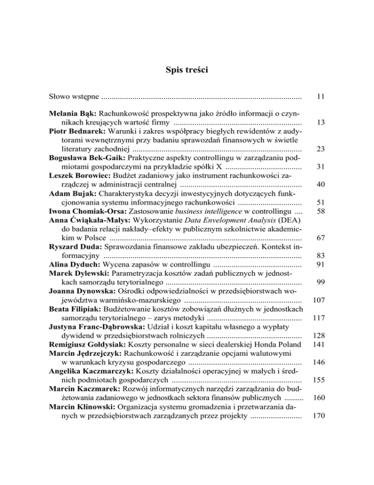 Spis treści Słowo wstępne ................................................................................................. Melania Bąk: Rachunkowość prospektywna jako źródło informacji o czynnikach kreujących wartość firmy .............................................................. Piotr Bednarek: Warunki i zakres współpracy biegłych rewidentów z audytorami wewnętrznymi przy badaniu sprawozdań finansowych w świetle literatury zachodniej .................................................................................. Bogusława Bek-Gaik: Praktyczne aspekty controllingu w zarządzaniu podmiotami gospodarczymi na przykładzie spółki X ..................................... Leszek Borowiec: Budżet zadaniowy jako instrument rachunkowości zarządczej w administracji centralnej ........................................................... Adam Bujak: Charakterystyka decyzji inwestycyjnych dotyczących funkcjonowania systemu informacyjnego rachunkowości ............................... Iwona Chomiak-Orsa: Zastosowanie business intelligence w controllingu .... Anna Ćwiąkała-Małys: Wykorzystanie Data Envelopment Analysis (DEA) do badania relacji nakłady–efekty w publicznym szkolnictwie akademickim w Polsce ............................................................................................. Ryszard Duda: Sprawozdania finansowe zakładu ubezpieczeń. Kontekst informacyjny ................................................................................................ Alina Dyduch: Wycena zapasów w controllingu ........................................... Marek Dylewski: Parametryzacja kosztów zadań publicznych w jednostkach samorządu terytorialnego .................................................................. Joanna Dynowska: Ośrodki odpowiedzialności w przedsiębiorstwach województwa warmińsko-mazurskiego ......................................................... Beata Filipiak: Budżetowanie kosztów zobowiązań dłużnych w jednostkach samorządu terytorialnego – zarys metodyki .............................................. Justyna Franc-Dąbrowska: Udział i koszt kapitału własnego a wypłaty dywidend w przedsiębiorstwach rolniczych .............................................. Remigiusz Gołdysiak: Koszty personalne w sieci dealerskiej Honda Poland Marcin Jędrzejczyk: Rachunkowość i zarządzanie opcjami walutowymi w warunkach kryzysu gospodarczego ....................................................... Angelika Kaczmarczyk: Koszty działalności operacyjnej w małych i średnich podmiotach gospodarczych ............................................................... Marcin Kaczmarek: Rozwój informatycznych narzędzi zarządzania do budżetowania zadaniowego w jednostkach sektora finansów publicznych .......... Marcin Klinowski: Organizacja systemu gromadzenia i przetwarzania danych w przedsiębiorstwach zarządzanych przez projekty ......................... 11 13 23 31 40 51 58 67 83 91 99 107 117 128 141 146 155 160 170 2 Spis treści Magdalena Kludacz: Płaszczyzny pomiaru i oceny dokonań szpitala w zrównoważonej karcie wyników ........................................................... Joanna Koczar, Bożena Rudnicka: Wynagrodzenie a struktura kosztów rodzajowych wybranych spółek w okresie dobrej i złej sytuacji gospodarczej ....................................................................................................... Joanna Kogut: Ocena prawidłowości dokonywania wyceny usług medycznych w SP ZOZ ......................................................................................... Tomasz Kondraszuk: Specyficzne aspekty rachunku kosztów i wyników w rolnictwie ............................................................................................... Ewa Kornalewicz: Ryzyko niewykrycia a możliwość optymalizacji wielkości próby podczas badania sprawozdań finansowych – na przykładzie testów kontroli wewnętrznej ........................................................................ Robert Kowalak: Benchmarking w rachunku kosztów cyklu życia produktu ... Mirosław Kowalczyk: Problemy przedsiębiorstwa a podejście Lean Six Sigma ......................................................................................................... Marcin Kowalewski: Performance Prism jako innowacyjny system pomiaru wyników organizacji ................................................................................. Katarzyna Kowalska: Zmiany wybranych problemów w podatku VAT ..... Mieczysław Kowerski: Wpływ czynników makroekonomicznych na decyzje dywidendowe spółek notowanych na giełdzie papierów wartościowych w Warszawie .................................................................................... Wojciech Dawid Krzeszowski: Transakcje zabezpieczające z użyciem instrumentów pochodnych a ryzyko z nimi związane .................................. Alma Laber-Tomaszewska: Ewidencja analityczna kosztów a potrzeby zarządzania przedsiębiorstwem .................................................................... Tomasz Lis: Dylematy wyceny i prezentacji kosztów i przychodów przy realizacji kontraktów budowlanych .............................................................. Monika Łada: Rachunkowość otwartych ksiąg – koncepcja i zastosowania Marek Masztalerz: Wartość dla klienta w strategicznej rachunkowości zarządczej ..................................................................................................... Aleksandra Martynowicz: Podatek od towarów i usług jako koszt uzyskania przychodów ......................................................................................... Łukasz Merta, Andrzej Piosik: Związek między rentownością i płynnością finansową na przykładzie spółek branży chemicznej ................................ Maria Nieplowicz: Procedura outsourcingu w zakładach opieki zdrowotnej Edward Nowak: Identyfikacja kosztów klienta .....