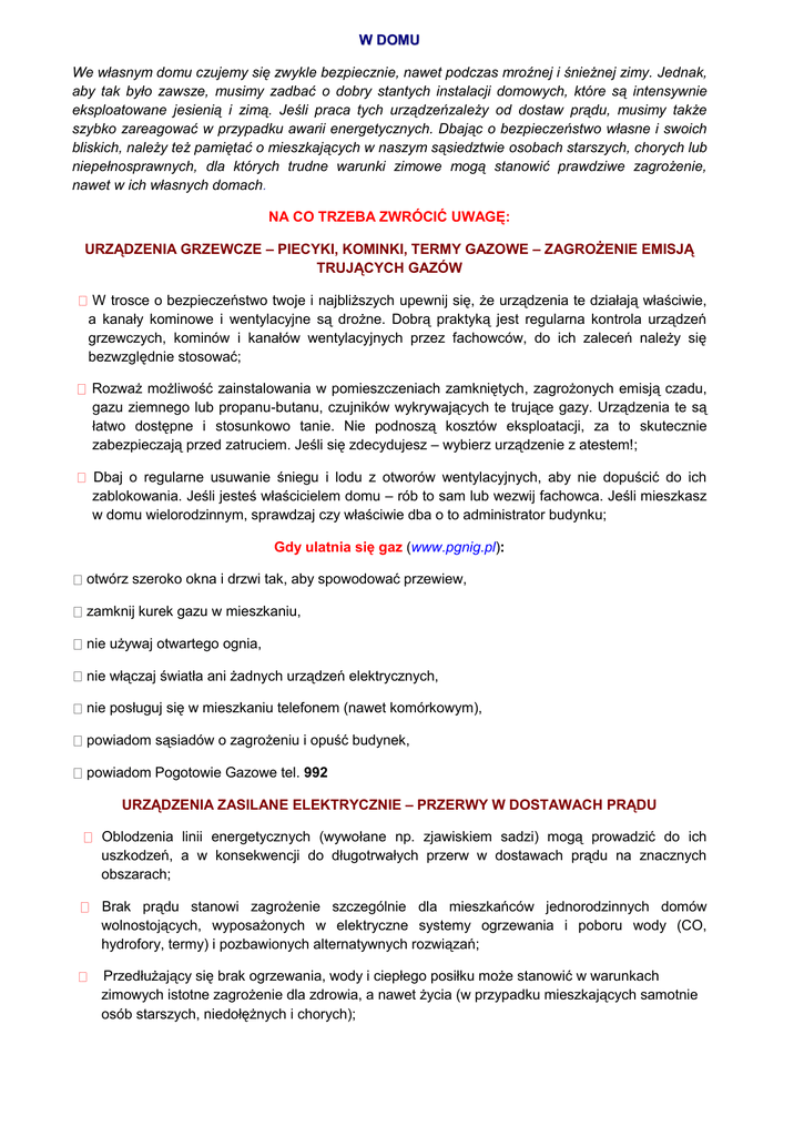 W DOMU We własnym domu czujemy się zwykle bezpiecznie, nawet podczas mroźnej i śnieżnej zimy. Jednak, aby tak było zawsze, musimy zadbać o dobry stantych instalacji domowych, które są intensywnie eksploatowane jesienią i zimą. Jeśli praca tych urządzeńzależy od dostaw prądu, musimy także szybko zareagować w przypadku awarii energetycznych. Dbając o bezpieczeństwo własne i swoich bliskich, należy też pamiętać o mieszkających w naszym sąsiedztwie osobach starszych, chorych lub niepełnosprawnych, dla których trudne warunki zimowe mogą stanowić prawdziwe zagrożenie, nawet w ich własnych domach. NA CO TRZEBA ZWRÓCIĆ UWAGĘ: URZĄDZENIA GRZEWCZE – PIECYKI, KOMINKI, TERMY GAZOWE – ZAGROŻENIE EMISJĄ TRUJĄCYCH GAZÓW W trosce o bezpieczeństwo twoje i najbliższych upewnij się, że urządzenia te działają właściwie, a kanały kominowe i wentylacyjne są drożne. Dobrą praktyką jest regularna kontrola urządzeń grzewczych, kominów i kanałów wentylacyjnych przez fachowców, do ich zaleceń należy się bezwzględnie stosować; Rozważ możliwość zainstalowania w pomieszczeniach zamkniętych, zagrożonych emisją czadu, gazu ziemnego lub propanu-butanu, czujników wykrywających te trujące gazy. Urządzenia te są łatwo dostępne i stosunkowo tanie. Nie podnoszą kosztów eksploatacji, za to skutecznie zabezpieczają przed zatruciem. Jeśli się zdecydujesz – wybierz urządzenie z atestem!; Dbaj o regularne usuwanie śniegu i lodu z otworów wentylacyjnych, aby nie dopuścić do ich zablokowania. Jeśli jesteś właścicielem domu – rób to sam lub wezwij fachowca. Jeśli mieszkasz w domu wielorodzinnym, sprawdzaj czy właściwie dba o to administrator budynku; Gdy ulatnia się gaz (www.pgnig.pl): otwórz szeroko okna i drzwi tak, aby spowodować przewiew, zamknij kurek gazu w mieszkaniu, nie używaj otwartego ognia, nie włączaj światła ani żadnych urządzeń elektrycznych, nie posługuj się w mieszkaniu telefonem (nawet komórkowym), powiadom sąsiadów o zagrożeniu i opuść budynek, powiadom Pogotowie Gazowe tel. 992 URZĄDZENIA ZASILANE ELEKTRYCZNIE – PRZERWY W DOSTAWACH PRĄDU Oblodzenia linii energetycznych (wywołane np. zjawiskiem sadzi) mogą prowadzić do ich uszkodzeń, a w konsekwencji do długotrwałych przerw w dostawach prądu na znacznych obszarach; Brak prądu stanowi zagrożenie szczególnie dla mieszkańców jednorodzinnych domów wolnostojących, wyposażonych w elektryczne systemy ogrzewania i poboru wody (CO, hydrofory, termy) i pozbawionych alternatywnych rozwiązań; Przedłużający się brak ogrzewania, wody i ciepłego posiłku może stanowić w warunkach zimowych istotne zagrożenie dla zdrowia, a nawet życia (w przypadku mieszkających samotnie osób starszych, niedołężnych i chorych); PAMIĘTAJ w przypadku zagrożenia związanego z eksploatacją urządzeń i instalacji gazowych, należy natychmiast zaalarmować Pogotowie Gazowe dzwoniąc pod bezpłatny numer telefonu 992. Pogotowie Gazowe prowadzi całodobowy dyżur i jest przygotowane do natychmiastowej interwencji w przypadku ulatniania się gazu. Jak pomóc przy zatruciu tlenkiem węgla (czadem)? należy natychmiast zapewnić dopływ świeżego powietrza do pomieszczenia - otworzyć okna, a w przypadkach skrajnych zagrożeń wybić szyby; wezwać służby ratownicze (Pogotowie Ratunkowe - 999, Straż Pożarna - 998 lub numer ratunkowy - 112); jeśli jest osoba poszkodowana, w miarę możliwości przenieść ją w niezagrożone czadem miejsce lub zaalarmować ratowników, że poszkodowany wymaga natychmiastowej pomocy; jeśli osoba poszkodowana nie oddycha, należy bez zwłoki podjąć próbę reanimacji i zastosować sztuczne oddychanie (metoda usta – usta i masaż serca: ułożyć poszkodowanego na twardym podłożu, odchylić jego głowę do tyłu, zacisnąć mu nos, wykonywać sztuczne oddychanie w rytmie 2 wdechy na 30 ucisków klatki piersiowej oburącz (http://www.doctormed.pl/wydzial/325/artykul/362/Sztuczne%20oddychanie%20usta-usta ); OSOBY STARSZE, NIESPRAWNE, CHORE – SAMOTNE NAWET WE WŁASNYM DOMU MOGĄ BYĆ ZAGROŻONE Mróz, oblodzenie, intensywne opady śniegu i gruba pokrywa śnieżna zalegająca na ulicach i drogach – warunki zimowe znacznie ograniczają możliwości samodzielnego poruszania się osób starszych, niesprawnych ruchowo lub chorych. W skrajnych przypadkach osoby takie mogą być poważnie zagrożone – samotne w wychłodzonych mieszkaniach, pozbawione posiłku i kontaktu ze światem zewnętrznym. W takich sytuacjach dom nie zapewnia bezpieczeństwa, może stać się pułapką. Nie bądź obojętny. Jeśli wiesz, że w twoim sąsiedztwie mieszka ktoś, kto może potrzebować pomocy nie wahaj się – wstąp, sprawdź w jakich żyje warunkach, zapytaj czego potrzeba, spróbuj nawiązać kontakt z krewnymi, nawet jeśli mieszkają daleko. Nie zniechęcaj się, jeśli twoja oferta pomocy nie znajdzie zrozumienia, osoby starsze i chore bywają nieufne. Spróbuj pomóc mimo wszystko, a jeśli okaże się to niemożliwe… PAMIĘTAJ W przypadku braku dostaw prądu, jeżeli nie masz innych możliwości ogrzania pomieszczeń mieszkalnych (np. pieca węglowego, kominka) – nie czekaj. Spróbuj ustalić przyczynę awarii i ocenić jej skalę. Jeśli nie jesteś specjalistą, nie podejmuj samodzielnych napraw - wezwij pomoc. Numer tel. Pogotowia Energetycznego 991. Numery kontaktowe do swojego zakładu energetycznego znajdziesz na każdej fakturze lub na formularzu umowy na dostawy prądu. W przypadku większych awarii energetycznych dobrą praktyką jest współdziałanie w ramach społeczności lokalnej – wzywając pomoc wspólnie z sąsiadami możesz szybciej ją otrzymać. O trudnej sytuacji mieszkających samotnie osób starszych, chorych lub niepełnosprawnych powiadom Urząd Gminy i Ośrodek Pomocy Społecznej. O ile masz taką możliwość - sam spiesz z sąsiedzką pomocą. PAMIĘTAJ – o samotnej osobie w tr