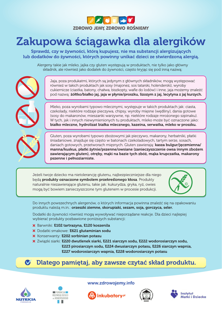 Zakupowa ściągawka dla alergików Sprawdź, czy w żywności, którą kupujesz, nie ma substancji alergizujących lub dodatków do żywności, których powinny unikać dzieci ze stwierdzoną alergią. Alergeny takie jak mleko, jajka czy gluten występują w produktach, nie tylko jako główny składnik, ale również jako dodatek do żywności, często kryjąc się pod inną nazwą: Jaja, poza produkatmi, których są jedynym z głównych składników, mogą występować również w takich produktach jak sosy (majonez, sos tatarski, holenderski), wyroby cukiernicze (ciastka, batony, chałwa, biszkopty, wafle do lodów) i inne, jaja możemy znaleźć pod nazwą: żółtko/białko jaj, jaja w płynie/proszku, lizozym z jaj, lecytyna z jaj kurzych. Mleko, poza wyrobami typowo mlecznymi, występuje w takich produktach jak: ciasta, czekolady, niektóre rodzaje pieczywa, chipsy, wyroby mięsne (wędliny), dania gotowe (sosy do makaronów, mieszanki warzywne, np. niektóre rodzaje mrożonego szpinaku). W tych, jak i innych niewymienionych tu produktach, mleko może być oznaczone jako: białko mleczne, hydrolizat białka mlecznego, kazeina, serwatka, mleko w proszku. Gluten, poza wyrobami typowo zbożowymi jak pieczywo, makarony, herbatniki, płatki śniadaniowe, znajduje się często w batonach czekoladowych, tartym serze, sosach, daniach gotowych, przetworach mięsnych. Gluten zawierają: kasza bulgur/jęczmienna/ manna/kuskus, płatki żytnie/pszenne/owsiane (zanieczyszczenie owsa innym zbożem zawierającym gluten), otręby, mąki na bazie tych zbóż, mąka krupczatka, makarony pszenne i pełnoziarniste. Jeżeli twoje dziecko ma nietolerancję glutenu, najbezpieczniejsze dla niego będą produkty oznaczone symbolem przekreślonego kłosa. Produkty naturalnie niezawierające glutenu, takie jak: kukurydza, gryka, ryż, owies mogą być bowiem zanieczyszczone tym glutenem w procesie produkcji. Do innych powszechnych alergenów, o których informacja powinna znaleźć się na opakowaniu produktu należą m.in.: orzeszki ziemne, skorupiaki, sezam, soja, gorczyca, seler. Dodatki do żywności również mogą wywoływać nieporządane reakcje. Dla dzieci najlepiej wybierać produkty pozbawione poniższych substancji: Barwniki: E102 tartrazyna, E120 koszenila Dodatki smakowe: E621 glutaminian sodu Konserwanty: E202 sorbinian potasu Związki siarki: E 220 dwutlenek siarki, E221 siarczyn sodu, E222 wodorosiarczyn sodu, E223 pirosiarczyn sodu, E224 dwusiarczyn potasu, E226 siarczyn wapnia, E227 wodorosiarczyn wapnia, E228 wodorosiarczyn potasu Dlatego pamiętaj, aby zawsze czytać skład produktu. www.zdrowojemy.info