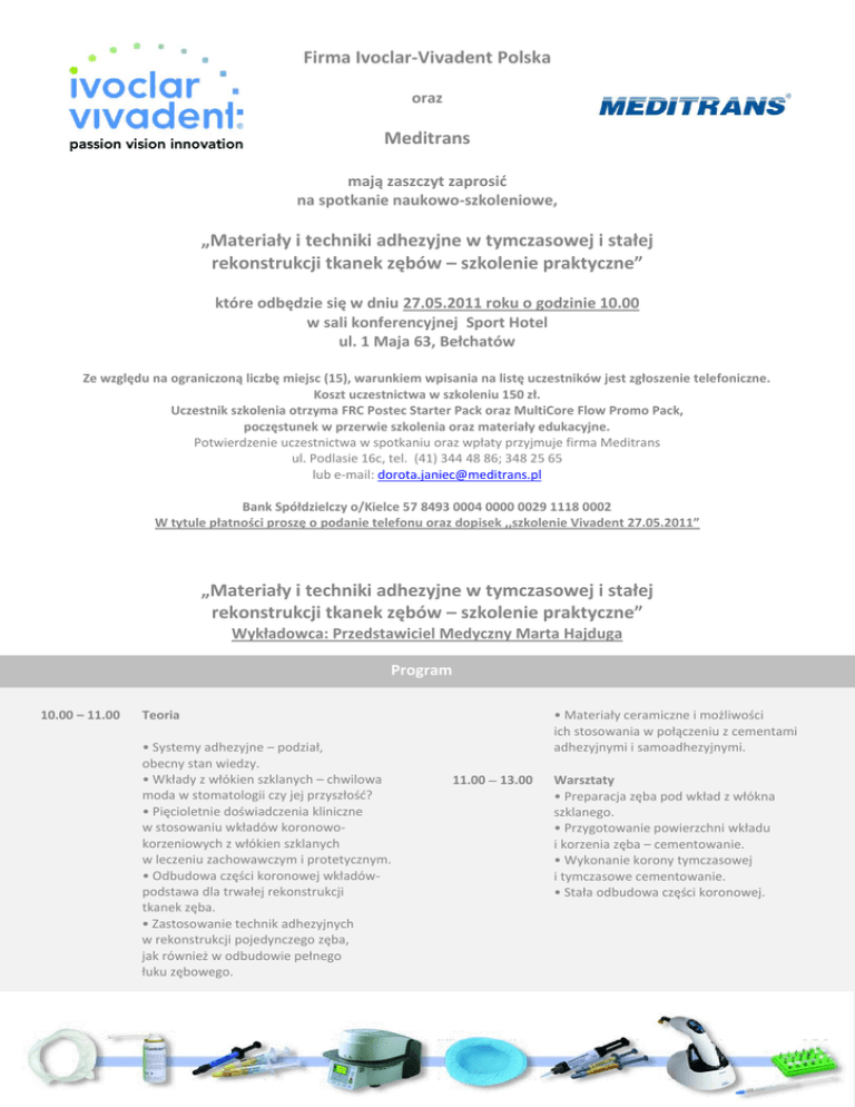 Firma Ivoclar-Vivadent Polska oraz Meditrans mają zaszczyt zaprosid na spotkanie naukowo-szkoleniowe, „Materiały i techniki adhezyjne w tymczasowej i stałej rekonstrukcji tkanek zębów – szkolenie praktyczne” które odbędzie się w dniu 27.05.2011 roku o godzinie 10.00 w sali konferencyjnej Sport Hotel ul. 1 Maja 63, Bełchatów Ze względu na ograniczoną liczbę miejsc (15), warunkiem wpisania na listę uczestników jest zgłoszenie telefoniczne. Koszt uczestnictwa w szkoleniu 150 zł. Uczestnik szkolenia otrzyma FRC Postec Starter Pack oraz MultiCore Flow Promo Pack, poczęstunek w przerwie szkolenia oraz materiały edukacyjne. Potwierdzenie uczestnictwa w spotkaniu oraz wpłaty przyjmuje firma Meditrans ul. Podlasie 16c, tel. (41) 344 48 86; 348 25 65 lub e-mail: [email protected] Bank Spółdzielczy o/Kielce 57 8493 0004 0000 0029 1118 0002 W tytule płatności proszę o podanie telefonu oraz dopisek ,,szkolenie Vivadent 27.05.2011” „Materiały i techniki adhezyjne w tymczasowej i stałej rekonstrukcji tkanek zębów – szkolenie praktyczne” Wykładowca: Przedstawiciel Medyczny Marta Hajduga Program 10.00 – 11.00 Teoria • Systemy adhezyjne – podział, obecny stan wiedzy. • Wkłady z włókien szklanych – chwilowa moda w stomatologii czy jej przyszłośd? • Pięcioletnie doświadczenia kliniczne w stosowaniu wkładów koronowokorzeniowych z włókien szklanych w leczeniu zachowawczym i protetycznym. • Odbudowa części koronowej wkładówpodstawa dla trwałej rekonstrukcji tkanek zęba. • Zastosowanie technik adhezyjnych w rekonstrukcji pojedynczego zęba, jak również w odbudowie pełnego łuku zębowego. • Materiały ceramiczne i możliwości ich stosowania w połączeniu z cementami adhezyjnymi i samoadhezyjnymi. 11.00 13.00 Warsztaty • Preparacja zęba pod wkład z włókna szklanego. • Przygotowanie powierzchni wkładu i korzenia zęba – cementowanie. • Wykonanie korony tymczasowej i tymczasowe cementowanie. • Stała odbudowa części koronowej.