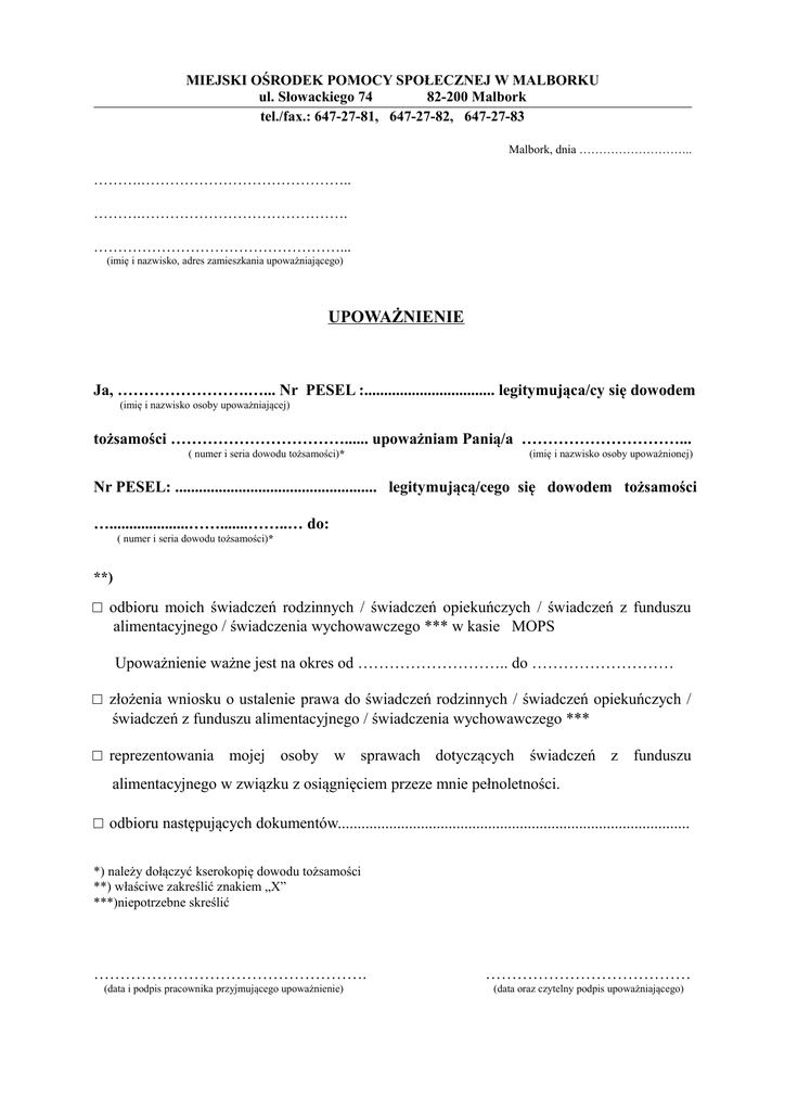 MIEJSKI OŚRODEK POMOCY SPOŁECZNEJ W MALBORKU ul. Słowackiego 74 82-200 Malbork tel./fax.: 647-27-81, 647-27-82, 647-27-83 Malbork, dnia ……………………….. ……….…………………………………….. ……….……………………………………. ……………………………………………... (imię i nazwisko, adres zamieszkania upoważniającego) UPOWAŻNIENIE Ja, …………………….…... Nr PESEL :................................. legitymująca/cy się dowodem (imię i nazwisko osoby upoważniającej) tożsamości ……………………………...... upoważniam Panią/a …………………………... ( numer i seria dowodu tożsamości)* (imię i nazwisko osoby upoważnionej) Nr PESEL: ................................................... legitymującą/cego się dowodem tożsamości …....................…….......……..… do: ( numer i seria dowodu tożsamości)* **) □ odbioru moich świadczeń rodzinnych / świadczeń opiekuńczych / świadczeń z funduszu alimentacyjnego / świadczenia wychowawczego *** w kasie MOPS Upoważnienie ważne jest na okres od ……………………….. do ……………………… □ złożenia wniosku o ustalenie prawa do świadczeń rodzinnych / świadczeń opiekuńczych / świadczeń z funduszu alimentacyjnego / świadczenia wychowawczego *** □ reprezentowania mojej osoby w sprawach dotyczących świadczeń z funduszu alimentacyjnego w związku z osiągnięciem przeze mnie pełnoletności. □ odbioru następujących dokumentów......................................................................................... *) należy dołączyć kserokopię dowodu tożsamości **) właściwe zakreślić znakiem „X” ***)niepotrzebne skreślić ……………………………………………. (data i podpis pracownika przyjmującego upoważnienie) ………………………………… (data oraz czytelny podpis upoważniającego)