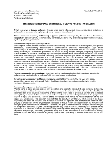 mgr inż. Monika Kukowska Katedra Chemii Organicznej Wydział Chemiczny Politechnika Gdańska Gdańsk, 27.03.2015 STRESZCZENIE ROZPRAWY DOKTORSKIEJ W JĘZYKU POLSKIM I ANGIELSKIM Tytuł rozprawy w języku polskim: Synteza oraz ocena właściwości oligopeptydów jako związków o potencjalnym zastosowaniu w pielęgnacji skóry i leczeniu jej uszkodzeń Słowa kluczowe rozprawy doktorskiej w języku polskim: Tripeptyd Gly-His-Lys, kwasy tłuszczowe, lipopeptydy, czynnik wzrostu komórek skóry, fibroblasty, keratynocyty, aktywność przeciwdrobnoustrojowa, synteza peptydów, przenikanie Streszczenie rozprawy w języku polskim: Dostrzegalne oznaki procesu starzenia obecnie uznawane są za problem natury kosmetycznej, ale i proces chorobowy, uwarunkowany zaburzeniem i spowolnieniem procesów naprawczych. Ogół zmian zachodzących w skórze prowadzi do przebudowy jej struktury, osłabienia włókien budulcowych, utraty funkcji ochronnych i wzmożonej podatności na urazy. W pracy podjęto tematykę, dotyczącą regeneracji tkanek miękkich w aspekcie postępującego w czasie procesu starzenia. Rozważono możliwości stosowania substancji, naśladujących naturalne mediatory procesów naprawczych skóry. W kręgu zainteresowań znalazł się Gly-His-Lys, występujący w ECM, głównie α-II łańcuchu kolagenu. Jako czynnik wzrostu i różnicowania komórek odgrywa on kluczową rolę w fizjologicznym procesie naprawy i regeneracji tkanek poprzez stymulację fibroblastów do syntezy kolagenu. Celem badań było połączenie analogów Gly-His-Lys z kwasami tłuszczowymi (C12-C18). W pracy przedstawiono syntezę 34 związków, zawierających fragment A-Gly-X-Y(B)-R (X=Hyp, Gly-Hyp, Met, Hyp-Met, Y=Lys/D-Lys, A,B - grupa acetylowa/kwas tłuszczowy) oraz ocenę in vitro przenikalności, aktywności przeciwdrobnoustrojowej, zdolności proliferacyjnych i migracyjnych, a także cytotoksyczności wybranych pochodnych wobec komórek skóry. Tytuł rozprawy w języku angielskim: Synthesis and properties evaluation of oligopeptides as potential and promising candidates for a various of skin care and wound applications Słowa kluczowe rozprawy doktorskiej w języku angielskim: Tripeptide Gly-His-Lys, fatty acids, lipopeptides, natural skin cells growth factor, fibroblasts, keratinocytes, antimicrobial activity, peptide synthesis, skin penetration Streszczenie rozprawy w języku angielskim: Visible signs of aging process are not only a problem of a cosmetic nature, but also morbidity dictated by the dysfunction and the slowdown in repairing processes. All the alterations in the skin over time lead to the reconstruction of its structure, weakening of the building fibers, loss of protective function and increased susceptibility to injury. In this work, a topic of the soft tissue repair and regeneration in the progressive aspect of aging was discussed. The use of the substances which mimic the natural mediators of the skin repair was undertaken. The research demonstrates the activity of Gly-His-Lys, which exists in the ECM, especially α-II-chain of collagen. The molecule is known as a growth and differentiation factor of cells, playing a crucial role in the physiological processes of tissue repair and regeneration by stimulation of collagen production in human fibroblasts. Therefore, the goal of PhD research is to exploit the advantages of compounds combining Gly-His-Lys analogues with fatty acids (C12-C18). Present paper consists of the synthesis of a series of 34 compounds comprising the fragment of A-Gly-X-Y(B)-R (X=Hyp, Gly-Hyp, Met, Hyp-Met, Y=Lys/D-Lys, A,B-acetyl group/fatty acid) and in vitro evaluation of their antimicrobial activity, permeability as well as proliferative, migratory capacity and cytotoxicity of selected derivatives to the skin cells.