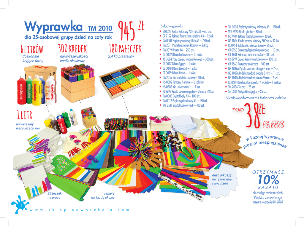 Wyprawka TM 2010 dla 25-osobowej grupy dzieci na cały rok 6 litrów doskonale kryj¹ce farby 300 kredek najwy¿szej jakoœci kredki o³ówkowe 945 zł 180 pałeczek 2,4 kg plasteliny 1 litr Skład wyprawki: • • • • • • • • • • • • • • • • • GI 0028 Karton kolorowy A3 (15 kol.) – 60 ark. CR 7152 Tektura falista złota i srebrna A3 – 12 ark. TM 0001 Papier rysunkowy biały A4 – 750 ark. TM 2011 Plastelina zestaw klasowy – 2,4 kg TM 3019 Brystol A4 – 250 ark. DZ 0002 Bibuła karbowana – 10 rolek KD 3604 Pasy papieru wycinankowego – 300 szt. DZ 0077 Bibuła Tygrys – 1 rolka DZ 0078 Bibuła Leopard – 1 rolka DZ 0079 Bibuła Krowa – 1 rolka TM 2016 Tektura falista beżowa – 50 ark. NS 0802 Tempery 1-litrowe – 6 kolorów NS 0808 Klej uniwersalny 1l. – 1 szt. RL 3698 Kredki świecowe grube – 25 op. x 12 kol. TM 0008 Brystol biały A3 – 100 ark. TM 0012 Papier wycinankowy A4 – 130 ark. WY 2511 Brystol kolorowy A4 – 100 szt. • • • • • • • • • • • • • • • TM 0003 Papier rysunkowy kolorowy A3 – 150 ark. WY 2522 Bibuła gładka – 30 ark. FO 7404 Tektura falista kolorowa – 10 ark. NS 1064 Kredki zestaw klasowy 300szt. w 12 kol RL 0754 Buteleczki z dozownikiem – 25 szt. CR 0150 Samoprzylepna folia piankowa – 10 ark. CR 4601 Kolorowe ruchome oczka – 100 szt. CR 8797 Druciki kreatywne kolorowe – 100 szt. CR 9560 Pompony zwierzęce – 100 szt. NS 1036A Pędzle standard okrągłe 4 mm – 7 szt. NS 1037A Pędzle standard okrągłe 8 mm – 11 szt. NS 1041A Pędzle standard płaskie 9 mm – 7 szt. KE 8601 Dziurkacz kombinerki i 4 wkłady – 1 zestaw TM 2036 Teczka – 25 szt. SN 0505 Nożyczki tradycyjne – 25 szt. Całość zapakowana w 2 kartonowe pudełka uniwersalny niebrudz¹cy klej TYLKO 38 zł NA JEDNO DZIECKO ¿dej wyprawce w ka ent niespodzianka prez du¿o arkuszy do rysowania i wycinania 25 teczek na prace papiery na ka¿d¹ okazjê 1 w w w . s k l e p . n o w a s z k o l a . c o m OTRZYMASZ 10% RABATU dla każdego produktu z działu Plastyka zamówionego razem z wyprawką TM 2010 Wyprawka dla 5-osobowej grupy dzieci na cały rok TM 2010A Skład wyprawki: • • • • • • • • • • • TM 2041 Papier kolorowy rysunkowy A3 – 50 ark.; TM 0001 Papier rysunkowy biały A4 – 250 ark.; GI 0028 Karton kolorowy A3 – 15 ark.; GI 0029 Karton kolorowy dwustronnie – 20 ark.; RL 3698 Kredki świecowe (12 kol.) – 5 op.; TM 2015 Plastelina (6kol.) – 5 op.; SN 0505 Nożyczki tradycyjne – 5 szt.; WY 2514 Krepina karbowana – 18 rolek; FO 2410 Klej w sztyfcie – 5 szt.; NS 0800 Tempery 0,5-litrowe – 6 kolorów; NS 1037A Pędzle standard okrągłe 8 mm – 5 szt. 189 zł Wyprawka indy widualna • • • • • • • • • • TM 2057 Teczka A4 z rączką – 1 szt.; NS 1057 Kredki długie cienkie trójkątne 12 szt. – 1 op.; RL 3698 Kredki świecowe 12 szt. – grube – 1 op.; TM 2015 Plastelina 6 kolorów – 1 op.; TM 2018 Blok rysunkowy A4 – 1 szt.; TM 2021 Zeszyt papierów kolorowych A4 – 1 szt.; TM 2025 Blok kartonów kolorowych A4 – 1 op.; RL 0431 Akwarele – 1 op.; SN 0001A Nożyczki szkolne – 1 szt.; FO 2410 Klej w sztyfcie – 1 szt. TM 2039 39 zł OTRZYMASZ 10% RABATU dla każdego produktu z działu Plastyka zamówionego razem z wyprawką TM 2010 2 w w w . s k l e p . n o w a s z k o l a . c o m