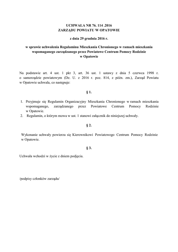 UCHWAŁA NR 76. 114 .2016 ZARZĄDU POWIATU W OPATOWIE z dnia 29 grudnia 2016 r. w sprawie uchwalenia Regulaminu Mieszkania Chronionego w ramach mieszkania wspomaganego zarządzanego przez Powiatowe Centrum Pomocy Rodzinie w Opatowie Na podstawie art. 4 ust. 1 pkt 3, art. 36 ust. 1 ustawy z dnia 5 czerwca 1998 r. o samorządzie powiatowym (Dz. U. z 2016 r. poz. 814, z późn. zm.), Zarząd Powiatu w Opatowie uchwala, co następuje: § 1. 1. Przyjmuje się Regulamin Organizacyjny Mieszkania Chronionego w ramach mieszkania wspomaganego, zarządzanego przez Powiatowe Centrum Pomocy Rodzinie w Opatowie. 2. Regulamin, o którym mowa w ust. 1 stanowi załącznik do niniejszej uchwały. § 2. Wykonanie uchwały powierza się Kierownikowi Powiatowego Centrum Pomocy Rodzinie w Opatowie. § 3. Uchwała wchodzi w życie z dniem podjęcia. /podpisy członków zarządu/ Załącznik Nr 1 do uchwały Nr 76. 114 .2016 Zarządu Powiatu w Opatowie z dnia 29 grudnia 2016 r. Regulamin Mieszkania Chronionego w ramach mieszkania wspomaganego zarządzanego przez Powiatowe Centrum Pomocy Rodzinie w Opatowie §1 Regulamin Organizacyjny Mieszkania Chronionego w ramach mieszkania wspomaganego, zwany dalej "regulaminem" określa zadania i organizację Mieszkania Chronionego, a także specyfikę i zakres funkcjonowania oraz warunki kierowania i pobytu w Mieszkaniu Chronionym. §2 Przez sformułowania określone w regulaminie, określone poniżej, należy rozumieć: 1) Mieszkanie – Mieszkanie Chronione w ramach mieszkania wspomaganego; 2) PCPR – Powiatowe Centrum Pomocy Rodzinie w Opatowie; 3) mieszkaniec – osoba korzystająca z pobytu w mieszkaniu chronionym. §3 Mieszkanie funkcjonuje w oparciu o przepisy: 1. Ustawy z dnia 12 marca 2004 roku o pomocy społecznej (Dz. U. z 2016 r. poz. 9 3 0 , z późn. zm.). 2. Rozporządzenia Ministra Pracy i Polityki Społecznej z dnia 14 marca 2014 r. w sprawie mieszkań chronionych (Dz. U. 2012 r. poz. 305). §4 1. Mieszkanie znajduje się w Opatowie przy ul. Juliusza Słowackiego 56, 27-500 Opatów. 2. Mieszkanie jest prowadzone przez PCPR. 3. Pobyt w Mieszkaniu jest formą świadczenia niepieniężnego z pomocy społecznej. 4. Powierzchnia Mieszkania to 39,00 m2. W jego skład wchodzi 2 pokoje, aneks kuchenny, łazienka. 5. W Mieszkaniu mogą jednocześnie zamieszkać 3 osoby obu płci. §5 1. Do korzystania z pobytu w Mieszkaniu uprawnione są osoby z Powiatu Opatowskiego, które ukończyły 18 lat i potrzebują wsparcia w funkcjonowaniu w życiu codziennym, ale nie wymagają usług w zakresie świadczonym przez jednostkę całodobowej opieki, w szczególności osoby z zaburzeniami psychicznymi, osoby, które opuściły: placówkę opiekuńczo-wychowawczą, młodzieżowy ośrodek wychowawczy, rodzinę zastępczą i podlegają procesowi usamodzielnienia, osoby z interwencji kryzysowej, a ponadto spełniają poniższe warunki: - nie ukończyły 25 roku życia, - nie mają możliwości powrotu do domu rodzinnego, - znajdują się w trudnej sytuacji mieszkaniowej i dochodowej, - wymagają wsparcia i pomocy w podjęciu samodzielnego życia, - uzyskały pozytywną opinię PCPR, - zawarły stosowną umowę z PCPR. 2. Osoby z interwencji kryzysowej są przyjmowane do Mieszkania bez względu na wiek. 3. W mieszkaniu mogą zamieszkiwać z osobami o których mowa w ust. 1 i ust. 2 ich małoletnie dzieci. §6 1. Celem pomocy w formie Mieszkania jest zabezpieczenie okresowego schronienia osobom, o których mowa w § 5. 2. Mieszkanie pełni funkcję mieszkania usamodzielnienia. 3. Mieszkanie zapewnia mieszkańcom odpowiednie warunki pobytu, warunki do samodzielnego prowadzenia gospodarstwa domowego, a także zapewnia poczucie bezpieczeństwa. 4. Mieszkanie rozwija umiejętności interpersonalne i współżycia społecznego. 5. Mieszkanie pozwala nabywać umiejętności załatwiania spraw urzędowych. 6. Pobyt w Mieszkaniu kształtuje właściwy stosunek do obowiązków, stwarza możliwość rozwijania umiejętności właściwego planowania i wykorzystania czasu nauki, pracy i czasu wolnego, rozwijania własnych zainteresowań. 7. Mieszkanie stwarza możliwości samodzielnego przezwyciężania trudności życiowych, emocjonalnych, rodzinnych, społecznych przy wsparciu osób wspomagających mieszkańca. § 7 1. Okres pobytu w Mieszkaniu jest ustalany na czas określony. 2. Okres pobytu osoby usamodzielnianej w mieszkaniu chronionym nie powinien przekraczać 2 lat. W szczególnie uzasadnionych przypadkach może zostać przedłużony o kolejny rok. 3. Osoby z interwencji kryzysowej mogą przebywać w mieszkaniu chronionym w uzasadnionych przypadkach przez okres do trzech miesięcy. 4. Pobyt w Mieszkaniu jest odpłatny. 5. Kandydatów na mieszkańców mieszkania chronionego kwalifikuje Kierownik PCPR, lub opiekun mieszkania za zgodą kierownika 6. Podstawą umieszczenia w mieszkaniu chronionym jest umowa zawarta między mieszkańcem a Kierownikiem PCPR. Wzór umowy stanowi załącznik Nr 1 do niniejszego regulaminu. §8 Mieszkaniec ma obowiązek: a) ponoszenia kosztów pobytu w mieszkaniu, zgodnie z umową, b) przestrzegania zasad współżycia społecznego, poszanowania godności innych osób, poszanowania cudzej własności, respektowania praw innych mieszkańców do realizacji ich potrzeb i zainteresowań, c) przestrzegania całkowitego zakazu wnoszenia i spożywania alkoholu i środków odurzających na terenie Mieszkania, d) poszanowania wyposażenia Mieszkania i ponoszenia kosztów zawinionych przez siebie uszkodzeń, e) utrzymania w czystości pomieszczeń Mieszkania, f) dbałość o higienę osobistą, wygląd zewnętrzny oraz porządek we własnych rzeczach i wokół siebie, g) respektowania zaleceń Kierownika PCPR i opiekuna Mieszkania, h) informowania Kierownika PCPR lub opiekuna Mieszkania o ewentualnych trudnościach, problemach, nieporozumieniach wynikających w trakcie wspólnego zamieszkiwania w Mieszkaniu chronionym, i) przestrzegania całkowitego zakazu posiadania zwie