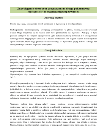 Zapobieganie chorobom przenoszonym drogą pokarmową: Pięć kroków do bezpieczniejszej żywności. Utrzymuj czystość Często myj ręce, szczególnie przed kontaktem z żywnością i przed posiłkiem. Niebezpieczne mikroorganizmy występują powszechnie w glebie, wodzie, na ciele zwierząt i ludzi. Mogą znajdować się na rękach oraz być przenoszone na żywność. Pamiętaj o tym podczas zakupów na targach spożywczych, gdy dotykasz surowej żywności, a w szczególności surowego mięsa. Myj ręce po kontakcie z takimi produktami. Na targach często można spotkać żywe zwierzęta, które mogą przenosić liczne choroby, w tym także grypę ptaków. Dlatego też unikaj bliskiego kontaktu z żywymi zwierzętami Gotuj dokładnie Upewnij się, że spożywana żywność została dokładnie ugotowana, i jest gorąca podczas podania. W szczególności unikaj surowych owoców morza, surowego mięsa mielonego/ burgerów, mięsa drobiowego, które wciąż jest czerwone lub którego soki z wnętrza są różowe, ponieważ mogą one zawierać szkodliwe bakterie. Niebezpieczne mikroorganizmy giną podczas odpowiedniego gotowania, które jest jedną z najskuteczniejszych metod zapewnienia bezpieczeństwa żywności. Najważniejsze, aby żywność była dokładnie ugotowana, tj. we wszystkich częściach osiągnęła 70° C. Używaj bezpiecznej wody i żywności. Lody, woda pitna, kostki lodu oraz surowe mleko mogą zostać z łatwością zanieczyszczone groźnymi mikroorganizmami lub substancjami chemicznymi, jeśli składniki, z których zostały wyprodukowane nie są odpowiednie. Unikaj ich w przypadku podejrzenia, że są one wątpliwej jakości. Wszystkie owoce i warzywa, spożywane na surowo, obieraj ze skórki. Z tego względu, że w spleśniałej lub uszkodzonej żywności mogą powstać substancje toksyczne, unikaj owoców i warzyw z uszkodzoną skórką. Warzywa zielone (np. zielone sałaty) mogą zawierać groźne mikroorganizmy. Unikaj spożywania warzyw co do których istnieje wątpliwość w zakresie warunków higienicznych ich przechowywania. Jeśli to możliwe wybieraj wodę butelkowaną. Jest ona bezpieczniejsza. Należy jednak sprawdzić, czy butelka nie była wcześniej otwierana lub naruszona. Jeśli masz wątpliwości co do czystości wody pitnej - zagotuj ją, doprowadzając do wrzenia. Zabije to wszelkie obecne w niej niebezpieczne mikroorganizmy. Jeśli gotowanie nie jest możliwe, weź pod uwagę zastosowanie filtra z mikroporami lub środka dezynfekcyjnego, takiego jak tabletki z jodyną. Napoje, które są butelkowane lub opakowane w inny sposób są zazwyczaj bezpieczne do spożycia. Oddzielaj żywność surową od ugotowanej Gdy często jadasz produkty kupione od ulicznych sprzedawców lub w bufetach hotelowych i restauracjach, upewnij się, że żywność gotowana nie ma kontaktu z produktami surowymi. Unikaj jakiejkolwiek żywności, która nie jest ugotowana, za wyjątkiem owoców i warzyw, które mogą być obrane ze skórki lub łupiny. Dania zawierające surowe lub niedogotowane jajka, takie jak majonez domowy, niektóre sosy oraz wybrane desery (np. mus) mogą być szkodliwe dla twojego zdrowia. Surowe jedzenie może zawierać groźne mikroorganizmy, które mogą zostać przeniesione przez bezpośredni kontakt na żywność już ugotowaną i bezpieczną. Utrzymuj żywność w odpowiedniej temperaturze Ugotowane jedzenie trzymane przez kilka godzin w temperaturze pokojowej stanowi kolejne poważne zagrożenie, które zwiększa możliwość wystąpienia zakażeń pokarmowych. Unikaj takiej żywności w bufetach, na targach, w restauracjach oraz na stoiskach ulicznych, jeśli nie jest ona przechowywana w warunkach zapewniających jej odpowiednią temperaturę (tzn. na gorąco lub w lodówce/na lodzie). Mikroorganizmy mogą namnażać się bardzo szybko, jeśli żywność przechowywana jest w temperaturze pokojowej. Podczas przechowywania jedzenia w temperaturze poniżej 5°C (np. w lodówkach lub na lodzie) lub na gorąco (w temperaturze powyżej 60° C), wzrost mikroorganizmów jest zwolniony lub zatrzymany.