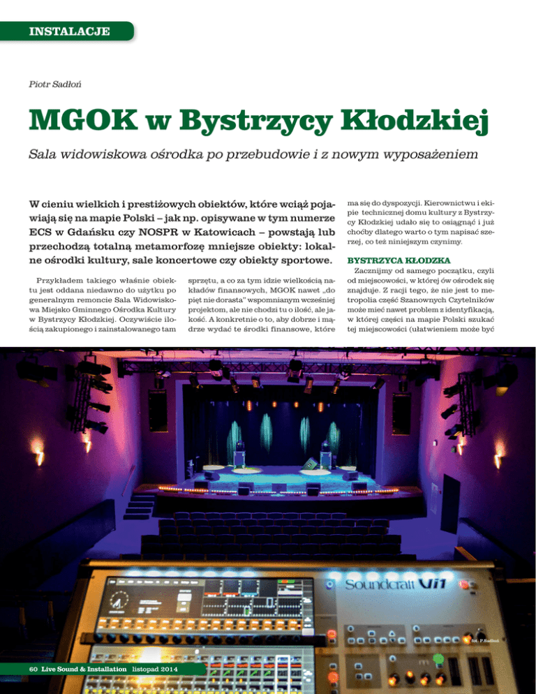 INSTALACJE Piotr Sadłoń MGOK w Bystrzycy Kłodzkiej Sala widowiskowa ośrodka po przebudowie i z nowym wyposażeniem W cieniu wielkich i prestiżowych obiektów, które wciąż pojawiają się na mapie Polski – jak np. opisywane w tym numerze ECS w Gdańsku czy NOSPR w Katowicach – powstają lub przechodzą totalną metamorfozę mniejsze obiekty: lokalne ośrodki kultury, sale koncertowe czy obiekty sportowe. Przykładem takiego właśnie obiektu jest oddana niedawno do użytku po generalnym remoncie Sala Widowiskowa Miejsko Gminnego Ośrodka Kultury w Bystrzycy Kłodzkiej. Oczywiście ilością zakupionego i zainstalowanego tam sprzętu, a co za tym idzie wielkością nakładów finansowych, MGOK nawet „do pięt nie dorasta” wspomnianym wcześniej projektom, ale nie chodzi tu o ilość, ale jakość. A konkretnie o to, aby dobrze i mądrze wydać te środki finansowe, które ma się do dyspozycji. Kierownictwu i ekipie technicznej domu kultury z Bystrzycy Kłodzkiej udało się to osiągnąć i już choćby dlatego warto o tym napisać szerzej, co też niniejszym czynimy. BYSTRZYCA KŁODZKA Zacznijmy od samego początku, czyli od miejscowości, w której ów ośrodek się znajduje. Z racji tego, że nie jest to metropolia część Szanownych Czytelników może mieć nawet problem z identyfikacją, w której części na mapie Polski szukać tej miejscowości (ułatwieniem może być fot. P.Sadłoń 60 Live Sound & Installation listopad 2014 drugi człon nazwy – „Kłodzka” – co sugerować może, całkiem słusznie, niedalekie sąsiedztwo miasta o tej właśnie nazwie). Bystrzyca Kłodzka to niewielkie, liczące obecnie niespełna 11 tysięcy mieszkańców miasto na południu Polski, w południowej części województwa dolnośląskiego, niedaleko granicy z Czechami. Historia miejscowości jest dość długa, bowiem swoimi początkami sięga XI wieku, kiedy istniała tu osada czeska, na miejscu lub obok której rycerz Havel (Gaweł) z Lemberka założył w XIII wieku miejscowość dla kolonistów niemieckich o nazwie Hawelswerde („Kępa Gawłowa”). W 1319 r. występuje ona już jako miasto. Po latach wojen i grabieży, przechodzenia z rąk do rąk, od 1945 roku Bystrzyca Kłodzka została włączona do Polski. Polską nazwę miasta oparto na przedlokacyjnej nazwie czeskiej, bowiem w okresie przynależności do Rzeszy Niemieckiej, a wcześniej Prus, miejscowość funkcjonowała pod niemiecką nazwą Habelschwerdt. fot. MGOK MIEJSKO GMINNY OŚRODEK KLUTURY Miejsko Gminny Ośrodek Kultury w Bystrzycy Kłodzkiej im. Leona Kruczkowskiego rozpoczął swoją działalność w 1975 roku. „Sercem” obiektu, w którym mieści się siedziba ośrodka, jest Sala Widowiskowa, do niedawna będąca salą dwufunkcyjną – kinowo-widowiskową. Przed remontem liczyła ona 278 miejsc i wyglądała – no cóż (spójrzcie sami na „historyczne” zdjęcie) – jak większość sal w lokalnych domach kultury z lat 70. ubiegłego wieku. O wyposażeniu technicznym też nie ma co się rozwodzić. Summa summarum przyszedł wreszcie czas na REMONT Początkowo planowano tylko kosmetyczne odświeżenie sali, bez żadnych „rewolucji”. Na szczęście udało się zdobyć wystarczające środki, aby nie skończyło się tylko na tym, z pożytkiem dla obecnego wyglądu i funkcjonalności obiektu (znów wystarczy spojrzeć na współczesne zdjęcia). Niemała, a w zasadzie napisać trzeba główna, w tym zasługa włodarza Gminy Bystrzyca Kłodzka – Pani Burmistrz Renaty Surmy, jak również Kierownika Wydziału Przedsiębiorczości tut. urzędu – Moniki Pyrcz-Jurczyk oraz ekipy ośrodka z panią Dyrektor Miejsko Gminnego Ośrodka Kultury, Grażyną fot. P.Sadłoń Sala Widowiskowa Miejsko Gminnego Ośrodka Kultury w Bystrzycy Kłodzkiej przeszła istotną metamorfozę. Wachowską-Szuba i Kierownikiem ds. technicznych, Rafałem Cymbalistą, na czele. To oni postanowili powalczyć o dofinansowanie projektu remontu ośrodka, a dokładnie dwa dofinansowania albo inaczej, z dwóch źródeł. Po pierwsze przygotowano i złożono w kwietniu 2013 roku wniosek o dofinansowanie unijne (z Europejskiego Funduszu Rozwoju Regionalnego w ramach Regionalnego Programu Operacyjnego dla Województwa Dolnośląskiego na lata 2007-2013, Priorytet nr 9 „Odnowa zdegradowanych obszarów miejskich na terenie Dolnego Śląska (Miasta)”, działanie nr 9.1 „Odnowa zdegradowanych obszarów miejskich w miastach powyżej 10 tysięcy mieszkańców”), który został zaakceptowany i w ten sposób przyznano dofinansowanie na projekt o nazwie „Przebudowa sali widowiskowej w Miejsko Gminnym Ośrodku Kultury w Bystrzycy Kłodzkiej oraz zakup niezbędnego wyposażenia sali” w kwocie 1.640.992,77 zł (wartość całego projektu wyniosła 2.103.421,53 zł brutto, z czego nieco ponad 900 tysięcy przeznaczono na zakup i dostawę wyposażenia sali). Kto choć trochę „siedzi” w branży i ma jakie takie pojęcie ile kosztuje dobry sprzęt, zdaje sobie zapewne sprawę, że 900 tysięcy złotych na wyposażenie praktycznie od zera w przyzwoitej jakości sprzęt (w tym światło, dźwięk, mechanika sceny, a także małe studio nagrań) dla nawet stosunkowo niewielkiej sali lokalnego ośrodka kultury to niezbyt dużo. Stąd padł pomysł, aby ubiegać się o drugie dofinansowanie, tym razem ze środków Ministerstwa Kultury i Dziedzictwa Narodowego. Złożono więc projekt o nazwie „Dostawa i montaż wyposażenia sali widowiskowej w Miejsko Gminnym Ośrodku Kultury w Bystrzycy Kłodzkiej”, na który otrzymano dofinansowanie w kwocie 400 tysięcy złotych (całkowita wartość zadania to niespełna listopad 2014 Live Sound & Installation 61 INSTALACJE 580 tysięcy) z Programu Operacyjnego „Rozwój infrastruktury kultury, priorytet: Infrastruktura domów kultury”. W tym przypadku beneficjentem był już Miejsko Gminny Ośrodek Kultury w Bystrzycy Kłodzkiej (w przypadku pierwszego projektu beneficjentem była Gmi