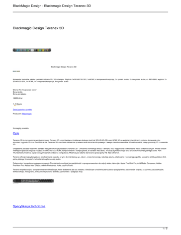 BlackMagic Design : Blackmagic Design Teranex 3D Blackmagic Design Teranex 3D Blackmagic Design Teranex 3D Konwerter formatów, skaler i procesor obrazu 2D, 3D i dźwięku. Wejścia: 2xSD/HD/3G SDI, 1xHDMI,1x komponent/kompozyt, 2x symetr. audio, 2x niesymetr. audio, 4x AES/EBU, wyjścia: 2x SD/HD/3G SDI, 1x HDMI, 1x komponent/kompozyt, 4x symetr. audio Ocena Nie ma jeszcze oceny Cena brutto Cena po rabacie 19850,00 zł Zadaj pytanie o produkt Producent: Blackmagic Szczegóły produktu Opis Teranex 3D to rozszerzona wersja procesora Teranex 2D, umożliwiająca dodatkowo obsługę dual link SD/HD/3G-SDI oraz HDMI 3D na wejściach i wyjściach systemu, konwersję obu strumieni sygnału 3D oraz Dual Link 4:4:4. Teranex 3D umożliwia niezależne przetwarzanie obrazów dla prawego i lewego oka dla materiałów 3D oraz wysokiej klasy symulację 3D z materiału 2D. Urządzenie posiada wszystkie ponadto wszystkie funkcje procesora Teranex 2D - umożliwia konwersję obrazu i dźwięku oraz nagrywanie i odtwarzanie treści audiowizualnych. Wśród swoich interfejsów posiada wejścia i wyjścia: SD/HD/3G-SDI, HDMI, komponentowe i kompozytowe, 8 kanałów AES/EBU, 4 kanały symetrycznego oraz 2 kanały niesymetrycznego audio. Port Thunderbolt umożliwia zapis i odczyt materiału wideo na komputerze. Możliwe jest zdalne sterowanie przez porty RS-422 i ethernet. Teranex oferuje najwyższą jakość przetwarzania sygnału, w tym: de-interlacing, up-, down-, cross-konwersję, redukcję szumu, skalowanie i konwersję aspektu, usuwanie efektu pulldown 3:2, pełną obsługę timecode'u i wielokanałową konwersję audio. Połączenie z komputerem przy pomocu portu Thunderbolt umożliwia kompatybilność z oprogramowaniem do edycji wideo, takim jak: Apple Final Cut Pro, Avid Media Composer, Adobe Premiere Pro, Adobe After Effects, Adobe Photoshop, Nuke, czy ProTools. Teranex współpracuje z oprogramowaniem UltraScope, które dodawane jest do zestawu. UltraScope umożliwia jednoczesny podgląd wielu parametrów sygnału za pomocą oscyloskopów, wektoroskopu. histogramu, wskaźników poziomu dźwięku, goniometru i podglądu wizji. Specyfikacja techniczna 1/3 BlackMagic Design : Blackmagic Design Teranex 3D Wejścia SDI Wyjście SDI Loop Wyjście SDI 2x 10-bitowe przełączalne: SD, HD, 3G, 2K. Działające jako dual-link Hd-SDI przy 4:2:2 lub 4:4:4 lub 3Gb/s przy HD-SDI 4:4:4 lub 2K. Również działające jako 3D HD-SDI. 1x reclocked 2x 10-bitowe przełączalne: SD, HD, 3G, 2K. Działające jako dual-link Hd-SDI przy 4:2:2 lub 4:4:4 lub 3Gb/s przy HD-SDI 4:4:4 lub 2K. Również działające jako 3D HD-SDI. Analogowe wejścia wideo 1x komponentowe YUV na złączach BNC, przełączalne na kompozytowe. Komponent obsługuje SD i HD Analogowe wyjścia wideo 1x komponentowe YUV na złączach BNC, przełączalne na kompozytowe. Komponent obsługuje SD i HD Wejście HDMI 1x typ A, obsługa 3D frame packing Wyjście HDMI 1x typ A, obsługa 3D frame packing Wejścia analogowego audio 2 kanały profesjonalnego symetrycznego audio na złączach XLR (to samo wejście co AES/EBU) 2x niesymetryczne na złączach RCA Wyjścia analogowego audio 2 kanały profesjonalnego symetrycznego audio na złączach XLR (to samo wejście co AES/EBU) Wejścia audio AES/EBU 4 kanały profesjonalnego symetrycznego audio AES/EBU na złączach XLR (te same złącza co wejście analogowe) Wyjścia audio AES/EBU 4 kanały profesjonalnego symetrycznego audio AES/EBU na złączach XLR (te same złącza co wejście analogowe) Wejścia SDI audio 16 kanałów w SH, HD i 2K (16 kanałów w HD i 2K, 8 kanałów w SD przy odtwarzaniu przez Thunderbolt) Wyjścia SDI audio 16 kanałów w SH, HD i 2K (16 kanałów w HD i 2K, 8 kanałów w SD przy odtwarzaniu przez Thunderbolt) Wejścia audio HDMI 8 kanałów Wyjścia audio HDMI 8 kanałów Wbudowana obsługa Dolby Dolby E/AC-3 pass through Opcjonalna obsluga Dolby Obsluga Dolby E/AC-3 w konwersji framerate'u z opcjonalnymi modułami enkodowania i dekodowania Dolby E/AC-3. Metadane Dolby przy użyciu RS-485. Wejście timecode 1x XLR Wyjście timecode Sterowanie 1x XLR RS-422 kompatybilne z systemem Sony English The Blackmagic-Design Teranex 3D Processor is an advanced-quality standards converter as well as video format converter and capture and playback device all-in-one. As a standards converter, it can convert from most any television format to any other television format in the highest quality. Conversions are indistinguishable from the original master. And as for capture/playback functionality, the Teranex can simultaneously convert formats and -- via Thunderbolt -- capture files into a computer for editing. With advanced 3D processing, conversion, simulation and camera align tools, Teranex 3D can deliver full resolution dual channel 3D format and frame-rate conversions and it can convert 2D content into 3D. What makes Teranex so good is an advanced SIMD technology--developed and patented by Teranex--that allows instant calculations on thousands of pixels simultaneously in X, Y positions and between video frames. Processing is applied within the frame and between frames all at the same time, delivering better de-interlacing, inter-frame interpolation and noise reduction. 2/3 BlackMagic Design : Blackmagic Design Teranex 3D Overall, the processor features extremely high-quality de-interlacing, up and down conversion, SD and HD cross conversion, SD and HD standards conversion, automatic cadence detection and removal (even with edited content), noise reduction, adjustable scaling, aspect ratio conversion, and timecode conversion; and accompanying all the video conversion functionality is 16 channel audio conversion capacity. Standards conversions can actually also be employed for reasons other than the general need to convert. Conversions can be performed simply to protect equipment such as decks, switchers, transmitters and encoders from standards they don't support. And as far as non-general uses g
